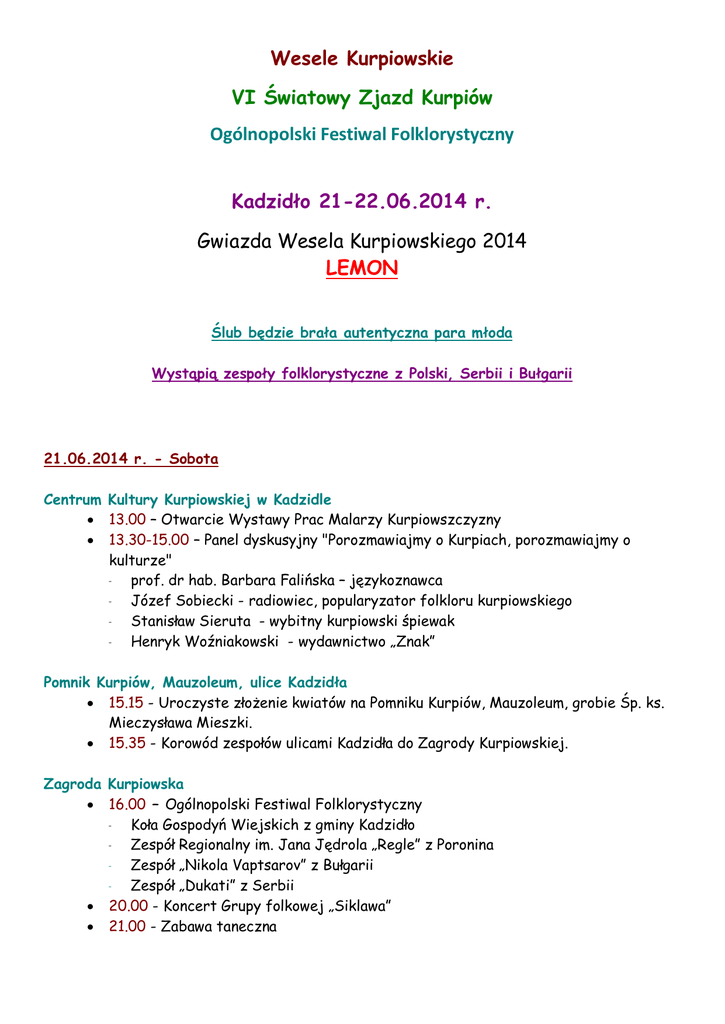 Wesele Kurpiowskie VI wiatowy Zjazd Kurpiów Ogólnopolski Festiwal Folklorystyczny Kadzid o 21-22.06.2014 r. Gwiazda Wesela Kurpiowskiego 2014 LEMON lub b dzie bra a autentyczna para m oda Wyst pi zespo y folklorystyczne z Polski, Serbii i Bu garii 21.06.2014 r. - Sobota Centrum Kultury Kurpiowskiej w Kadzidle 13.00 – Otwarcie Wystawy Prac Malarzy Kurpiowszczyzny 13.30-15.00 – Panel dyskusyjny "Porozmawiajmy o Kurpiach, porozmawiajmy o kulturze" – prof. dr hab. Barbara Fali ska – j zykoznawca – Józef Sobiecki - radiowiec, popularyzator folkloru kurpiowskiego – Stanis aw Sieruta - wybitny kurpiowski piewak – Henryk Wo niakowski - wydawnictwo „Znak” Pomnik Kurpiów, Mauzoleum, ulice Kadzid a 15.15 - Uroczyste z enie kwiatów na Pomniku Kurpiów, Mauzoleum, grobie p. ks. Mieczys awa Mieszki. 15.35 - Korowód zespo ów ulicami Kadzid a do Zagrody Kurpiowskiej. Zagroda Kurpiowska 16.00 – Ogólnopolski Festiwal Folklorystyczny – Ko a Gospody Wiejskich z gminy Kadzid o – Zespó Regionalny im. Jana J drola „Regle” z Poronina – Zespó „Nikola Vaptsarov” z Bu garii – Zespó „Dukati” z Serbii 20.00 - Koncert Grupy folkowej „Siklawa” 21.00 - Zabawa taneczna 22.06.2014 r. - Niedziela Urz d Gminy w Kadzidle 09.00 – Uroczysta sesja Rady Gminy w Kadzidle po czona z nadaniem tytu ów Honorowego Obywatela Gminy Kadzid o. Zagroda Kurpiowska, ulice Kadzid a 11.00 – Wesele Kurpiowskie - Wybiór do lubu - widowisko w wykonaniu Zespo u Folklorystycznego "Kurpianka-Cepelia" z Kadzid a. Ko ció Parafialny w Kadzidle, ulice Kadzid a 12.00 – Msza wi ta oraz lub autentycznej pary kurpiowskiej Natalii nietki (panny z Wachu i Dominika Nalewajka kawalera z Olszyn) w Ko ciele Parafialnym w Kadzidle w oprawie kurpiowskiej. 13.00 – Korowód weselny ulicami Kadzid a. Zagroda Kurpiowska w Kadzidle 13.30 – Przywitanie Go ci przez wójta Dariusza ukaszewskiego; Uroczyste wr czanie Nepomuków wraz z tytu em Honorowego Obywatela Gminy Kadzid o oraz nagród okoliczno ciowych dla artystów kurpiowskich 14.00 - Wesele Kurpiowskie - Powrót od lubu 15.30 – Koncert Galowy Ogólnopolskiego Festiwalu Folklorystycznego – Zespó Regionalny im. Jana J drola „Regle” z Poronina – Zespó "Nikola Vaptsarov” z Bu garii – Zespó „Dukati” z Serbii 20.00 - LEMON – Gwiazda Wesela Kurpiowskiego Stawki placowego na Weselu Kurpiowskim, VI wiatowym Zje dzie Kurpiów, Ogólnopolskim Festiwalu Folklorystycznym 21 czerwca 2014 r. (sobota) Lp. 1. 2. 3. 4. NAZWA Stoisko gastronomiczne z pod czeniem pr dowym (stoisko do 3 m d ugo ci) Stoisko gastronomiczne bez pr du (stoisko do 3 m d ugo ci) Lody (stoisko do 3 m d ugo ci) Wata cukrowa, popcorn (stoisko do 3 m d ugo ci) CENA BRUTTO 150 z 100 z 50 z 50 z 5. 6. 7. Zabawki (stoisko do 3 m d ugo ci) Inne (stoisko do 3 m d ugo ci) Wjazd samochodu z towarem 50 z 50 z 50 z Stawki placowego na Weselu Kurpiowskim, VI wiatowym Zje dzie Kurpiów, Ogólnopolskim Festiwalu Folklorystycznym 22 czerwca 2014 r. (niedziela) Lp. 1. 2. 3. 4. 5. 6. 7. NAZWA Stoisko gastronomiczne z pod czeniem do pr du (stoisko do 3 m d ugo ci) Stoisko gastronomiczne bez pr du (stoisko do 3 m d ugo ci) Lody (stoisko do 3 m d ugo ci) Wata cukrowa, popcorn (stoisko do 3 m d ugo ci) Zabawki (stoisko do 3 m d ugo ci) Inne (stoisko do 3 m d ugo ci) Wjazd samochodu z towarem CENA BRUTTO 400 z 250 z 200 z 200 z 200 z 200 z 350 z Wp at prosimy dokona do 13 czerwca 2014 r. na konto: Bank Spó dzielczy w Kadzidle Nr konta: 19 8916 0002 0000 0071 2000 0010 z dopiskiem: Wesele Kurpiowskie 2014. Wp aty dokonywane w dniu Wesela s wy sze o 50 z . WI CEJ INFORMACJI POD NUMEREM TELEFONU: (29) 761.80.26