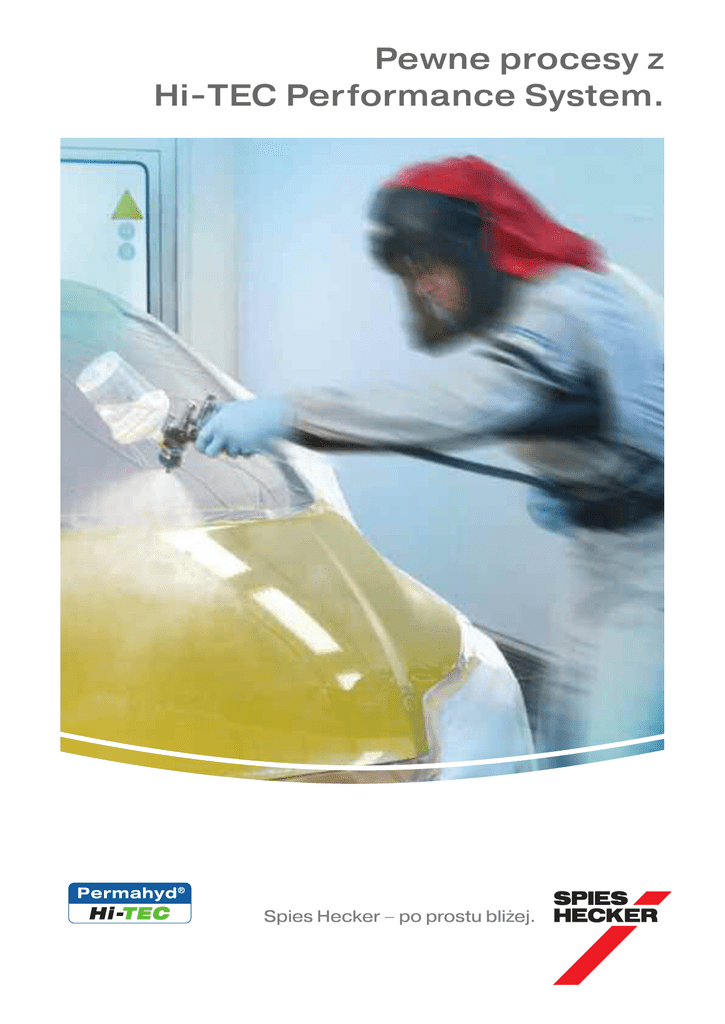 Pewne procesy z Hi-TEC Performance System. Spies Hecker – po prostu bliżej. Łatwy, praktyczny i niezawodny. Lakiernik musi móc polegać na produktach lakierniczych. Powinny one być proste w aplikacji i zapewniać efektywność pracy. Czego należy oczekiwać od systemu lakierniczego. Niezawodne wyniki. Lakier bazowy zapewnia wysokie krycie i doskonałe dopasowanie kolorystyczne. Sprawdzone, wysokiej jakości technologie zapewniają idealne rezultaty, które każdy lakiernik może z łatwością osiągnąć. Łatwość użycia. Pełny, zintegrowany i łatwy w użyciu system produktowy, który składa się z podkładu, lakieru bazowego i lakieru bezbarwnego. Dlatego wady lakiernicze są ograniczone do minimum. Przepustowość i elastyczna aplikacja lakieru. Dzięki łatwości szlifowania, szybkiej aplikacji lakieru oraz błyskawicznemu suszeniu, nie traci się czasu na przestoje, a przepustowość lakierni ulega poprawie. Lakier bezbarwny może być aplikowany na 1,5 lub 2 warstwy, zgodnie z instrukcją. System Hi-TEC. Solidna podstawa. Lakier bazowy z ogromnym potencjałem. Podkład Permasolid® HS Performance 5320. Lakier bazowy Permahyd® Hi-TEC 480. • Bardzo łatwa aplikacja • Dobra absorpcja, dzięki czemu po wyschnięciu powierzchnia jest gładka • Bardzo dobra stabilność • Wspaniałe właściwości szlifowania • Podkład dostępny w kolorze białym, szarym i czarnym • Dobra wydajność • Doskonały połysk i rozlewność • Szybki i łatwy w aplikacji • Niezawodne wyniki dzięki prawidłowemu ułożeniu ziarna • Doskonała siła krycia, wysoka dokładność koloru • Krótkie czasy procesu • Łatwe i niezawodne cieniowanie • Większa elastyczność w lakierowaniu wnętrz, aplikacji wielowarstwowej i wielokolorowej System zapewniający niezawodność i bardziej efektywne procesy. Wysoka wydajność. Marka Spies Hecker zapewnia zarówno wsparcie techniczne w zakresie systemów produktowych, jak też doradza lakierniom w optymalizacji procesów – mając zawsze na względzie znakomite wyniki biznesowe. Szybkość. Szybki i łatwy sposób doboru koloru: najbardziej efektywne narzędzia identyfikacji koloru oraz ułatwienie całego procesu doboru koloru. Umiejętności. Kadra jest najcenniejszą wartością. Dlatego szkolenia w warsztatach i/lub w Centrum Szkoleniowym oferują szeroką gamę zagadnień: od tematu gruntów w technologii lakierniczej po nowoczesne zarządzanie kolorem. Dla uniwersalnej i elastycznej aplikacji. Lakier bezbarwny Permasolid® HS 8055. • Idealny dla każdego rodzaju napraw • Łatwa i niezawodna aplikacja • Elastyczny w aplikacji. Dla napraw standardowych, np. błotniki, drzwi lub napraw częściowych, aplikowany w jednym cyklu (= 1,5 warstwy). Alternatywnie, dla doskonałej grubości powłoki, np. naprawy całościowej, aplikacja w 2 warstwach. • Dobra grubość powłoki i połysk • Łatwy w polerowaniu • Może być mieszany z każdym utwardzaczem VHS i dodatkiem HS 9034. lub Dla najwyższych standardów połączonych z niezawodną aplikacją. Lakier bezbarwny Permasolid® HS Optimum Plus 8034. • Idealny dla każdego rodzaju napraw oraz renowacji designerskich i napraw całościowych na specjalne życzenie • Elastyczny w aplikacji. 2 warstwy dla najwyższych standardów, np. dla lakierowań całościowych lub maski. Aplikacja w 1 cyklu (= 1,5 warstwy) dla standardowych napraw korzystnych kosztowo. • Dobra stabilność, daje lakiernikowi poczucie pewności podczas aplikacji • Dobra grubość powłoki i połysk • Łatwy w polerowaniu • Może być mieszany z każdym utwardzaczem VHS i dodatkiem HS 9034. Hi-TEC Performance System odpowiedzią na wszystkie codzienne potrzeby warsztatu … … oraz na wyzwania specjalne. ems-p.com © Spies Hecker GmbH 09/2012 DuPont Poland Sp. z o.o. ul. Postępu 17B 02-676 Warszawa