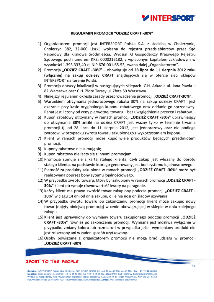 REGULAMIN PROMOCJI “ODZIEŻ CRAFT -30%” 1) Organizatorem promocji jest INTERSPORT Polska S.A. z siedzibą w Cholerzynie, Cholerzyn 382, 32-060 Liszki, wpisana do rejestru przedsiębiorców przez Sąd Rejonowy dla Krakowa Śródmieścia, Wydział XI Gospodarczy Krajowego Rejestru Sądowego pod numerem KRS: 0000216182, z wpłaconym kapitałem zakładowym w wysokości 1.393.333,40 zł, NIP 676-001-65-53, zwana dalej „Organizatorem”. 2) Promocja „ODZIEŻ CRAFT -30%” – obowiązuje od 28 lipca do 11 sierpnia 2012 roku (włącznie) na zakup odzieży CRAFT znajdujących się w ofercie sieci sklepów INTERSPORT na terenie Polski. 3) Promocja dotyczy lokalizacji w następujących sklepach: C.H. Arkadia al. Jana Pawła II 82 Warszawa oraz C.H. Złote Tarasy ul. Złota 59 Warszawa. 4) Niniejszy regulamin określa zasady przeprowadzenia promocji „ODZIEŻ CRAFT-30%”. 5) Warunkiem otrzymania jednorazowego rabatu 30% na zakup odzieży CRAFT jest okazanie przy kasie oryginalnego kuponu rabatowego oraz oddanie go sprzedawcy. Rabat jest liczony od ceny pierwotnej towaru – bez uwzględnienia przecen i rabatów. 6) Kupon rabatowy otrzymany w ramach promocji „ODZIEŻ CRAFT -30%” uprawniający do otrzymania 30% zniżki na odzież CRAFT jest ważny tylko w terminie trwania promocji tj. od 28 lipca do 11 sierpnia 2012, jest jednorazowy oraz nie podlega zwrotowi w przypadku zwrotu towaru zakupionego z wykorzystaniem kuponu. 7) Klient w ramach promocji może kupid wiele produktów będących przedmiotem promocji. 8) Kupony rabatowe nie sumują się. 9) Kupon rabatowy nie łączy się z innymi promocjami. 10) Promocja sumuje się z kartą stałego klienta, czyli zakup jest wliczany do obrotu stałego klienta, na podstawie którego generowany jest bon systemu lojalnościowego. 11) Płatnośd za produkty zakupione w ramach promocji „ODZIEŻ CRAFT -30%” może byd realizowana poprzez bony sytemu lojalnościowego. 12) W przypadku zwrotu towaru, który był zakupiony w ramach promocji „ODZIEŻ CRAFT 30%” klient otrzymuje równowartośd kwoty na paragonie. 13) Każdy klient ma prawo zwrócid towar zakupiony podczas promocji „ODZIEŻ CRAFT 30%” w ciągu 14 dni od dnia zakupu, o ile nie nosi on śladów używania. 14) W przypadku zwrotu towaru po zakooczeniu promocji klient może zakupid nowy towar (objęty niniejszą promocją) w cenie obowiązującej w sklepie w dniu kolejnego zakupu. 15) Klient jest uprawniony do wymiany towaru zakupionego podczas promocji „ODZIEŻ CRAFT -30%” również po zakooczeniu promocji. Wymiana jest możliwa wyłącznie w przypadku zmiany koloru lub rozmiaru i w przypadku jeżeli wymieniany produkt nie jest zniszczony ani w żaden sposób użytkowany. 16) Osoby powiązane z organizatorem promocji nie mogą brad udziału w promocji „ODZIEŻ CRAFT -30% 1/2 Siedziba: INTERSPORT Polska S.A. Cholerzyn 382, 32-060 LISZKI, tel: +48 12 44 48 100, 44 48 103, fax: +48 12 44 48 000, Magazyn: adres dostaw j.w. oraz tel: +48 12 44 48 853, fax: +48 12 44 48 850. Dane firmy: Sąd Rejonowy dla Krakowa Śródmieścia Wydział XI Gospodarczy KRS 0000216182, Wpłacony kapitał zakładowy 1.393.333,40 zł; Regon 003900187, NIP 676-001-65-53, PEKAO Bank Pekao SA 48124047221111000048552358, www.intersport.pl. Zarząd: Artur Mikołajko, Sławomir Gil 17) Wszelkie zapytania związane z promocją powinny byd kierowane na adres [email protected] lub [email protected] 2/2 Siedziba: INTERSPORT Polska S.A. Cholerzyn 382, 32-060 LISZKI, tel: +48 12 44 48 100, 44 48 103, fax: +48 12 44 48 000, Magazyn: adres dostaw j.w. oraz tel: +48 12 44 48 853, fax: +48 12 44 48 850. Dane firmy: Sąd Rejonowy dla Krakowa Śródmieścia Wydział XI Gospodarczy KRS 0000216182, Wpłacony kapitał zakładowy 1.393.333,40 zł; Regon 003900187, NIP 676-001-65-53, PEKAO Bank Pekao SA 48124047221111000048552358, www.intersport.pl. Zarząd: Artur Mikołajko, Sławomir Gil