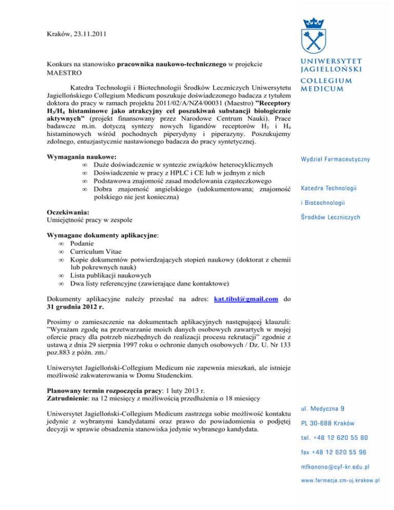 Kraków, 23.11.2011 Konkurs na stanowisko pracownika naukowo-technicznego w projekcie MAESTRO Katedra Technologii i Biotechnologii Środków Leczniczych Uniwersytetu Jagiellońskiego Collegium Medicum poszukuje doświadczonego badacza z tytułem doktora do pracy w ramach projektu 2011/02/A/NZ4/00031 (Maestro) ”Receptory H3/H4 histaminowe jako atrakcyjny cel poszukiwań substancji biologicznie aktywnych” (projekt finansowany przez Narodowe Centrum Nauki). Prace badawcze m.in. dotyczą syntezy nowych ligandów receptorów H3 i H4 histaminowych wśród pochodnych piperydyny i piperazyny. Poszukujemy zdolnego, entuzjastycznie nastawionego badacza do pracy syntetycznej. Wymagania naukowe: • Duże doświadczenie w syntezie związków heterocyklicznych • Doświadczenie w pracy z HPLC i CE lub w jednym z nich • Podstawowa znajomość zasad modelowania cząsteczkowego • Dobra znajomość angielskiego (udokumentowana; znajomość polskiego nie jest konieczna) Oczekiwania: Umiejętność pracy w zespole Wymagane dokumenty aplikacyjne: • Podanie • Curriculum Vitae • Kopie dokumentów potwierdzających stopień naukowy (doktorat z chemii lub pokrewnych nauk) • Lista publikacji naukowych • Dwa listy referencyjne (zawierające dane kontaktowe) Dokumenty aplikacyjne należy przesłać na adres: [email protected] do 31 grudnia 2012 r. Prosimy o zamieszczenie na dokumentach aplikacyjnych następującej klauzuli: ”Wyrażam zgodę na przetwarzanie moich danych osobowych zawartych w mojej ofercie pracy dla potrzeb niezbędnych do realizacji procesu rekrutacji” zgodnie z ustawą z dnia 29 sierpnia 1997 roku o ochronie danych osobowych / Dz. U. Nr 133 poz.883 z późn. zm./ Uniwersytet Jagielloński-Collegium Medicum nie zapewnia mieszkań, ale istnieje możliwość zakwaterowania w Domu Studenckim. Planowany termin rozpoczęcia pracy: 1 luty 2013 r. Zatrudnienie: na 12 miesięcy z możliwością przedłużenia o 18 miesięcy Uniwersytet Jagielloński-Collegium Medicum zastrzega sobie możliwość kontaktu jedynie z wybranymi kandydatami oraz prawo do powiadomienia o podjętej decyzji w sprawie obsadzenia stanowiska jedynie wybranego kandydata.