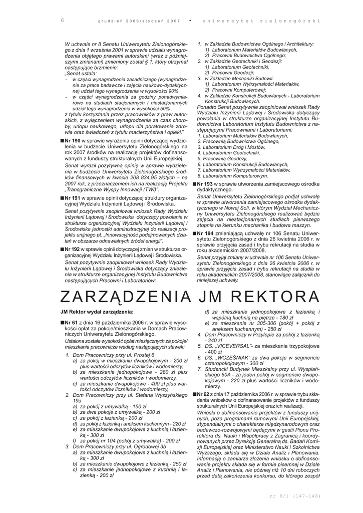 6 grudzień 2006/styczeń W uchwale nr 8 Senatu Uniwersytetu Zielonogórskiego z dnia 1 września 2001 w sprawie udziału wynagrodzenia objętego prawami autorskimi (wraz z późniejszymi zmianami) zmieniony został § 1, który otrzymał następujące brzmienie: „Senat ustala: - uniwersytet 2007 w części wynagrodzenia zasadniczego (wynagrodzenie za prace badawcze i zajęcia naukowo-dydaktyczne) udział tego wynagrodzenia w wysokości 90% w części wynagrodzenia za godziny ponadwymiarowe na studiach stacjonarnych i niestacjonarnych udział tego wynagrodzenia w wysokości 50% z tytułu korzystania przez pracowników z praw autorskich, z wyłączeniem wynagrodzenia za czas choroby, urlopu naukowego, urlopu dla poratowania zdrowia oraz świadczeń z tytułu macierzyństwa i opieki.” Nr 190 w sprawie wyrażenia opinii dotyczącej wydzie- lenia w budżecie Uniwersytetu Zielonogórskiego na rok 2007 środków na realizację projektów dofinansowanych z funduszy strukturalnych Unii Europejskiej. Senat wyraził pozytywną opinię w sprawie wydzielenia w budżecie Uniwersytetu Zielonogórskiego środków finansowych w kwocie 208 834,95 złotych – na 2007 rok, z przeznaczeniem ich na realizację Projektu „Transgraniczne Wyspy Innowacji (TWI)”. Nr 191 w sprawie opinii dotyczącej struktury organiza- cyjnej Wydziału Inżynierii Lądowej i Środowiska. Senat pozytywnie zaopiniował wniosek Rady Wydziału Inżynierii Lądowej i Środowiska dotyczący powołania w strukturze organizacyjnej Wydziału Inżynierii Lądowej i Środowiska jednostki administracyjnej do realizacji projektu unijnego pt. „Innowacyjność podejmowanych działań w obszarze odnawialnych źródeł energii”. Nr 192 w sprawie opinii dotyczącej zmian w strukturze or- ganizacyjnej Wydziału Inżynierii Lądowej i Środowiska. Senat pozytywnie zaopiniował wniosek Rady Wydziału Inżynierii Lądowej i Środowiska dotyczący zniesienia w strukturze organizacyjnej Instytutu Budownictwa następujących Pracowni i Laboratoriów: zielonogórski 1. w Zakładzie Budownictwa Ogólnego i Architektury: 1) Laboratorium Materiałów Budowlanych, 2) Pracowni Budownictwa Ogólnego; 2. w Zakładzie Geotechniki i Geodezji: 1) Laboratorium Geotechniki, 2) Pracowni Geodezji; 3. w Zakładzie Mechaniki Budowli: 1) Laboratorium Wytrzymałości Materiałów, 2) Pracowni Komputerowej; 4. w Zakładzie Konstrukcji Budowlanych - Laboratorium Konstrukcji Budowlanych. Ponadto Senat pozytywnie zaopiniował wniosek Rady Wydziału Inżynierii Lądowej i Środowiska dotyczący powołania w strukturze organizacyjnej Instytutu Budownictwa Laboratorium Instytutu Budownictwa z następującymi Pracowniami i Laboratoriami: 1. Laboratorium Materiałów Budowlanych, 2. Pracownią Budownictwa Ogólnego, 3. Laboratorium Dróg i Mostów, 4. Laboratorium Geotechniki, 5. Pracownią Geodezji, 6. Laboratorium Konstrukcji Budowlanych, 7. Laboratorium Wytrzymałości Materiałów, 8. Laboratorium Komputerowym. Nr 193 w sprawie utworzenia zamiejscowego ośrodka dydaktycznego. Senat Uniwersytetu Zielonogórskiego podjął uchwałę w sprawie utworzenia zamiejscowego ośrodka dydaktycznego w Nowej Soli, w którym Wydział Mechaniczny Uniwersytetu Zielonogórskiego realizować będzie zajęcia na niestacjonarnych studiach pierwszego stopnia na kierunku mechanika i budowa maszyn. Nr 194 zmieniającą uchwałę nr 106 Senatu Uniwer- sytetu Zielonogórskiego z dnia 26 kwietnia 2006 r. w sprawie przyjęcia zasad i trybu rekrutacji na studia w roku akademickim 2007/2008. Senat przyjął zmiany w uchwale nr 106 Senatu Uniwersytetu Zielonogórskiego z dnia 26 kwietnia 2006 r. w sprawie przyjęcia zasad i trybu rekrutacji na studia w roku akademickim 2007/2008, stanowiące załącznik do niniejszej uchwały. ZARZĄDZENIA JM REKTORA JM Rektor wydał zarządzenia: Nr 61 z dnia 16 października 2006 r. w sprawie wysokości opłat za pokoje/mieszkania w Domach Pracowniczych Uniwersytetu Zielonogórskiego. Ustalona została wysokość opłat miesięcznych za pokoje/ mieszkania pracownicze według następujących stawek: 1. Dom Pracowniczy przy ul. Prostej 6 a) za pokój w mieszkaniu dwupokojowym - 200 zł plus wartości odczytów liczników i wodomierzy, b) za mieszkanie jednopokojowe - 280 zł plus wartości odczytów liczników i wodomierzy, c) za mieszkanie dwupokojowe - 400 zł plus wartości odczytów liczników i wodomierzy, 2. Dom Pracowniczy przy ul. Stefana Wyszyńskiego 19a a) za pokój z umywalką - 150 zł b) za dwa pokoje z umywalką - 200 zł c) za pokój z łazienką - 200 zł d) za pokój z łazienką i aneksem kuchennym - 220 zł e) za mieszkanie dwupokojowe z kuchnią i łazienką - 300 zł f) za pokój nr 104 (pokój z umywalką) - 200 zł 3. Dom Pracowniczy przy ul. Ogrodowej 3b a) za mieszkanie dwupokojowe z kuchnią i łazienką - 300 zł b) za mieszkanie dwupokojowe z łazienką - 250 zł c) za mieszkanie jednopokojowe z kuchnią i łazienką - 200 zł 4. 5. 6. 7. d) za mieszkanie jednopokojowe z łazienką i wspólną kuchnią na piętrze - 180 zł e) za mieszkanie nr 305-306 (pokój + pokój z aneksem kuchennym) - 250 zł Dom Pracowniczy w Przylepie za pokój z łazienką - 240 zł DS. „VICEVERSAL”- za mieszkanie trzypokojowe - 400 zł DS. „WCZEŚNIAK” za dwa pokoje w segmencie czteropokojowym - 300 zł Studencki Budynek Mieszkalny przy ul. Wyspiańskiego 60A - za jeden pokój w segmencie dwupokojowym - 220 zł plus wartości liczników i wodomierzy. Nr 62 z dnia 17 października 2006 r. w sprawie trybu składania wniosków o dofinansowanie projektów z funduszy strukturalnych Unii Europejskiej oraz ich realizacji. Wnioski o dofinansowanie projektów z funduszy unijnych, poza programami ramowymi Unii Europejskiej, stypendialnymi o charakterze międzynarodowym oraz badawczo-rozwojowymi będącymi w gestii Pionu Prorektora ds. Nauki i Współpracy z Zagranicą i koordynowanych przez Dyrekcję Generalną ds. Badań Komisji Europejskiej oraz Ministerstw