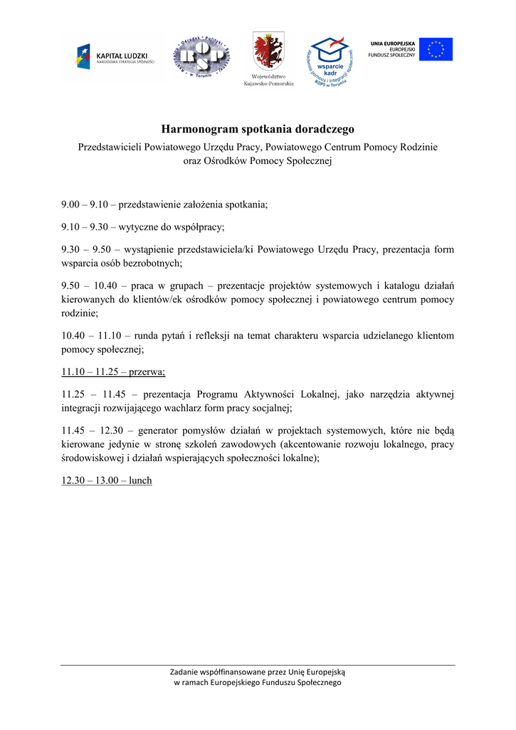 Harmonogram spotkania doradczego Przedstawicieli Powiatowego Urzędu Pracy, Powiatowego Centrum Pomocy Rodzinie oraz Ośrodków Pomocy Społecznej 9.00 – 9.10 – przedstawienie załoŜenia spotkania; 9.10 – 9.30 – wytyczne do współpracy; 9.30 – 9.50 – wystąpienie przedstawiciela/ki Powiatowego Urzędu Pracy, prezentacja form wsparcia osób bezrobotnych; 9.50 – 10.40 – praca w grupach – prezentacje projektów systemowych i katalogu działań kierowanych do klientów/ek ośrodków pomocy społecznej i powiatowego centrum pomocy rodzinie; 10.40 – 11.10 – runda pytań i refleksji na temat charakteru wsparcia udzielanego klientom pomocy społecznej; 11.10 – 11.25 – przerwa; 11.25 – 11.45 – prezentacja Programu Aktywności Lokalnej, jako narzędzia aktywnej integracji rozwijającego wachlarz form pracy socjalnej; 11.45 – 12.30 – generator pomysłów działań w projektach systemowych, które nie będą kierowane jedynie w stronę szkoleń zawodowych (akcentowanie rozwoju lokalnego, pracy środowiskowej i działań wspierających społeczności lokalne); 12.30 – 13.00 – lunch Zadanie współfinansowane przez Unię Europejską w ramach Europejskiego Funduszu Społecznego