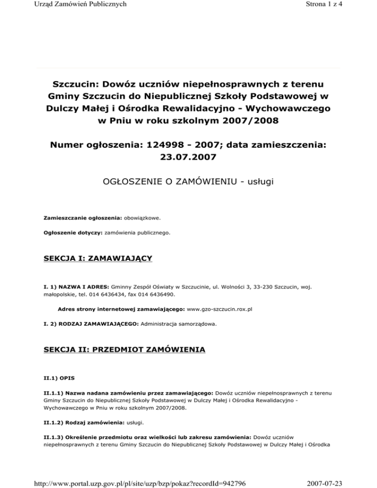 Urząd Zamówień Publicznych Strona 1 z 4 Szczucin: Dowóz uczniów niepełnosprawnych z terenu Gminy Szczucin do Niepublicznej Szkoły Podstawowej w Dulczy Małej i Ośrodka Rewalidacyjno - Wychowawczego w Pniu w roku szkolnym 2007/2008 Numer ogłoszenia: 124998 - 2007; data zamieszczenia: 23.07.2007 OGŁOSZENIE O ZAMÓWIENIU - usługi Zamieszczanie ogłoszenia: obowiązkowe. Ogłoszenie dotyczy: zamówienia publicznego. SEKCJA I: ZAMAWIAJĄCY I. 1) NAZWA I ADRES: Gminny Zespół Oświaty w Szczucinie, ul. Wolności 3, 33-230 Szczucin, woj. małopolskie, tel. 014 6436434, fax 014 6436490. Adres strony internetowej zamawiającego: www.gzo-szczucin.rox.pl I. 2) RODZAJ ZAMAWIAJĄCEGO: Administracja samorządowa. SEKCJA II: PRZEDMIOT ZAMÓWIENIA II.1) OPIS II.1.1) Nazwa nadana zamówieniu przez zamawiającego: Dowóz uczniów niepełnosprawnych z terenu Gminy Szczucin do Niepublicznej Szkoły Podstawowej w Dulczy Małej i Ośrodka Rewalidacyjno Wychowawczego w Pniu w roku szkolnym 2007/2008. II.1.2) Rodzaj zamówienia: usługi. II.1.3) Określenie przedmiotu oraz wielkości lub zakresu zamówienia: Dowóz uczniów niepełnosprawnych z terenu Gminy Szczucin do Niepublicznej Szkoły Podstawowej w Dulczy Małej i Ośrodka http://www.portal.uzp.gov.pl/pl/site/uzp/bzp/pokaz?recordId=942796 2007-07-23 Urząd Zamówień Publicznych Strona 2 z 4 Rewalidacyjno - Wychowawczego w Pniu w roku szkolnym 2007/2008, ilość dowożonych uczniów: do SP Dulcza Mała - 8, do ORW Pień - 5 II.1.4) Wspólny Słownik Zamówień (CPV): 60.11.34.00-7. II.1.5) Czy dopuszcza się złożenie oferty częściowej: Nie. II.1.6) Czy dopuszcza się złożenie oferty wariantowej: Nie. II.2) CZAS TRWANIA ZAMÓWIENIA LUB TERMIN WYKONANIA: okres w miesiącach: 11. SEKCJA III: INFORMACJE O CHARAKTERZE PRAWNYM, EKONOMICZNYM, FINANSOWYM I TECHNICZNYM III.1) WARUNKI DOTYCZĄCE ZAMÓWIENIA III.2) WARUNKI UDZIAŁU Opis warunków udziału w postępowaniu oraz opis sposobu dokonywania oceny spełniania tych warunków: 1. O udzielenie zamówienia mogą ubiegać się wykonawcy , którzy spełnią następujące warunki: 1.Nie podlegają wykluczeniu z postępowania o udzielenie zamówień zgodnie z art. 24 Pzp. 2.posiadają uprawnienia do wykonywania określonej działalności lub czynności , jeżeli ustawy nakładają obowiązek posiadania takich uprawnień. 3.Dysponują osobami zdolnymi do wykonania zamówienia - minimum 2 kierowców posiadających prawo jazdy i świadectwo kwalifikacyjne wymagane prawem do kierowania pojazdami wyszczególnionymi w ofercie; 4.znajdują się w sytuacji ekonomicznej i finansowej zapewniającej wykonanie zamówienia . 5.dysponują potencjałem sprzętowym - minimum 2 busy po 18 miejsc siedzących każdy;. 6.wniosą wadium w kwocie - nie wymagane 7.posiadają doświadczenie w realizacji zamówienia 8.zawrą umowę na wykonanie przedmiotu zamówienia na zasadach określonych w projekcie umowy. 2. Ocena spełniania warunków w postępowaniu o zamówienie publiczne: Zamawiający odrzuca ofertę, która: jest niezgodna z ustawą jej treść nie odpowiada treści specyfikacji istotnych warunków zamówienia jej złożenie stanowi czyn nieuczciwej konkurencji w rozumieniu przepisów o zwalczaniu nieuczciwej konkurencji zawiera rażąco niską cenę w stosunku do przedmiotu zamówienia została złożona przez wykonawcę wykluczonego z udziału w postępowaniu o udzielenie zamówienia zawiera omyłki rachunkowe w obliczeniu ceny , których nie można poprawić na podstawie art.88, lub błędy w obliczeniu ceny w terminie 7 dni od dnia otrzymania zawiadomienia Wykonawca nie zgodził się na poprawienie omyłki w obliczeniu ceny jest nieważna na podstawie odrębnych przepisów Informacja o oświadczeniach i dokumentach, jakie mają dostarczyć wykonawcy w celu potwierdzenia spełniania warunków udziału w postępowaniu: W celu potwierdzenia , że wykonawca posiada uprawnienia do wykonywania określonej działalności lub czynności oraz nie podlega wykluczeniu na podstawie art.24 ustawy z dnia 29 stycznia 2004r. - Prawo zamówień http://www.portal.uzp.gov.pl/pl/site/uzp/bzp/pokaz?recordId=942796 2007-07-23 Urząd Zamówień Publicznych Strona 3 z 4 publicznych, wykonawca składa następujące dokumenty: 1.Dokumenty wymagane: a)Formularz ofertowy z wykorzystaniem wzoru - załącznik nr 1 do SIWZ b)Dokument potwierdzający wniesienia wadium - nie dotyczy c)Aktualny odpis z właściwego rejestru albo aktualne zaświadczenie o wpisie do ewidencji działalności gospodarczej, jeżeli odrębne przepisy wymagają wpisu do rejestru lub zgłoszenia do ewidencji działalności gospodarczej, wystawione nie wcześniej niż 6 miesięcy przed upływem terminu składania ofert d)Dokumenty potwierdzające uprawnienia osób podpisujących ofertę, o ile nie wynikają z przepisów prawa lub innych dokumentów rejestrowych e)Dokumenty stwierdzające, że osoby, które będą wykonywać zamówienie, posiadają wymagane prawem uprawnienia, jeżeli przepisy nakładają obowiązek posiadania takich uprawnień (dołączyć ksero tych uprawnień do oferty - prawo jazdy, świadectwo kwalifikacji) f)Koncesja, zezwolenie lub licencja , jeżeli ustawy nakładają obowiązek posiadania koncesji, zezwolenia lub licencji na podjęcie działalności gospodarczej w zakresie objętym zamówieniem g)Oświadczenie do postępowania o zamówienie publiczne z art. 22 ust.1 ustawy Prawo zamówień publicznych (zał. Nr 2 do SIWZ) i art. 24 ustawy Pzp (zał. Nr 3 do SIWZ). h)Oświadczenie, że wykonawca nie zalega z opłaceniem podatków lub że uzyskał odroczenie , zwolnienie lub rozłożenie na raty zaległych płatności lub wstrzymanie w całości wykonania decyzji właściwego organu, z wykorzystaniem wzoru - zał. Nr 4 do SIWZ i)Oświadczenie, że wykonawca nie zalega z opłaceniem opłat oraz składek na ubezpieczenie zdrowotne lub społeczne, że uzyskał odroczenie , zwolnienie lub rozłożenie na raty zaległych płatności lub wstrzymanie 