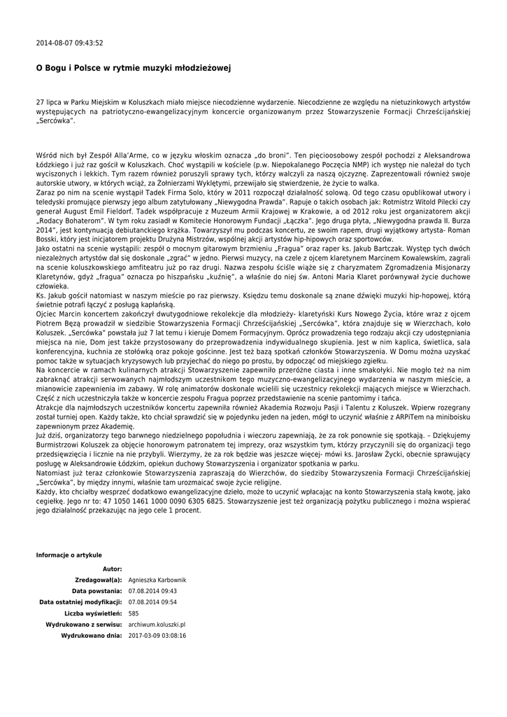 2014-08-07 09:43:52 O Bogu i Polsce w rytmie muzyki młodzieżowej 27 lipca w Parku Miejskim w Koluszkach miało miejsce niecodzienne wydarzenie. Niecodzienne ze względu na nietuzinkowych artystów występujących na patriotyczno-ewangelizacyjnym koncercie organizowanym przez Stowarzyszenie Formacji Chrześcijańskiej „Sercówka”. Wśród nich był Zespół Alla’Arme, co w języku włoskim oznacza „do broni”. Ten pięcioosobowy zespół pochodzi z Aleksandrowa Łódzkiego i już raz gościł w Koluszkach. Choć wystąpili w kościele (p.w. Niepokalanego Poczęcia NMP) ich występ nie należał do tych wyciszonych i lekkich. Tym razem również poruszyli sprawy tych, którzy walczyli za naszą ojczyznę. Zaprezentowali również swoje autorskie utwory, w których wciąż, za Żołnierzami Wyklętymi, przewijało się stwierdzenie, że życie to walka. Zaraz po nim na scenie wystąpił Tadek Firma Solo, który w 2011 rozpoczął działalność solową. Od tego czasu opublikował utwory i teledyski promujące pierwszy jego album zatytułowany „Niewygodna Prawda”. Rapuje o takich osobach jak: Rotmistrz Witold Pilecki czy generał August Emil Fieldorf. Tadek współpracuje z Muzeum Armii Krajowej w Krakowie, a od 2012 roku jest organizatorem akcji „Rodacy Bohaterom”. W tym roku zasiadł w Komitecie Honorowym Fundacji „Łączka”. Jego druga płyta, „Niewygodna prawda II. Burza 2014”, jest kontynuacją debiutanckiego krążka. Towarzyszył mu podczas koncertu, ze swoim rapem, drugi wyjątkowy artysta- Roman Bosski, który jest inicjatorem projektu Drużyna Mistrzów, wspólnej akcji artystów hip-hipowych oraz sportowców. Jako ostatni na scenie wystąpili: zespół o mocnym gitarowym brzmieniu „Fragua” oraz raper ks. Jakub Bartczak. Występ tych dwóch niezależnych artystów dał się doskonale „zgrać” w jedno. Pierwsi muzycy, na czele z ojcem klaretynem Marcinem Kowalewskim, zagrali na scenie koluszkowskiego amfiteatru już po raz drugi. Nazwa zespołu ściśle wiąże się z charyzmatem Zgromadzenia Misjonarzy Klaretynów, gdyż „fragua” oznacza po hiszpańsku „kuźnię”, a właśnie do niej św. Antoni Maria Klaret porównywał życie duchowe człowieka. Ks. Jakub gościł natomiast w naszym mieście po raz pierwszy. Księdzu temu doskonale są znane dźwięki muzyki hip-hopowej, którą świetnie potrafi łączyć z posługą kapłańską. Ojciec Marcin koncertem zakończył dwutygodniowe rekolekcje dla młodzieży- klaretyński Kurs Nowego Życia, które wraz z ojcem Piotrem Bęzą prowadził w siedzibie Stowarzyszenia Formacji Chrześcijańskiej „Sercówka”, która znajduje się w Wierzchach, koło Koluszek. „Sercówka” powstała już 7 lat temu i kieruje Domem Formacyjnym. Oprócz prowadzenia tego rodzaju akcji czy udostępniania miejsca na nie, Dom jest także przystosowany do przeprowadzenia indywidualnego skupienia. Jest w nim kaplica, świetlica, sala konferencyjna, kuchnia ze stołówką oraz pokoje gościnne. Jest też bazą spotkań członków Stowarzyszenia. W Domu można uzyskać pomoc także w sytuacjach kryzysowych lub przyjechać do niego po prostu, by odpocząć od miejskiego zgiełku. Na koncercie w ramach kulinarnych atrakcji Stowarzyszenie zapewniło przeróżne ciasta i inne smakołyki. Nie mogło też na nim zabraknąć atrakcji serwowanych najmłodszym uczestnikom tego muzyczno-ewangelizacyjnego wydarzenia w naszym mieście, a mianowicie zapewnienia im zabawy. W rolę animatorów doskonale wcielili się uczestnicy rekolekcji mających miejsce w Wierzchach. Część z nich uczestniczyła także w koncercie zespołu Fragua poprzez przedstawienie na scenie pantomimy i tańca. Atrakcje dla najmłodszych uczestników koncertu zapewniła również Akademia Rozwoju Pasji i Talentu z Koluszek. Wpierw rozegrany został turniej open. Każdy także, kto chciał sprawdzić się w pojedynku jeden na jeden, mógł to uczynić właśnie z ARPiTem na miniboisku zapewnionym przez Akademię. Już dziś, organizatorzy tego barwnego niedzielnego popołudnia i wieczoru zapewniają, że za rok ponownie się spotkają. – Dziękujemy Burmistrzowi Koluszek za objęcie honorowym patronatem tej imprezy, oraz wszystkim tym, którzy przyczynili się do organizacji tego przedsięwzięcia i licznie na nie przybyli. Wierzymy, że za rok będzie was jeszcze więcej- mówi ks. Jarosław Życki, obecnie sprawujący posługę w Aleksandrowie Łódzkim, opiekun duchowy Stowarzyszenia i organizator spotkania w parku. Natomiast już teraz członkowie Stowarzyszenia zapraszają do Wierzchów, do siedziby Stowarzyszenia Formacji Chrześcijańskiej „Sercówka”, by między innymi, właśnie tam urozmaicać swoje życie religijne. Każdy, kto chciałby wesprzeć dodatkowo ewangelizacyjne dzieło, może to uczynić wpłacając na konto Stowarzyszenia stałą kwotę, jako cegiełkę. Jego nr to: 47 1050 1461 1000 0090 6305 6825. Stowarzyszenie jest też organizacją pożytku publicznego i można wspierać jego działalność przekazując na jego cele 1 procent. Informacje o artykule Autor: Zredagował(a): Agnieszka Karbownik Data powstania: 07.08.2014 09:43 Data ostatniej modyfikacji: 07.08.2014 09:54 Liczba wyświetleń: 585 Wydrukowano z serwisu: archiwum.koluszki.pl Wydrukowano dnia: 2017-03-09 03:08:16
