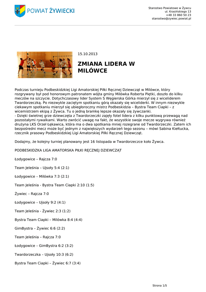 Starostwo Powiatowe w Żywcu ul. Krasińskiego 13 +48 33 860 50 23 [email protected] 15.10.2013 ZMIANA LIDERA W MILÓWCE Podczas turnieju Podbeskidzkiej Ligi Amatorskiej Piłki Ręcznej Dziewcząt w Milówce, który rozgrywany był pod honorowym patronatem wójta gminy Milówka Roberta Piętki, doszło do kilku meczów na szczycie. Dotychczasowy lider System S Węgierska Górka mierzył się z wiceliderem Twardorzeczką. Po niezwykle zaciętym spotkaniu górą okazały się wiceliderki. W innym niezwykle ciekawym spotkaniu mierzył się ubiegłoroczny mistrz Podbeskidzia – Bystra Team Ciapki – z wicemistrzem ekipą z Żywca. Tu o jedną bramkę lepsze okazały się żywczanki. - Dzięki świetnej grze dziewczęta z Twardorzeczki zajęły fotel lidera z kilku punktową przewagą nad pozostałymi rywalkami. Warto zwrócić uwagę na fakt, że wszystkie swoje mecze wygrywa również drużyna LKS Orzeł Łękawica, która ma o dwa spotkania mniej rozegrane od Twardorzeczki. Zatem ich bezpośredni mecz może być jednym z największych wydarzeń tego sezonu – mówi Sabina Kiełtucka, rzecznik prasowy Podbeskidzkiej Ligi Amatorskiej Piłki Ręcznej Dziewcząt. Dodajmy, że kolejny turniej planowany jest 16 listopada w Twardorzeczce koło Żywca. PODBESKIDZKA LIGA AMATORSKA PIŁKI RĘCZNEJ DZIEWCZĄT Łodygowice – Rajcza 7:0 Team Jeleśnia – Ujsoły 5:4 (2:1) Łodygowice – Milówka 7:3 (2:1) Team Jeleśnia - Bystra Team Ciapki 2:10 (1:5) Żywiec – Rajcza 7:0 Łodygowice – Ujsoły 9:2 (4:1) Team Jeleśnia - Żywiec 2:3 (1:2) Bystra Team Ciapki – Milówka 8:4 (4:4) GimBystra – Żywiec 6:6 (2:2) Team Jeleśnia – Rajcza 7:0 Łodygowice – GimBystra 6:2 (3:2) Twardorzeczka – Ujsoły 10:3 (6:2) Bystra Team Ciapki – Żywiec 6:7 (3:4) Strona 1/5 Starostwo Powiatowe w Żywcu ul. Krasińskiego 13 +48 33 860 50 23 [email protected] Koszarawa – Rajcza 7:0 Młoda Koszarawa – GimBystra 0:21 (0:9) Koszarawa – Milówka 1:3 (0:3) Twardorzeczka – Wieprz 6:0 (2:0) Bystra Team Ciapki – System S Węgierska Górka 8:4 (3:2) LKS Orzeł Łękawica – Stowarzyszenie 16 Bielsko-Biała 5:2 (2:0) Świnna – System S Węgierska Górka 0:10 (0:5) Gilowice – Stowarzyszenie 16 Bielsko-Biała 1:8 (1:4) Twardorzeczka – System S Węgierska Górka 2:0 (1:0) Świnna – PTG Sokół w Gminie Czernichów 0:10 (0:5) LKS Orzeł Łękawica – Świnna 8:0 (4:0) Koszarawa – Gilowice 2:6 (1:4) PTG Sokół w Gminie Czernichów – Stowarzyszenie 16 Bielsko-Biała 9:4 (5:1) Twardorzeczka – Ślemień 7:0 LKS Orzeł Łękawica – Wieprz 9:5 (4:1) Ślemień – System S Węgierska Górka 0:7 Młoda Koszarawa – Gilowice 1:7 (0:3) Koszarawa - PTG Sokół w Gminie Czernichów 0:11 (0:3) Gilowice – Wieprz 3:3 (0:0) Ślemień – PTG Sokół w Gminie Czernichów 0:7 1. Twardorzeczka 8 16 47:11 2. Bystra Team Ciapki 8 12 64:26 3. LKS Orzeł Łękawica 6 12 45:13 4. PTG Sokół w Gminie Czernichów 7 11 54:15 5. Łodygowice 7 11 48:18 6. Żywiec 7 11 45:25 7. System S Węgierska Górka 8 10 48:17 8. Gilowice 7 9 28:23 9. Team Jeleśnia 7 8 34:25 10. Koszarawa 8 6 25:29 11. GimBystra 7 5 43:37 12. Milówka 6 4 19:36 13. Ujsoły 7 4 23:43 Strona 2/5 Starostwo Powiatowe w Żywcu ul. Krasińskiego 13 +48 33 860 50 23 [email protected] 14. 15. 16. 17. 18. 19. Świnna 7 4 14:41 Ślemień 7 1 10:31 Wieprz 6 1 13:49 Młoda Koszarawa 5 0 4:47 Stowarzyszenie 16 Bielsko-Biała 7 -2 14:43 Rajcza 7 -7 0:49 Podbeskidzka Liga Amatorska Piłki Ręcznej Dziewcząt rozgrywana jest pod honorowymi patronatami: Związku Piłki Ręcznej w Polsce Śląskiego Związku Piłki Ręcznej w Katowicach Marszałka Województwa Śląskiego Starosty Żywieckiego Andrzeja Zielińskiego Oficjalnymi sponsorami Podbeskidzkiej Ligi Amatorskiej Piłki Ręcznej Dziewcząt są: Firma Żywiec Zdrój Western Chicken – Kurczak w panierce z Żywca Stowarzyszenie Przedsiębiorców Ziemi Żywieckiej w Żywcu Biuro Rachunkowe Fiskus w Tresnej Kawiarnia-Restauracja DeKaffe Wiedeńska w Żywcu MISTRZOSTWA ŻYWIECCZYZNY Łodygowice – Rajcza 7:0 Team Jeleśnia – Ujsoły 5:4 (2:1) Łodygowice – Milówka 7:3 (2:1) Żywiec – Rajcza 7:0 Łodygowice – Ujsoły 9:2 (4:1) Team Jeleśnia - Żywiec 2:3 (1:2) Team Jeleśnia – Rajcza 7:0 Twardorzeczka – Ujsoły 10:3 (6:2) Koszarawa – Rajcza 7:0 Koszarawa – Milówka 1:3 (0:3) Twardorzeczka – Wieprz 6:0 (2:0) Świnna – System S Węgierska Górka 0:10 (0:5) Twardorzeczka – System S Węgierska Górka 2:0 (1:0) Świnna – PTG Sokół w Gminie Czernichów 0:10 (0:5) LKS Orzeł Łękawica – Świnna 8:0 (4:0) Strona 3/5 Starostwo Powiatowe w Żywcu ul. Krasińskiego 13 +48 33 860 50 23 [email protected] Koszarawa – Gilowice 2:6 (1:4) Twardorzeczka – Ślemień 7:0 LKS Orzeł Łękawica – Wieprz 9:5 (4:1) Ślemień – System S Węgierska Górka 0:7 Młoda Koszarawa – Gilowice 1:7 (0:3) Koszarawa - PTG Sokół w Gminie Czernichów 0:11 (0:3) Gilowice – Wieprz 3:3 (0:0) Ślemień – PTG Sokół w Gminie Czernichów 0:7 1. Twardorzeczka 6 12 36:5 2. LKS Orzeł Łękawica 5 10 40:11 3. PTG Sokół w Gminie Czernichów 6 9 45:11 4. Łodygowice 6 9 42:16 5. Gilowice 6 9 27:15 6. System S Węgierska Górka 5 8 32:8 7. Żywiec 4 6 25:13 8. Team Jeleśnia 5 6 25:15 9. Koszarawa 8 6 25:29 10. Ujsoły 6 4 23:36 11. Milówka 5 4 15:28 12. Świnna 7 4 14:41 13. Ślemień 7 1 10:31 14. Wieprz 6 1 13:49 15. Młoda Koszarawa 4 0 4:26 16. Rajcza 5 -5 0:35 MISTRZOSTWA ZIEMI BIELSKIEJ 1. Bystra Team Ciapki 1 2 15:3 2. GimBystra 2 2 10:15 3. Stowarzyszenie 16 Bielsko-Biała 1 -1 0:7 Strona 4/5 Starostwo Powiatowe w Żywcu ul. Krasińskiego 13 +48 33 860 50 23 [email protected] Strona 5/5 Powered by TCPDF (www.tcpdf.org)
