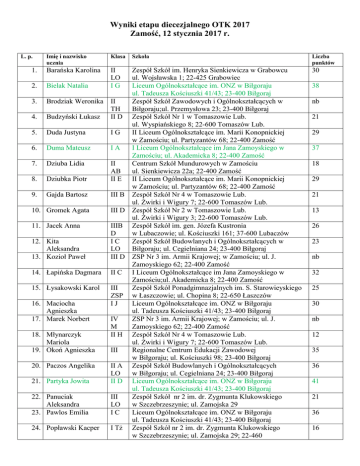 Wyniki etapu diecezjalnego OTK 2017 Zamość, 12 stycznia 2017 r. Imię i nazwisko ucznia Klasa 1. Barańska Karolina 2. Bielak Natalia II LO IG 3. Brodziak Weronika 4. Budzyński Łukasz 5. Duda Justyna 6. Duma Mateusz 7. Dziuba Lidia 8. Dziubka Piotr 9. Gajda Bartosz L. p. 10. Gromek Agata 11. Jacek Anna 12. Kita Aleksandra 13. Kozioł Paweł 14. Łapińska Dagmara 15. Łysakowski Karol 16. Maciocha Agnieszka 17. Marek Norbert 18. Młynarczyk Mariola 19. Okoń Agnieszka 20. Paczos Angelika 21. Partyka Jowita 22. Panuciak Aleksandra 23. Pawlos Emilia 24. Popławski Kacper Szkoła Zespół Szkół im. Henryka Sienkiewicza w Grabowcu ul. Wojsławska 1; 22-425 Grabowiec Liceum Ogólnokształcące im. ONZ w Biłgoraju ul. Tadeusza Kościuszki 41/43; 23-400 Biłgoraj II Zespół Szkół Zawodowych i Ogólnokształcących w TH Biłgoraju;ul. Przemysłowa 23; 23-400 Biłgoraj II D Zespół Szkół Nr 1 w Tomaszowie Lub. ul. Wyspiańskiego 8; 22-600 Tomaszów Lub. IG II Liceum Ogólnokształcące im. Marii Konopnickiej w Zamościu; ul. Partyzantów 68; 22-400 Zamość IA I Liceum Ogólnokształcące im Jana Zamoyskiego w Zamościu; ul. Akademicka 8; 22-400 Zamość II Centrum Szkół Mundurowych w Zamościu AB ul. Sienkiewicza 22a; 22-400 Zamość II E II Liceum Ogólnokształcące im. Marii Konopnickiej w Zamościu; ul. Partyzantów 68; 22-400 Zamość III B Zespół Szkół Nr 4 w Tomaszowie Lub. ul. Żwirki i Wigury 7; 22-600 Tomaszów Lub. III D Zespół Szkół Nr 2 w Tomaszowie Lub. ul. Żwirki i Wigury 3; 22-600 Tomaszów Lub. IIIB Zespół Szkół im. gen. Józefa Kustronia D w Lubaczowie; ul. Kościuszki 161; 37-600 Lubaczów IC Zespół Szkół Budowlanych i Ogólnokształcących w LO Biłgoraju; ul. Cegielniana 24; 23-400 Biłgoraj III D ZSP Nr 3 im. Armii Krajowej; w Zamościu; ul. J. Zamoyskiego 62; 22-400 Zamość II C I Liceum Ogólnokształcące im Jana Zamoyskiego w Zamościu;ul. Akademicka 8; 22-400 Zamość III Zespół Szkół Ponadgimnazjalnych im. S. Starowieyskiego ZSP w Łaszczowie; ul. Chopina 8; 22-650 Łaszczów IJ Liceum Ogólnokształcące im. ONZ w Biłgoraju ul. Tadeusza Kościuszki 41/43; 23-400 Biłgoraj IV ZSP Nr 3 im. Armii Krajowej; w Zamościu; ul. J. M Zamoyskiego 62; 22-400 Zamość II H Zespół Szkół Nr 4 w Tomaszowie Lub. ul. Żwirki i Wigury 7; 22-600 Tomaszów Lub. III Regionalne Centrum Edukacji Zawodowej w Biłgoraju; ul. Kościuszki 98; 23-400 Biłgoraj II A Zespół Szkół Budowlanych i Ogólnokształcących LO w Biłgoraju; ul. Cegielniana 24; 23-400 Biłgoraj II D Liceum Ogólnokształcące im. ONZ w Biłgoraju ul. Tadeusza Kościuszki 41/43; 23-400 Biłgoraj III Zespół Szkół nr 2 im. dr. Zygmunta Klukowskiego LO w Szczebrzeszynie; ul. Zamojska 29 IC Liceum Ogólnokształcące im. ONZ w Biłgoraju ul. Tadeusza Kościuszki 41/43; 23-400 Biłgoraj I Tż Zespół Szkół nr 2 im. dr. Zygmunta Klukowskiego w Szczebrzeszynie; ul. Zamojska 29; 22-460 Liczba punktów 30 38 nb 21 29 37 18 29 21 13 26 23 nb 32 25 30 nb 12 35 36 41 21 36 16 25. Rybak Aleksandra IC 26. Rzemieniuk Weronika 27. Skwarek Joanna I 28. Tatarczak Marta ID 29. Tomczuk Kamila 30. Turek Paweł III ZSP II B 31. Zarembska Magdalena 32. Zawada Dominik III BD II D IC Liceum Ogólnokształcące im. ONZ w Biłgoraju ul. Tadeusza Kościuszki 41/43; 23-400 Biłgoraj III Liceum Ogólnokształcące im. C. K. Norwida w Zamościu;ul. Kilińskiego 15; 22 – 400 Zamość Liceum Ogólnokształcące im. ONZ w Biłgoraju ul. Tadeusza Kościuszki 41/43; 23-400 Biłgoraj Zespół Szkół nr 3 w Hrubieszowie ul. Żeromskiego 11; 22-500 Hrubieszów Zespół Szkół Ponadgimnazjalnych im. S. Starowieyskiego w Łaszczowie; ul. Chopina 8; 22-650 Łaszczów Liceum Ogólnokształcące im. gen. Tadeusza Kościuszki w Lubaczowie; ul. Kościuszki 26; 37-600 Lubaczów Zespół Szkół im. gen. Józefa Kustronia w Lubaczowie; ul. Kościuszki 161; 37-600 Lubaczów Zespół Szkół Nr 1 w Tomaszowie Lub. ul. Wyspiańskiego 8; 22-600 Tomaszów Lub. 32 25 30 32 nb 20 27 8