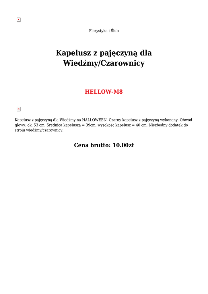 Florystyka i Ślub Kapelusz z pajęczyną dla Wiedźmy/Czarownicy HELLOW-M8 Kapelusz z pajęczyną dla Wiedźmy na HALLOWEEN. Czarny kapelusz z pajęczyną wykonany. Obwód głowy: ok. 53 cm, Średnica kapelusza = 39cm, wysokośc kapelusz = 40 cm. Niezbędny dodatek do stroju wiedźmy/czarownicy. Cena brutto: 10.00zł