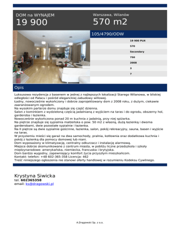 DOM na WYNAJEM 19 900 Warszawa, Wilanów 570 m2 105/4790/ODW 19 900 PLN 570 Secondary 750 2008 3 7 Opis Luksusowa rezydencja z basenem w jednej z najlepszych lokalizacji Starego Wilanowa, w bliskiej odległości od Pałacu i pośród eleganckiej zabudowy willowej. Ładny, nowocześnie wykończony i dobrze zaprojektowany dom z 2008 roku, z dużym, ciekawie zaaranżowanym ogrodem. Na wysokim parterze domu znajduje się część dzienna. Salon z kominkiem z wydzieloną częścią jadalnianą z wyjściem na taras i do ogrodu, obszerny hol, garderoba i łazienka. Nowocześnie wykończona ponad 20 m kuchnia z jadalnią, przy niej spiżarka. Na piętrze znajduje się sypialnia małżeńska o pow. 50 m2 z własną, dużą łazienką i dwoma garderobami, dwie pozostałe sypialnie i łazienka. Na II piętrze są dwie sypialnie gościnne, łazienka, salon, pokój rekreacyjny, sauna, basen i wyjście na taras. W przyziemiu mieści się garaż na dwa samochody, pralnia, kotłownia oraz dodatkowa kuchnia i pokój z łazienką dla pomocy domowej lub niani. Dom wyposażony w klimatyzację, centralny odkurzacz i instalację alarmową. Miejsce dobrze skomunikowane z centrum miasta, w pobliżu liczne przedszkola i szkoły międzynarodowe: amerykańska, niemiecka, francuska i brytyjska. Dom bardzo wygodny, zapewniający komfort życia przyszłym mieszkańcom. Kontakt: telefon: +48 602-365-358 Licencja: 462 Treść niniejszego ogłoszenia nie stanowi oferty handlowej w rozumieniu Kodeksu Cywilnego. Krystyna Siwicka tel. 602365358 email: [email protected] A.Drągowski Sp. z o.o. Powered by TCPDF (www.tcpdf.org)