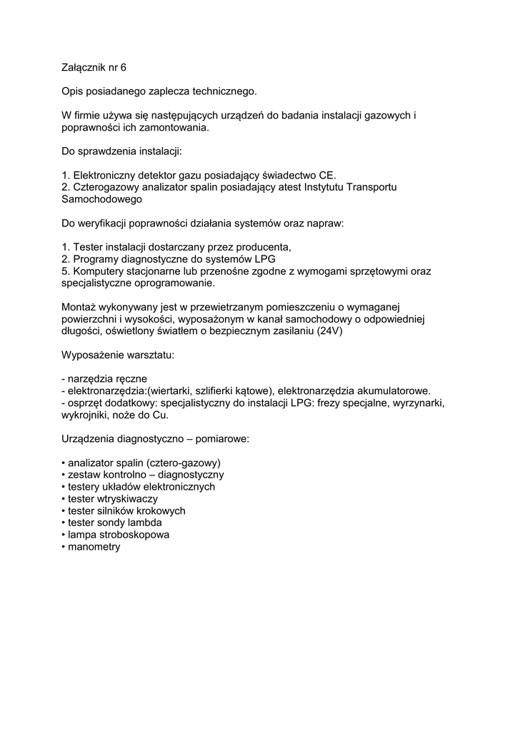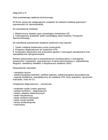Załącznik nr 6 Opis posiadanego zaplecza technicznego. W firmie używa się następujących urządzeń do badania instalacji gazowych i poprawności ich zamontowania. Do sprawdzenia instalacji: 1. Elektroniczny detektor gazu posiadający świadectwo CE. 2. Czterogazowy analizator spalin posiadający atest Instytutu Transportu Samochodowego Do weryfikacji poprawności działania systemów oraz napraw: 1. Tester instalacji dostarczany przez producenta, 2. Programy diagnostyczne do systemów LPG 5. Komputery stacjonarne lub przenośne zgodne z wymogami sprzętowymi oraz specjalistyczne oprogramowanie. Montaż wykonywany jest w przewietrzanym pomieszczeniu o wymaganej powierzchni i wysokości, wyposażonym w kanał samochodowy o odpowiedniej długości, oświetlony światłem o bezpiecznym zasilaniu (24V) Wyposażenie warsztatu: - narzędzia ręczne - elektronarzędzia:(wiertarki, szlifierki kątowe), elektronarzędzia akumulatorowe. - osprzęt dodatkowy: specjalistyczny do instalacji LPG: frezy specjalne, wyrzynarki, wykrojniki, noże do Cu. Urządzenia diagnostyczno – pomiarowe: • analizator spalin (cztero-gazowy) • zestaw kontrolno – diagnostyczny • testery układów elektronicznych • tester wtryskiwaczy • tester silników krokowych • tester sondy lambda • lampa stroboskopowa • manometry