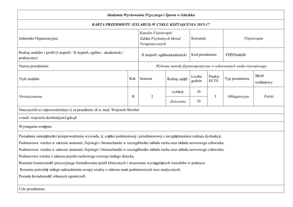 Akademia Wychowania Fizycznego i Sportu w Gdańsku KARTA PRZEDMIOTU (SYLABUS) W CYKLU KSZTAŁCENIA 2015-17 Katedra Fizjoterapii/ Zakład Fizykalnych Metod Terapeutycznych Jednostka Organizacyjna: Rodzaj studiów i profil (I stopień / II stopień, ogólno - akademicki / praktyczny): II stopień, ogólnoakademicki Nazwa przedmiotu: Tryb studiów Niestacjonarne Kierunek: Fizjoterapia Kod przedmiotu: Wybrane metody fizjoterapeutyczne w schorzeniach wieku rozwojowego Rok II Semestr 2 Rodzaj zajęć Liczba godzin wykłady 10 ćwiczenia 10 Punkty ECTS 3 Nauczyciel(-e) odpowiedzialny(-i) za przedmiot: dr n. med. Wojciech Skrobot e-mail: [email protected] Wymagania wstępne: Posiadanie umiejętności przeprowadzenia wywiadu, tj. części podmiotowej i przedmiotowej z uwzględnieniem rodzaju dysfunkcji. Podstawowa wiedza w zakresie anatomii, fizjologii i biomechaniki w szczególności układu ruchu oraz układu nerwowego człowieka. Podstawowa wiedza w zakresie anatomii, fizjologii i biomechaniki w szczególności układu ruchu oraz układu nerwowego człowieka. Podstawowa wiedza z zakresu psycho-ruchowego rozwoju małego dziecka. Rozumie konieczność precyzyjnego formułowania pytań klinicznych i stosowanie wyciągniętych wniosków w praktyce. Rozumie potrzebę stałego uaktualniania swojej wiedzy z zakresu nauk podstawowych oraz medycznych. Posiada świadomość własnych ograniczeń. Cele przedmiotu: FIISNmk04 Typ przedmiotu Język wykładowy Obligatoryjny Polski Zaznajomienie z założeniami teoretycznymi oraz z podstawowymi umiejętnościami praktycznymi dotyczącymi różnych metod leczniczych stosowanych w fizjoterapii wieku rozwojowego . Nauka umiejętnego wyznaczania celów terapii. Nauka pielęgnacji dziecka. Nauka umiejętnego dopasowania metody do dziecka, jak i rodziny. Zaznajomienie wskazań i przeciw wskazań do danej metody. Opis efektów kształcenia dla przedmiotu oraz ich powiązanie z efektami kształcenia dla kierunku: 1. Opisuje mechanizm oddziaływania i potrafi scharakteryzować tzw. specjalne metody fizjoterapii wykorzystywanych w pracy z dziećmi. 2. Potrafi zastosować odpowiednią pomoc i sprzęt w oparciu o wybraną metodę. 3. Potrafi przedstawić wybrane problemy funkcjonalne pacjenta oraz możliwości stosowania fizjoterapii – umiejętność doboru metod terapii w zależności od dysfunkcji dziecka. 4. Rozumie potrzebę stałego uaktualniania swojej wiedzy z zakresu nauk podstawowych oraz medycznych. 5. Posiada świadomość swoich ograniczeń. 6. Krytycznie ocenia własne i cudze działania oraz dokonuje weryfikacji proponowanych rozwiązań. WIEDZA Student zna główne zasady metod neurofizjologicznych, wykorzystywanych do terapii w schorzeniach wieku W1 rozwojowego. Ma podstawy neurorehabilitacji, w odniesieniu do możliwości oddziaływania na CUN. Wie na K_W20 czym polega reedukacja posturalna, nerwowo-mięśniowa. Student ma wiedzę z zakresu biomechaniki, przede wszystkim w odniesieniu do kształtowania prawidłowych W2 wzorców ruchowych tułowia, kończyn. Zna najczęściej występujące patologie rozwojowe, będące przedmiotem usprawniania fizjoterapeutycznego. K_W33 UMIEJĘTNOŚCI Student potrafi w zależności od problemu funkcjonalnego, dobrać odpowiednie środki oddziaływania U1 fizjoterapeutycznego, przede wszystkim świadome użycie „narzędzi” diagnostycznych i terapeutycznych z zakresu stosowanych metod. Umie w sposób zrozumiały wytłumaczyć najważniejsze mechanizmy. K_U05 U2 W zależności od stanu klinicznego pacjenta, student potrafi tworzyć, modyfikować plan usprawniania. K_U08 Dostosować terapię w zależności od postępów usprawniania. U3 Potrafi programować aktywność ruchową adaptacyjną w rehabilitacji kompleksowej i podtrzymywaniu K_U09 sprawności osób z różnymi dysfunkcjami U4 Potrafi formułować problemy badawcze, konstruować i dobierać adekwatne metody oraz techniki badawcze K_U13 do pozyskiwania danych KOMPETENCJE K1 K2 Ma świadomość konieczności rozszerzania wiedzy, permanentnego szkolenia się, korzystania z wiarygodnych źródeł teoretycznych i praktycznych. Potrafi podejmować samodzielnie decyzje oraz brać za nie odpowiedzialność K_K02 K_K08 Kryteria i metody oceny osiągniętych efektów kształcenia: Kolokwium zaliczeniowe semestralne - testowe na ocenę. Egzamin testowy. Kryterium oceny: wynikowe - procent poprawnych odpowiedzi. Aby uzyskać zaliczenie przedmiotu na ocenę dostateczną student musi osiągnąć wszystkie wymienione przedmiotowe efekty kształcenia. Metody i formy realizacji przedmiotu: Wykład: konwersatoryjny; z prezentacją multimedialną; Ćwiczenia: demonstracja; instruowanie; trening umiejętności Treści kształcenia: Wykłady 1. Metoda Vojty – historia metody, cele i założenia, diagnoza i terapia, techniki, terminologia, zastosowanie. 2. Metoda NDT-Bobath – historii, Założenia i cele, diagnoza i terapia, techniki, terminologia, wykorzystywanie sprzętu, zastosowanie. 3. Metoda Integracji Sensorycznej – twórcy, założenia, diagnoza i terapia SI, wykorzystywany sprzęt, zastosowanie. 4. Metoda Domana – historia, cele i założenia, diagnoza i terapia, wykorzystywany sprzęt, terminologia, zastosowanie. 5. Metoda Peto – historia, cele i założenia, wykorzystywany sprzęt, zastosowanie. 6. Metoda PNF – historia metody, cele i założenia, diagnoza i terapia, techniki, zastosowanie. 7. Inne specjalne metody fizjoterapeutyczne wykorzystywane w terapii dzieci np. terapia zajęciowa, metoda W. Sherborne, metoda Costillo Morales. 8. Animaloterapia: hipoterapia, delfinoterapia, dogoterapia – nowe atrakcyjne dla dzieci metody terapii wspomagającej. 9. Formy rehabilitacji oddechowej – kinezyterapia oddechowa. Ćwiczenia: 1. Metody wspomagania rozwoju dzieci z zaburzeniami neurorozwojowymi. 2 godz 2. Metoda Vojty 2 godz 3. Metoda Domana 2 godz 4. Metoda Peto 2 godz 5. Metoda Integracji Sensorycznej 2 godz Forma zaliczenia: Wykłady: egzamin Ćwiczenia: 