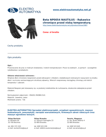 www.elektroautomatyka.net.pl Beta NP0054 NAUTILUS - Rękawice chroniące przed niską temperaturą http://www.elektroautomatyka.net.pl/product/show/2887 Cena: zł brutto Cechy produktu Opis produktu Opis : Przeznaczone do prac w mokrym środowisku i niskich temperaturach. Prace na statkach , w portach - szczególnie rybołówstwo i przeładunki. Główne właściwości ochronne : Wnętrze dłoni chronione neoprenem przed wibracjami i chłodem z dodatkowymi skórzanymi naszyciami na środku dłoni i na kciuku wzmacniającymi strukturę rękawicy. Wierzch neoprenowy rozciągliwy chroniący od niskich temperatur i uderzeń. Materiał Neopren jest stosowany np. w produkcji skafandrów do nurkowania, skutecznie zabezpiecza przed chłodem. Normy/poziom odporności : EN420; EN388:2141 Materiał : bawełna, Latex Możliwość prania : Tak ELEKTRO-AUTOMATYKA Sprzedaż elektronarzędzi, urządzeń spawalniczych, maszyn budowlanych, pneumatyki, narzędzi warsztatowych, firmowych ubrań roboczych oraz maszyn ogrodowo leśnych. Sklep Bochnia ul. Brzeska 50 32-700 Bochnia Sklep Brzesko ul. Szarych Szeregów 23 32-800 Brzesko Serwis, Magazyn ul. Św. Brata Alberta 4 32-800 Brzesko tel. 691 572 333 e-mail: [email protected] tel. 609 523 230 e-mail: [email protected] tel. 609 523 645 e-mail: [email protected]