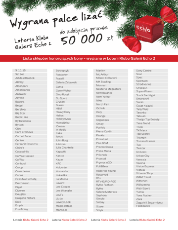 Lista sklepów honorujących bony - wygrane w Loterii Klubu Galerii Echo 2 5. 10. 15. Eurooptyk Marilyn 5a' Sec Fotojoker Adidas/Reebok Fratelli Mc Arthur Milano Collezioni AllPlay Galeria Zabawek MK Bowling Alpenpark Gatta Americanos Gerry Weber Monnari Nexterio Megastore Answear Gino Rossi Aryton Go Sport Grycan Guess H&M Heavy Duty Badura Beppi New Balance New Yorker Nike North Fish Sony Centre Soul Spec Sportalm Stradivarius Strellson Super-Pharm Sushi Bar Nigiri Swarovski Swiss Helios Hobby4Men Orange Organique Świat Książki Tally Weijl Taranko Tatuum Thalgo Top Beauty Orsay Time Trend Parfois Carpet Zone Home&You iDream In Medio Itaka Janus Tivoli TK Maxx Top Secret Centro John Burg Cersanit Opoczno Plus GSM Claire’s Jubitom Julia Chantelle Prezenciarnia Tua Twister Coccodrillo KappAhl Prima Moda Unisono Coffee Heaven Kastor Próchnik Urban City Coffiko Kazar Promod Conhpol KFC Prymus AGD Cropp Kolporter Pull&Bear Cross Jeans Komandor Reporter Young Cubus Kukartka Czas Na Herbatę La Marina Deichmann Lavard Digel Diverse Douglas Lee Cooper Reserved Rh+ RTV-EURO-AGD Ryłko Fashion Venezia Verona Vision Express Vistula Vitamin Shop Drogeria Natura Liu Jo Lovely Look Bershka Big Star Butik I like By Dziubeka Bytom C&A Cafe Cremova Ecco Empik Eurofirany Loteria Klubu Galerii Echo 2 Lee Wrangler Levi´s Magia d’Italia Manso.pl Loteria Klubu Galerii Echo 2 Ochnik Only Pierre Cardin Pimkie Pizza Hut Ryłko Selene Materace Sephora Simple Sinsay Sizeer Smyk Loteria Klubu Galerii Echo 2 Triumph Trussardi Jeans W&M Travel Wittchen Wólczanka Wsół Sport Yumla Yves Rocher Zara Zegarki i Zegarmistrz Fijałkowski Loteria Klubu Galerii Echo 2