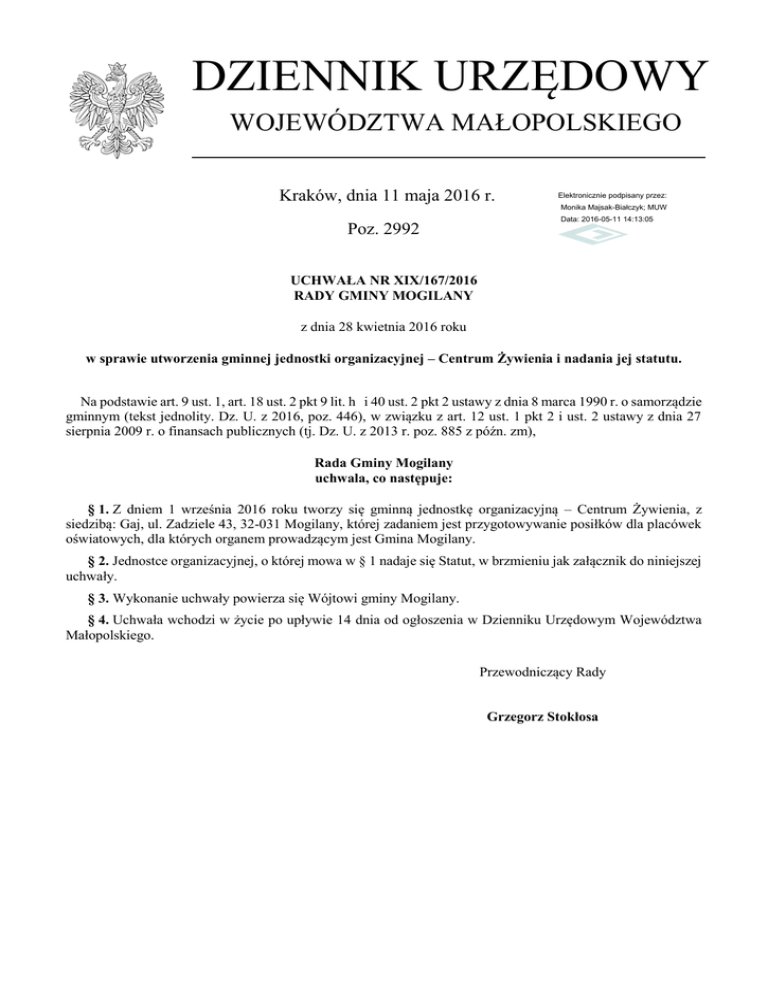 DZIENNIK URZĘDOWY WOJEWÓDZTWA MAŁOPOLSKIEGO Kraków, dnia 11 maja 2016 r. Elektronicznie podpisany przez: Monika Majsak-Białczyk; MUW Poz. 2992 Data: 2016-05-11 14:13:05 UCHWAŁA NR XIX/167/2016 RADY GMINY MOGILANY z dnia 28 kwietnia 2016 roku w sprawie utworzenia gminnej jednostki organizacyjnej – Centrum Żywienia i nadania jej statutu. Na podstawie art. 9 ust. 1, art. 18 ust. 2 pkt 9 lit. h i 40 ust. 2 pkt 2 ustawy z dnia 8 marca 1990 r. o samorządzie gminnym (tekst jednolity. Dz. U. z 2016, poz. 446), w związku z art. 12 ust. 1 pkt 2 i ust. 2 ustawy z dnia 27 sierpnia 2009 r. o finansach publicznych (tj. Dz. U. z 2013 r. poz. 885 z późn. zm), Rada Gminy Mogilany uchwala, co następuje: § 1. Z dniem 1 września 2016 roku tworzy się gminną jednostkę organizacyjną – Centrum Żywienia, z siedzibą: Gaj, ul. Zadziele 43, 32-031 Mogilany, której zadaniem jest przygotowywanie posiłków dla placówek oświatowych, dla których organem prowadzącym jest Gmina Mogilany. § 2. Jednostce organizacyjnej, o której mowa w § 1 nadaje się Statut, w brzmieniu jak załącznik do niniejszej uchwały. § 3. Wykonanie uchwały powierza się Wójtowi gminy Mogilany. § 4. Uchwała wchodzi w życie po upływie 14 dnia od ogłoszenia w Dzienniku Urzędowym Województwa Małopolskiego. Przewodniczący Rady Grzegorz Stokłosa Dziennik Urzędowy Województwa Małopolskiego –2– Poz. 2992 Załącznik do Uchwały Nr XIX/167/2016 Rady Gminy Mogilany z dnia 28 kwietnia 2016 r. Statut gminnej jednostki organizacyjnej- Centrum Żywienia Rozdział 1. Postanowienia ogólne § 1. Podstawą działania Centrum Żywienia są: - ustawa z dnia 8 marca 1990 r. o samorządzie gminnym (tj. Dz. U. z 2016 r. poz. 446), - ustawa z dnia 27 sierpnia 2009 r. o finansach publicznych (tj. Dz. U. z 2013 r., poz. 885 z późn. zm.) - niniejszy statut. § 2. Centrum Żywienia- zwane dalej Centrum, jest gminną jednostką budżetową w rozumieniu przepisów ustawy o finansach publicznych. Siedzibą Centrum jest: Gaj, ul. Zadziele 43, 32-031 Mogilany. Obszar działania Centrum obejmuje teren Gminy Mogilany, zwanej dalej Gminą. Nadzór nad działalnością Centrum sprawuje Wójt Gminy Mogilany. § 3. Centrum Żywienia używa pieczęci podłużnej o następującej treści: Centrum Żywienia, Gaj, ul. Zadziele 43, 32-031 Mogilany. Rozdział 2. Przedmiot i zakres działania § 4. Przedmiotem podstawowej działalności Centrum jest: 1. Realizacja zadań własnych, niezbędnych dla funkcjonowania Centrum. 2. Współdziałanie z innymi instytucjami gminnymi, w zakresie spraw związanych z przygotowywaniem posiłków dla placówek oświatowych. § 5. Do zadań Centrum należy: 1. Dożywianie dzieci i młodzieży, 2. Inne cele wyznaczone przez kierownika jednostki. § 6. Centrum prowadzi składnicę akt. Rozdział 3. Gospodarka finansowa § 7. 1. Centrum Żywienia jest jednostką budżetową działającą na zasadach określonych w ustawie o finansach publicznych oraz przepisach wykonawczych wydanych na jej podstawie. 2. Podstawą działalności Centrum jest roczny plan finansowy. 3. Kierownik Centrum dysponuje środkami finansowymi określonymi w planie finansowym jednostki i ponosi odpowiedzialność za ich prawidłowe wydatkowanie. 4. Centrum realizuje zadania ze środków finansowych zatwierdzonych Uchwałą Budżetową Rady Gminy Mogilany i przekazywanych z Budżetu Gminy na rachunek Centrum Żywienia, prowadzony przez bank wybrany do obsługi budżetu Gminy. 5. Obsługę finansową, administracyjną i kadrową - na podstawie decyzji kierownika Centrum- prowadzi Zespół Ekonomiczno-Administracyjny Szkół w Mogilanach, na podstawie porozumień. § 8. 1. Nadzór nad działalnością finansową Centrum sprawuje Wójt Gminy Mogilany oraz Skarbnik Gminy. Dziennik Urzędowy Województwa Małopolskiego –3– Poz. 2992 Rozdział 4. Organizacja i zarządzanie § 9. 1. Pracą Centrum kieruje kierownik i reprezentuje ją na zewnątrz. 2. Kierownika powołuje i odwołuje Wójt Gminy Mogilany, który wykonuje w stosunku do niego uprawnienia pracodawcy. 3. W razie nieobecności kierownika Wójt Gminy Mogilany może wyznaczyć osobę pełniącą jego obowiązki. § 10. 1. Kierownik kieruje jednoosobowo bieżącą działalnością Centrum i ponosi odpowiedzialność za całokształt pracy jednostki. 2. Do podstawowych uprawnień i obowiązków kierownika należy organizacja pracy Centrum oraz nadzór nad pracą pracowników. 3. Kierownik ponosi odpowiedzialność za majątek Centrum oraz przeprowadzenie inwentaryzacji, w terminach wynikających z obowiązujących przepisów. 4. Kierownik Centrum przedstawia wnioski wraz z uzasadnieniem w sprawie zmian budżetowych. § 11. 1. Centrum Żywienia jest pracodawcą, w znaczeniu przepisów prawa pracy, w stosunku do pracowników, zatrudnionych w Centrum. 2. Kierownik Centrum wykonuje uprawnienia pracodawcy, w stosunku do pozostałych pracowników Centrum. 3. Kierownik Centrum wydaje wewnętrzne zarządzenia, dotyczące organizacji pracy w jednostce, w tym między innymi wprowadza regulamin pracy i regulamin wynagrodzeń pracowników Centrum. § 12. Szczegółowy zakres działania Centrum, w tym strukturę organizacyjną, określa regulamin organizacyjny nadawany przez kierownika Centrum Żywienia, po uzyskaniu pozytywnej opinii Wójta Gminy. Rozdział 5. Postanowienia końcowe § 13. 1. Zmiany w Statucie mogą być dokonywane w trybie określonym dla jego nadania. 2. W sprawach nieuregulowanych niniejszym Statutem mają zastosowanie przepisy powszechnie obowiązujące. 3. Za przestrzeganie niniejszego Statutu odpowiedzialność ponosi kierownik Centrum Żywienia. Przewodniczący Rady Grzegorz Stokłosa