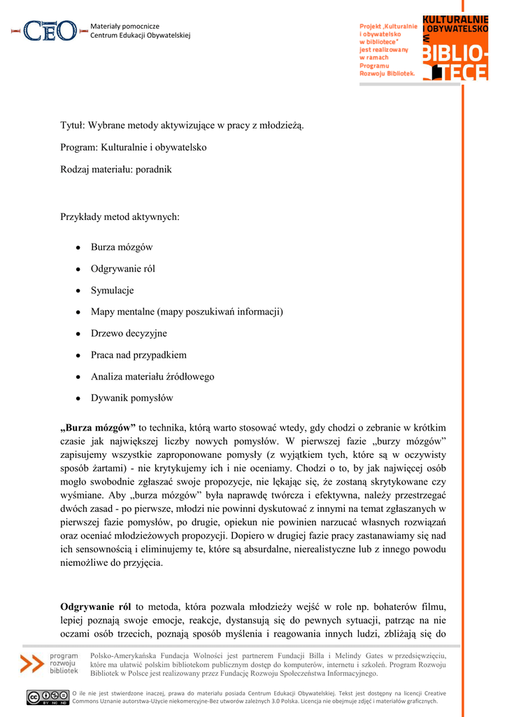 Materiały pomocnicze Centrum Edukacji Obywatelskiej Tytuł: Wybrane metody aktywizujące w pracy z młodzieżą. Program: Kulturalnie i obywatelsko Rodzaj materiału: poradnik Przykłady metod aktywnych: Burza mózgów Odgrywanie ról Symulacje Mapy mentalne (mapy poszukiwań informacji) Drzewo decyzyjne Praca nad przypadkiem Analiza materiału źródłowego Dywanik pomysłów „Burza mózgów” to technika, którą warto stosować wtedy, gdy chodzi o zebranie w krótkim czasie jak największej liczby nowych pomysłów. W pierwszej fazie „burzy mózgów” zapisujemy wszystkie zaproponowane pomysły (z wyjątkiem tych, które są w oczywisty sposób żartami) - nie krytykujemy ich i nie oceniamy. Chodzi o to, by jak najwięcej osób mogło swobodnie zgłaszać swoje propozycje, nie lękając się, że zostaną skrytykowane czy wyśmiane. Aby „burza mózgów” była naprawdę twórcza i efektywna, należy przestrzegać dwóch zasad - po pierwsze, młodzi nie powinni dyskutować z innymi na temat zgłaszanych w pierwszej fazie pomysłów, po drugie, opiekun nie powinien narzucać własnych rozwiązań oraz oceniać młodzieżowych propozycji. Dopiero w drugiej fazie pracy zastanawiamy się nad ich sensownością i eliminujemy te, które są absurdalne, nierealistyczne lub z innego powodu niemożliwe do przyjęcia. Odgrywanie ról to metoda, która pozwala młodzieży wejść w role np. bohaterów filmu, lepiej poznają swoje emocje, reakcje, dystansują się do pewnych sytuacji, patrząc na nie oczami osób trzecich, poznają sposób myślenia i reagowania innych ludzi, zbliżają się do Polsko-Amerykańska Fundacja Wolności jest partnerem Fundacji Billa i Melindy Gates w przedsięwzięciu, które ma ułatwić polskim bibliotekom publicznym dostęp do komputerów, internetu i szkoleń. Program Rozwoju Bibliotek w Polsce jest realizowany przez Fundację Rozwoju Społeczeństwa Informacyjnego. O ile nie jest stwierdzone inaczej, prawa do materiału posiada Centrum Edukacji Obywatelskiej. Tekst jest dostępny na licencji Creative Commons Uznanie autorstwa-Użycie niekomercyjne-Bez utworów zależnych 3.0 Polska. Licencja nie obejmuje zdjęd i materiałów graficznych. Materiały pomocnicze Centrum Edukacji Obywatelskiej odgrywanych postaci. W ćwiczeniach wykorzystujących tę metodę role można ściśle określić bądź też poprzestać na ogólnej instrukcji, pozostawiając resztę inwencji samych „aktorów”. Drama jest improwizacją, która umożliwia przeżycie pewnych problemów oraz poszukiwanie ich rozwiązań. Stawiamy pewien problem, pytanie, które staje się pretekstem do udzielenia odpowiedzi w postaci scenki do odegrania. Odpowiedź przygotowywana jest w zespołach. Odegranie scenki wywołuje w uczestnikach emocje, pomaga je uzewnętrznić, przeżyć i zrozumieć. Takim pretekstem może być obraz, rzeźba, utwór muzyczny, rozpoczęty tekst, problem. Gry symulacyjne to stworzone przez opiekuna sytuacje, w trakcie których młodzi ludzie naśladują procesy zachodzące w prawdziwym życiu społecznym, ekonomicznym i politycznym. Symulacje stanowią zatem „zminiaturyzowaną” wersję rzeczywistości. Jest to metoda zbliżona do odgrywania ról, różni się od niej jednak w istotny sposób, bo jej celem nie jest przedstawienie zachowań konkretnych postaci, lecz zilustrowanie pewnych zjawisk czy mechanizmów. W symulacji nie idzie więc o popis aktorskich umiejętności, ale o sprawne i w miarę możliwości bezosobowe odtworzenie danego procesu. Oczywiście trzeba pamiętać, że każda symulacja upraszcza rzeczywistość, bo inaczej nie byłoby możliwe jej przeprowadzenie na zajęciach! Mapa pojęciowa (mentalna) jest metodą wizualnego przedstawienia problemu, rodzajem schematu pojęciowego ilustrującego nasz sposób myślenia za pomocą słów, obrazów, zdjęć, rysunków itp. Aby stworzyć mapę pojęciową, należy wyjść od interesującego nas pojęcia, problemu, a następnie stworzyć wokół niego sieć logicznych połączeń. Polsko-Amerykańska Fundacja Wolności jest partnerem Fundacji Billa i Melindy Gates w przedsięwzięciu, które ma ułatwić polskim bibliotekom publicznym dostęp do komputerów, internetu i szkoleń. Program Rozwoju Bibliotek w Polsce jest realizowany przez Fundację Rozwoju Społeczeństwa Informacyjnego. O ile nie jest stwierdzone inaczej, prawa do materiału posiada Centrum Edukacji Obywatelskiej. Tekst jest dostępny na licencji Creative Commons Uznanie autorstwa-Użycie niekomercyjne-Bez utworów zależnych 3.0 Polska. Licencja nie obejmuje zdjęd i materiałów graficznych. Materiały pomocnicze Centrum Edukacji Obywatelskiej Schemat poszukiwania informacji w bibliotece Drzewo decyzyjne - jest to wizualna prezentacja przebiegu procesu myślenia. Jeżeli młody człowiek ma podjąć decyzję w jakiejś sprawie, to powinien w pień drzewa wpisać (określić), jaka sytuacja wymaga podjęcia decyzji. Następnie (na poziomie gałęzi) wpisuje możliwe rozwiązania określonego poniżej problemu. Każde z rozwiązań przynosi dobre i złe konsekwencje wyboru, które umieszcza na trzecim poziomie. W koronie drzewa określa cele i wartości, którymi się kieruje. Polsko-Amerykańska Fundacja Wolności jest partnerem Fundacji Billa i Melindy Gates w przedsięwzięciu, które ma ułatwić polskim bibliotekom publicznym dostęp do komputerów, internetu i szkoleń. Program Rozwoju Bibliotek w Polsce jest realizowany przez Fundację Rozwoju Społeczeństwa Informacyjnego. O ile nie jest stwierdzone inaczej, prawa do materiału posiada Centrum Edukacji Obywatelskiej. Tekst jest dostępny na licencji Creative Commons Uznanie autorstwa-Użycie niekomercyjne-Bez utworów zależnych 3.0 Polska. Licencja nie obejmuje zdjęd i materiałów graficznych. Materiały pomocnicze Centrum Edukacji Obywatelskiej Studium przypadku to metoda, która pozwala przedstawić ogólny problem na przykładzie konkretnej sytuacji. Zamiast teoretycznych 