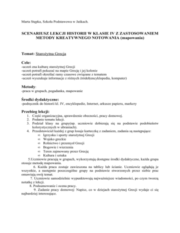 Marta Stępka, Szkoła Podstawowa w Jaśkach. SCENARIUSZ LEKCJI HISTORII W KLASIE IV Z ZASTOSOWANIEM METODY KREATYWNEGO NOTOWANIA (mapowania) Temat: Starożytna Grecja Cele: -uczeń zna kulturę starożytnej Grecji -uczeń potrafi pokazać na mapie Grecję i jej kolonie -uczeń potrafi określać ramy czasowe związane z tematem -uczeń wyszukuje informacje z różnych źródeł(encyklopedia, komputer) Metody: -praca w grupach, pogadanka, mapowanie Środki dydaktyczne: -podręcznik do historii kl. IV, encyklopedie, Internet, arkusze papieru, markery Przebieg lekcji: 1. Część organizacyjna, sprawdzenie obecności, pracy domowej. 2. Podanie tematu lekcji. 3. Podział klasy na grupy(np. uczniowie dobierają się na podstawie podobieństw kolorystycznych w ubraniach). 4. Przedstawiciel każdej z grup losuje karteczkę z zadaniem, zadania są następujące: • Igrzyska i sporty starożytnej Grecji • Wojsko greckie • Rolnictwo i przemysł Grecji • Bogowie i wierzenia • Teren zajmowany przez Grecję • Kultura i sztuka 5.Uczniowie pracują w grupach, wykorzystują dostępne środki dydaktyczne, każda grupa stosuje metodę mapowania. 6. Każda praca zostaje zawieszona na tablicy lub ścianie. Uczniowie oglądają je wszystkie, a następnie poszczególne grupy na podstawie stworzonych przez siebie prac omawiają swój temat. 7. Uczniowie samodzielnie wypunktowują najważniejsze wiadomości, po czym tworzą notatkę z lekcji. 8. Podsumowanie i ocena pracy. 9. Zadanie pracy domowej: Napisz, co w dziejach starożytnej Grecji wydaje ci się najbardziej interesujące.