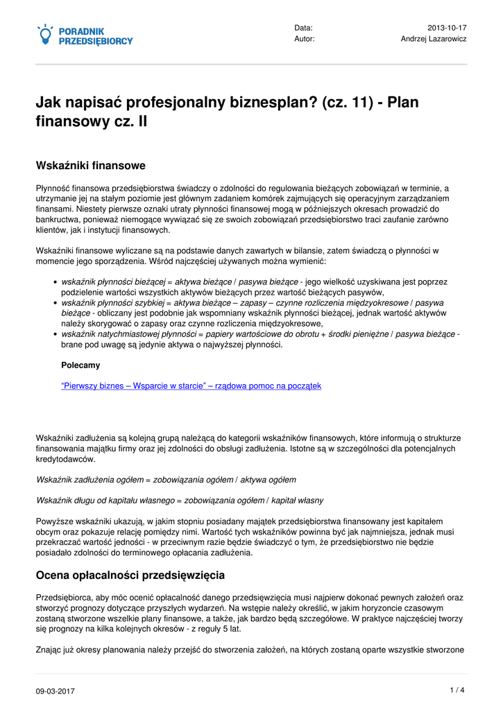 Data: Autor: 2013-10-17 Andrzej Lazarowicz Jak napisać profesjonalny biznesplan? (cz. 11) - Plan finansowy cz. II Wskaźniki finansowe Płynność finansowa przedsiębiorstwa świadczy o zdolności do regulowania bieżących zobowiązań w terminie, a utrzymanie jej na stałym poziomie jest głównym zadaniem komórek zajmujących się operacyjnym zarządzaniem finansami. Niestety pierwsze oznaki utraty płynności finansowej mogą w późniejszych okresach prowadzić do bankructwa, ponieważ niemogące wywiązać się ze swoich zobowiązań przedsiębiorstwo traci zaufanie zarówno klientów, jak i instytucji finansowych. Wskaźniki finansowe wyliczane są na podstawie danych zawartych w bilansie, zatem świadczą o płynności w momencie jego sporządzenia. Wśród najczęściej używanych można wymienić: wskaźnik płynności bieżącej = aktywa bieżące / pasywa bieżące - jego wielkość uzyskiwana jest poprzez podzielenie wartości wszystkich aktywów bieżących przez wartość bieżących pasywów, wskaźnik płynności szybkiej = aktywa bieżące – zapasy – czynne rozliczenia międzyokresowe / pasywa bieżące - obliczany jest podobnie jak wspomniany wskaźnik płynności bieżącej, jednak wartość aktywów należy skorygować o zapasy oraz czynne rozliczenia międzyokresowe, wskaźnik natychmiastowej płynności = papiery wartościowe do obrotu + środki pieniężne / pasywa bieżące brane pod uwagę są jedynie aktywa o najwyższej płynności. Polecamy “Pierwszy biznes – Wsparcie w starcie” – rządowa pomoc na początek Wskaźniki zadłużenia są kolejną grupą należącą do kategorii wskaźników finansowych, które informują o strukturze finansowania majątku firmy oraz jej zdolności do obsługi zadłużenia. Istotne są w szczególności dla potencjalnych kredytodawców. Wskaźnik zadłużenia ogółem = zobowiązania ogółem / aktywa ogółem Wskaźnik długu od kapitału własnego = zobowiązania ogółem / kapitał własny Powyższe wskaźniki ukazują, w jakim stopniu posiadany majątek przedsiębiorstwa finansowany jest kapitałem obcym oraz pokazuje relację pomiędzy nimi. Wartość tych wskaźników powinna być jak najmniejsza, jednak musi przekraczać wartość jedności - w przeciwnym razie będzie świadczyć o tym, że przedsiębiorstwo nie będzie posiadało zdolności do terminowego opłacania zadłużenia. Ocena opłacalności przedsięwzięcia Przedsiębiorca, aby móc ocenić opłacalność danego przedsięwzięcia musi najpierw dokonać pewnych założeń oraz stworzyć prognozy dotyczące przyszłych wydarzeń. Na wstępie należy określić, w jakim horyzoncie czasowym zostaną stworzone wszelkie plany finansowe, a także, jak bardzo będą szczegółowe. W praktyce najczęściej tworzy się prognozy na kilka kolejnych okresów - z reguły 5 lat. Znając już okresy planowania należy przejść do stworzenia założeń, na których zostaną oparte wszystkie stworzone 09-03-2017 1/4 Data: Autor: 2013-10-17 Andrzej Lazarowicz prognozy finansowe. Co ważne, określenie koncepcji musi mieć solidne podstawy, aby została uznana za zgodną ze stanem faktycznym panującym na rynku. Założenia powinny dotyczyć przede wszystkim: sprzedaży - główny element dokonywania szacunków, gdzie zalecane jest wykonanie jak najbardziej ostrożnych obliczeń, popartych faktami. Wszelkie dane powinny wynikać z przeprowadzonej w jednym z poprzednich rozdziałów biznesplanu analizy rynku. Niedopuszczalne są na tym etapie odstępstwa pomiędzy danymi zawartymi w poszczególnych częściach biznesplanu, kosztów - w szczególności należy przedstawić zarys określający koszty zmienne, koszty stałe oraz marżę osiąganą na sprzedaży, nakładów inwestycyjnych - czyli wielkość kapitału, jaki zostanie wniesiony do przedsięwzięcia w celu przeprowadzenia inwestycji, kapitału obrotowego - wskazanie przeciętnej wielkości kapitału obrotowego, w szczególności uwzględniając przy tym zapasy oraz należności, podatków - nieodłączna część działania każdego przedsiębiorstwa, powinna określać wielkość zobowiązań podatkowych w prognozowanych okresach przy osiąganych wynikach. Polecamy 7 zasad innowacyjnego biznesu Posiadając solidne podstawy, można przejść do tworzenia prognoz finansowych. Muszą one wynikać oraz być zgodne z poczynionymi założeniami. Co istotne, powinny także uwzględniać sformułowane wcześniej cele przedsięwzięcia, dotyczące m.in. przyjętych strategii działalności gospodarczej w każdym z segmentów. Na prognozy finansowe składają się takie narzędzia, jak: rachunek zysków i strat, bilans, rachunek przepływów pieniężnych. Statyczne i dynamiczne metody oceny projektów Na podstawie stworzonych prognoz przepływów pieniężnych dokonuje się oceny projektu w kwestii finansowej. Rozróżniamy metody statyczne, niebiorące pod uwagę zmiennej wartości pieniądza w czasie oraz metody dynamiczne, które ją uwzględniają. Metody statyczne Księgowa stopa zwrotu (ARR) = przeciętny roczny zysk netto / przeciętne nakłady inwestycyjne Przedstawia relację korzyści netto uzyskanych przez dane przedsięwzięcie do nakładów, jakie zostały w tym celu poniesione. Podstawowym założeniem jest to, że obie wartości są wyrażone jako kategorie księgowe. Okres zwrotu (OZ) = nakłady inwestycyjne / średnia roczna nadwyżka pieniężna Wskaźnik pokazuje po jakim czasie inwestycja zostanie zwrócona, polega na sumowaniu nadwyżek pieniężnych z poszczególnych lat do momentu zrównania ich wartości z poniesionymi nakładami inwestycyjnymi. Polecamy Wskazówki dla startujących w biznesie 09-03-2017 2/4 Data: Autor: 2013-10-17 Andrzej Lazarowicz Metody dynamiczne Wartość bieżąca netto (NPV) CFt - przepływy pieniężne netto w okresie t (różnica pomiędzy wpływami i wypływami), n - okres prognozy, t - kolejne okresy prognozy, r - stopa dyskontowa, gdzie: r = koszt kredytów ba