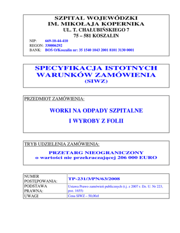 SZPITAL WOJEWÓDZKI IM. MIKOŁAJA KOPERNIKA UL. T. CHAŁUBIŃSKIEGO 7 75 – 581 KOSZALIN 669-10-44-410 NIP: REGON: 330006292 BANK: BOŚ O/Koszalin nr: 35 1540 1043 2001 8101 3130 0001 SPECYFIKACJA ISTOTNYCH WARUNKÓW ZAMÓWIENIA (SIWZ) PRZEDMIOT ZAMÓWIENIA: WORKI NA ODPADY SZPITALNE I WYROBY Z FOLII TRYB UDZIELENIA ZAMÓWIENIA: PRZETARG NIEOGRANICZONY o wartości nie przekraczającej 206 000 EURO NUMER POSTĘPOWANIA: PODSTAWA PRAWNA: UWAGI TP-231/3/PN/63/2008 Ustawa Prawo zamówień publicznych (t.j. z 2007 r. Dz. U. Nr 223, poz. 1655) Cena SIWZ – 50,00zł SIWZ TP-231/3/PN/63/2008 I. OPIS PRZEDMIOTU ZAMÓWIENIA Przedmiotem zamówienia jest dostawa worków na odpady szpitalne i wyroby z folii. Kod CPV 25222000-3. Szczegółowy zakres przedmiotu zamówienia określony jest w Załączniku nr 2 do SIWZ. II. TERMIN WYKONANIA ZAMÓWIENIA Termin wykonania zamówienia 12 miesięcy od daty podpisania umowy. III. CZĘŚCI ZAMÓWIENIA Zamawiający dopuszcza składania ofert częściowych: Zadanie nr 1- worki na odpady szpitalne (Kod CPV 25222000-3), Zadanie nr 2 – wyroby z folii (Kod CPV 25222000-3). IV. ZAMÓWIENIA UZUPEŁNIAJĄCE Zamawiający nie przewiduje zamówień uzupełniających. V. OFERTY WARIANTOWE Zamawiający nie dopuszcza składania ofert wariantowych. VI. WARUNKI UDZIAŁU W POSTĘPOWANIU 1. Warunki udziału w postępowaniu o udzielenie zamówienia publicznego O udzielenie zamówienia mogą ubiegać się wykonawcy, którzy spełnią następujące warunki: 1) posiadają uprawnienia do wykonywania określonej działalności lub czynności, jeżeli ustawy nakładają obowiązek posiadania takich uprawnień: a) prowadzą zarejestrowaną działalność gospodarczą w zakresie objętym przedmiotowym zamówieniem; b) nie zalegają z opłacaniem podatków, opłat oraz składek na ubezpieczenie zdrowotne i społeczne, lub uzyskali przewidziane prawem zwolnienie, odroczenie lub rozłożenie na raty zaległych płatności lub mają wstrzymane w całości wykonanie decyzji właściwego organu; c) nie figurują w Krajowym Rejestrze Karnym na podstawie art. 24 ustawy Prawo zamówień publicznych. 2) posiadają niezbędną wiedzę i doświadczenie oraz dysponują potencjałem technicznym i osobami zdolnymi do wykonania zamówienia; 3) znajdują się w sytuacji ekonomicznej i finansowej zapewniającej wykonanie zamówienia; 4) nie podlegają wykluczeniu z postępowania o udzielenie zamówienia. 2. Ocena spełnienia warunków udziału w postępowaniu o udzielenie zamówienia publicznego SIWZ TP-231/3/PN/63/2008 Ocena spełnienia warunków wymaganych od Wykonawców zostanie dokonana wg formuły „spełnia – nie spełnia” w następujący sposób: 1) Zamawiający na podstawie złożonych wraz z ofertą dokumentów będzie badał czy dokumenty te potwierdzają wymóg spełnienia określonego przez Zamawiającego warunku, 2) w przypadku, gdy wymóg spełnienia warunku zostanie potwierdzony w dokumentach złożonych przez Wykonawcą, warunek zostanie uznany za „spełniony”, 3) w przypadku, gdy wymóg spełnienia warunku nie zostanie potwierdzony w dokumentach złożonych przez Wykonawcę, warunek zostanie uznany za „niespełniony”. VII. INFORMACJE O OŚWIADCZENIACH LUB DOKUMENTACH, JAKIE MUSZĄ DOSTARCZYĆ WYKONAWCY W CELU PRZEPROWADZENIA POSTĘPOWANIA PRZEZ ZAMAWIAJĄCEGO 1. W celu potwierdzenia, że wykonawca posiada uprawnienie do wykonywania określonej działalności lub czynności oraz nie podlega wykluczeniu na podstawie art. 24 ustawy z dnia 29 stycznia 2004 r. - Prawo zamówień publicznych, wykonawca składa następujące dokumenty: 1) aktualny odpis z właściwego rejestru albo aktualne zaświadczenie o wpisie do ewidencji działalności gospodarczej, jeżeli odrębne przepisy wymagają wpisu do rejestru lub zgłoszenia do ewidencji działalności gospodarczej, wystawiony nie wcześniej niż 6 miesięcy przed upływem terminu składania wniosków o dopuszczenie do udziału w postępowaniu o udzielenie zamówienia albo składania ofert; 2) aktualne zaświadczenia właściwego naczelnika urzędu skarbowego oraz właściwego oddziału Zakładu Ubezpieczeń Społecznych lub Kasy Rolniczego Ubezpieczenia Społecznego potwierdzające odpowiednio, że wykonawca nie zalega z opłacaniem podatków, opłat oraz składek na ubezpieczenie zdrowotne i społeczne, lub zaświadczeń, że uzyskał przewidziane prawem zwolnienie, odroczenie lub rozłożenie na raty zaległych płatności lub wstrzymanie w całości wykonania decyzji właściwego organu – wystawione nie wcześniej niż 3 miesiące przed upływem terminu składania wniosków o dopuszczenie do udziału w postępowaniu o udzielenie zamówienia albo składania ofert. 3) aktualna informacja z Krajowego Rejestru Karnego w zakresie określonym w art. 24 ust. 1 pkt 48 ustawy, wystawiona nie wcześniej niż 6 miesięcy przed upływem terminu składania wniosków o dopuszczenie do udziału w postępowaniu o udzielenie zamówienia albo składania ofert; 4) aktualna informacji z Krajowego Rejestru Karnego w zakresie określonym w art. 24 ust. 1 pkt 9 ustawy, wystawiona nie wcześniej niż 6 miesięcy przed upływem terminu składania wniosków o dopuszczenie do udziału w postępowaniu o udzielenie zamówienia albo składania ofert; 5) oświadczenie do postępowania o zamówienie publiczne z art. 22 ust. 1 ustawy Prawo zamówień publicznych z wykorzystaniem wzoru - Załącznik nr 5 do SIWZ; 2.1 Jeżeli wykonawca ma siedzibę lub miejsce zamieszkania poza terytorium Rzeczypospolitej Polskiej, zamiast dokumentów, o których mowa w ust. 1: 1) pkt 2, 3 i 5 – składa dokument lub dokumenty, wystawione w kraju, w którym ma siedzibę lub miejsce zamieszkania, potwierdzające odpowiednio, że: a) nie otwarto jego likwidacji ani nie ogłoszono upadłości, b) nie zalega z uiszczaniem podatków, opłat, składek na ubezpieczenie społeczne i zdrowotne albo że uzyskał przewidziane prawem zwolnienie, odroczenie lub rozłożenie na raty zaległ