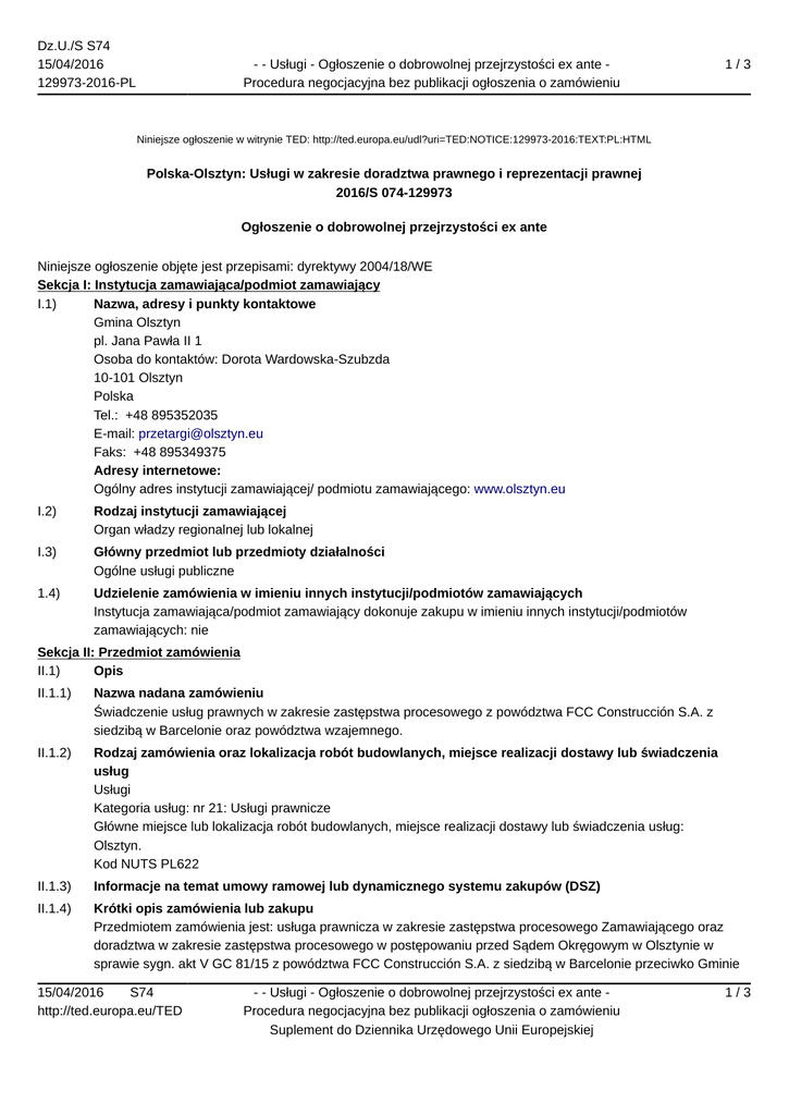 Dz.U./S S74 15/04/2016 129973-2016-PL - - Usługi - Ogłoszenie o dobrowolnej przejrzystości ex ante Procedura negocjacyjna bez publikacji ogłoszenia o zamówieniu 1/3 Niniejsze ogłoszenie w witrynie TED: http://ted.europa.eu/udl?uri=TED:NOTICE:129973-2016:TEXT:PL:HTML Polska-Olsztyn: Usługi w zakresie doradztwa prawnego i reprezentacji prawnej 2016/S 074-129973 Ogłoszenie o dobrowolnej przejrzystości ex ante Niniejsze ogłoszenie objęte jest przepisami: dyrektywy 2004/18/WE Sekcja I: Instytucja zamawiająca/podmiot zamawiający I.1) Nazwa, adresy i punkty kontaktowe Gmina Olsztyn pl. Jana Pawła II 1 Osoba do kontaktów: Dorota Wardowska-Szubzda 10-101 Olsztyn Polska Tel.: +48 895352035 E-mail: [email protected] Faks: +48 895349375 Adresy internetowe: Ogólny adres instytucji zamawiającej/ podmiotu zamawiającego: www.olsztyn.eu I.2) Rodzaj instytucji zamawiającej Organ władzy regionalnej lub lokalnej I.3) Główny przedmiot lub przedmioty działalności Ogólne usługi publiczne 1.4) Udzielenie zamówienia w imieniu innych instytucji/podmiotów zamawiających Instytucja zamawiająca/podmiot zamawiający dokonuje zakupu w imieniu innych instytucji/podmiotów zamawiających: nie Sekcja II: Przedmiot zamówienia II.1) Opis II.1.1) Nazwa nadana zamówieniu Świadczenie usług prawnych w zakresie zastępstwa procesowego z powództwa FCC Construcción S.A. z siedzibą w Barcelonie oraz powództwa wzajemnego. II.1.2) Rodzaj zamówienia oraz lokalizacja robót budowlanych, miejsce realizacji dostawy lub świadczenia usług Usługi Kategoria usług: nr 21: Usługi prawnicze Główne miejsce lub lokalizacja robót budowlanych, miejsce realizacji dostawy lub świadczenia usług: Olsztyn. Kod NUTS PL622 II.1.3) Informacje na temat umowy ramowej lub dynamicznego systemu zakupów (DSZ) II.1.4) Krótki opis zamówienia lub zakupu Przedmiotem zamówienia jest: usługa prawnicza w zakresie zastępstwa procesowego Zamawiającego oraz doradztwa w zakresie zastępstwa procesowego w postępowaniu przed Sądem Okręgowym w Olsztynie w sprawie sygn. akt V GC 81/15 z powództwa FCC Construcción S.A. z siedzibą w Barcelonie przeciwko Gminie 15/04/2016 S74 http://ted.europa.eu/TED - - Usługi - Ogłoszenie o dobrowolnej przejrzystości ex ante Procedura negocjacyjna bez publikacji ogłoszenia o zamówieniu Suplement do Dziennika Urzędowego Unii Europejskiej 1/3 Dz.U./S S74 15/04/2016 129973-2016-PL - - Usługi - Ogłoszenie o dobrowolnej przejrzystości ex ante Procedura negocjacyjna bez publikacji ogłoszenia o zamówieniu 2/3 Olsztyn o zapłatę kwoty 321 974 063,16 PLN oraz powództwa wzajemnego Gminy Olsztyn przeciwko FCC Construcción S.A. o zapłatę kwoty 128 105 126,19 PLN. II.1.5) Wspólny Słownik Zamówień (CPV) 79110000 II.6) Informacje na temat Porozumienia w sprawie zamówień rządowych (GPA) Zamówienie jest objęte Porozumieniem w sprawie zamówień rządowych (GPA): tak II.2) Całkowita końcowa wartość zamówienia (zamówień) II.2.1) Całkowita końcowa wartość zamówienia (zamówień) Sekcja IV: Procedura IV.1) Rodzaj procedury Negocjacyjna bez publikacji ogłoszenia o zamówieniu/uprzedniego ogłoszenia Uzasadnienie wyboru procedury negocjacyjnej bez uprzedniej publikacji ogłoszenia o zamówieniu w Dz.U.. UE zgodnie z art. 31 dyrektywy 2004/18/WE Inne uzasadnienie udzielenia zamówienia bez uprzedniej publikacji ogłoszenia o zamówieniu w Dz.U.. UE Przedmiotem zamówienia są usługi wymienione w załączniku IIB do dyrektywy Wykonawca, któremu Zamawiający zamierza powierzyć wykonanie przedmiotowego zamówienia, na podstawie art. 5 ust. 1b. ustawy Pzp, jest podmiotem, który posiada niezbędną wiedzę dotyczącą tego sporu. Kancelaria Adwokatów i Radców Prawnych sp.k. Pawłowski Kamiński Skromak posiada duże doświadczenie prawne. Dotychczasowe czynności dokonywane przez nią cechują się dużą znajomością przedmiotu spraw, a dotychczasowa skuteczność prowadzi do realizacji zadań na wysokim poziomie. Przedmiotowe zamówienie jest kontynuacją zadań wcześniejszych zastępstwa procesowego i doradztwa prawnego w postępowaniu przeciwko FCC Construcción S.A. z siedzibą w Barcelonie, dlatego też zasadnym jest udzielenie zamówienia ww. Kancelarii. IV.2) Kryteria udzielenia zamówienia IV.2.1) Kryteria udzielenia zamówienia Najniższa cena IV.2.2) Informacje na temat aukcji elektronicznej Wykorzystana będzie aukcja elektroniczna: nie IV.3) Informacje administracyjne IV.3.1) Numer referencyjny nadany sprawie przez instytucję zamawiającą /podmiot zamawiający ZP.271.1.16.2016.S IV.3.2) Poprzednie publikacje dotyczące tego samego zamówienia nie Sekcja V: Udzielenie zamówienia V.1) Data decyzji o udzieleniu zamówienia: V.2) Informacje o ofertach V.3) Nazwa i adres wykonawcy, na rzecz którego została wydana decyzja o udzieleniu zamówienia Pawłowski Kamiński Skromak Kancelaria Adwokatów i Radców Prawnych sp.k. ul. Trzy Lipy 3 80-172 Gdańsk Polska V.4) Informacje na temat wartości zamówienia 15/04/2016 S74 http://ted.europa.eu/TED - - Usługi - Ogłoszenie o dobrowolnej przejrzystości ex ante Procedura negocjacyjna bez publikacji ogłoszenia o zamówieniu Suplement do Dziennika Urzędowego Unii Europejskiej 2/3 Dz.U./S S74 15/04/2016 129973-2016-PL - - Usługi - Ogłoszenie o dobrowolnej przejrzystości ex ante Procedura negocjacyjna bez publikacji ogłoszenia o zamówieniu 3/3 Początkowa szacunkowa całkowita wartość zamówienia: Wartość: 933 000 PLN Bez VAT V.5) Informacje na temat podwykonawstwa Przewidywane jest zlecenie podwykonawstwa w ramach zamówienia: tak Wartość lub część zamówienia, które prawdopodobnie będzie zlecone stronom trzecim Nieznana Sekcja VI: Informacje uzupełniające VI.1) Informacje o funduszach Unii Europejskiej Zamówienie dotyczy projektu/programu finansowanego ze środków Unii Europejskiej: nie VI.2) Informacje dodatkowe: VI.3) Procedury odwoławcze VI.3.1) Organ odpowiedzialny za procedury odwoła