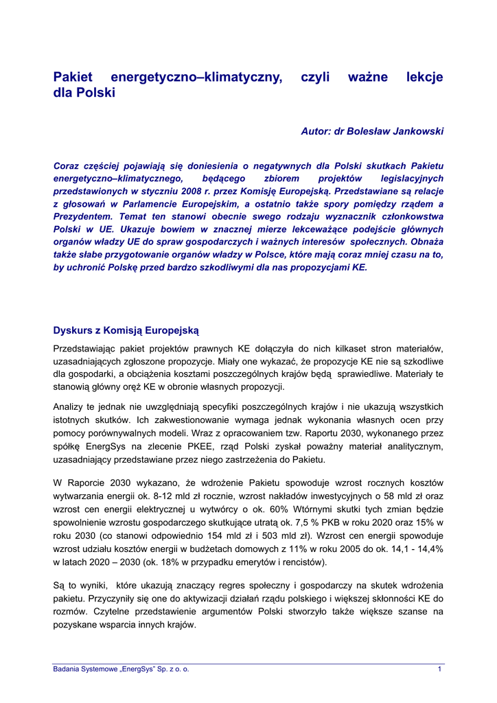 Pakiet energetyczno–klimatyczny, dla Polski czyli ważne lekcje Autor: dr Bolesław Jankowski Coraz częściej pojawiają się doniesienia o negatywnych dla Polski skutkach Pakietu energetyczno–klimatycznego, będącego zbiorem projektów legislacyjnych przedstawionych w styczniu 2008 r. przez Komisję Europejską. Przedstawiane są relacje z głosowań w Parlamencie Europejskim, a ostatnio także spory pomiędzy rządem a Prezydentem. Temat ten stanowi obecnie swego rodzaju wyznacznik członkowstwa Polski w UE. Ukazuje bowiem w znacznej mierze lekceważące podejście głównych organów władzy UE do spraw gospodarczych i ważnych interesów społecznych. Obnaża także słabe przygotowanie organów władzy w Polsce, które mają coraz mniej czasu na to, by uchronić Polskę przed bardzo szkodliwymi dla nas propozycjami KE. Dyskurs z Komisją Europejską Przedstawiając pakiet projektów prawnych KE dołączyła do nich kilkaset stron materiałów, uzasadniających zgłoszone propozycje. Miały one wykazać, że propozycje KE nie są szkodliwe dla gospodarki, a obciążenia kosztami poszczególnych krajów będą sprawiedliwe. Materiały te stanowią główny oręż KE w obronie własnych propozycji. Analizy te jednak nie uwzględniają specyfiki poszczególnych krajów i nie ukazują wszystkich istotnych skutków. Ich zakwestionowanie wymaga jednak wykonania własnych ocen przy pomocy porównywalnych modeli. Wraz z opracowaniem tzw. Raportu 2030, wykonanego przez spółkę EnergSys na zlecenie PKEE, rząd Polski zyskał poważny materiał analitycznym, uzasadniający przedstawiane przez niego zastrzeżenia do Pakietu. W Raporcie 2030 wykazano, że wdrożenie Pakietu spowoduje wzrost rocznych kosztów wytwarzania energii ok. 8-12 mld zł rocznie, wzrost nakładów inwestycyjnych o 58 mld zł oraz wzrost cen energii elektrycznej u wytwórcy o ok. 60% Wtórnymi skutki tych zmian będzie spowolnienie wzrostu gospodarczego skutkujące utratą ok. 7,5 % PKB w roku 2020 oraz 15% w roku 2030 (co stanowi odpowiednio 154 mld zł i 503 mld zł). Wzrost cen energii spowoduje wzrost udziału kosztów energii w budżetach domowych z 11% w roku 2005 do ok. 14,1 - 14,4% w latach 2020 – 2030 (ok. 18% w przypadku emerytów i rencistów). Są to wyniki, które ukazują znaczący regres społeczny i gospodarczy na skutek wdrożenia pakietu. Przyczyniły się one do aktywizacji działań rządu polskiego i większej skłonności KE do rozmów. Czytelne przedstawienie argumentów Polski stworzyło także większe szanse na pozyskane wsparcia innych krajów. Badania Systemowe „EnergSys” Sp. z o. o. 1 Pakiet energetyczno – klimatyczny, czyli ważne lekcje dla Polski Ułomność proponowanych rozwiązań Nie tylko Polska ma problem z Pakietem. Dotyka on wiele krajów, a większość kłopotów to skutek wadliwie zaprojektowanych mechanizmów. Do najważniejszych wad Pakietu należą: wprowadzenie poważnych zaburzeń rynkowych, wybiórcze podejście do internalizacji kosztów, tworzenie warunków do uzyskania nadmiernych zysków przez elektrownie jądrowe, złożoność i niekompletność metody alokacji uprawnień, niepewny efekt ekologiczny na skutek zagrożenia tzw. wyciekiem emisji poza UE. Dla Polski kluczowe znaczenie ma zastosowanie metody rozdziału uprawnień, która powoduje ogromny wzrost cen energii oraz nierównomierny rozkład kosztów pośrednich pomiędzy kraje członkowskie. Propozycje KE oznaczają w całej Unii ogromne zagrożenie konkurencyjności dla wszystkich energochłonnych przemysłów, a w sektorze elektroenergetycznym preferencje dla najpotężniejszych firm energetycznych oraz elektrowni jądrowych. W efekcie można oczekiwać konsolidacji tego sektora poprzez przejmowanie mniejszych firm energetycznych przez europejskich potentatów. Działania takie są zupełnie przeciwstawne do forsowanej przez KE liberalizacji rynku energii elektrycznej. Specyficznie „obywatelska” polityka KE Wiele problemów i wad obecnej propozycji KE można uniknąć przez zmianę metody rozdziału uprawnień emisyjnych. Bardzo dobrą propozycję zgłosiła już w 2007 r. szeroka reprezentacja przemysłów europejskich. W lipcu 2008 została ona publicznie zaprezentowana przez organizację energochłonnych przemysłów europejskich (IFIEC) wraz z pozytywną oceną wystawioną przez znaną firmę doradczą Ecofys Metoda polega na przydziale darmowych uprawnień na podstawie rzeczywistej produkcji i jednakowego dla danej grupy produktowego wskaźnika emisji (benchmarku). Główną jej cechą jest ok. dziesięciokrotnie mniejszy wzrost cen energii elektrycznej w stosunku do propozycji KE. Inną ważną zaletą jest całkowita likwidacja warunków do wystąpienia tzw. nadmiernych zysków, które są często wtórnym powodem wzrostu cen dla odbiorców. Metoda udowodniła swoje zalety m.in. poprzez zastosowanie w holenderskim systemie handlu emisjami NOx, a ostatnio także w Kanadzie. Jej wykorzystanie pozwoliłoby na złagodzenie większości wad propozycji KE, w tym zmniejszenie ryzyka utraty konkurencyjności przez przemysły UE oraz znacznego ograniczenia ryzyka wycieku emisji. W materiałach IFIEC przekazanych do prasy zawarto retoryczne pytanie: Czy UE stać na zignorowanie rozwiązania, które powoduje takie same redukcje emisji CO2, ale przy znacznie mniejszych kosztach dla użytkowników energii oraz wyeliminowaniu zaburzeń konkurencyjności na rynku energii? KE odrzucając tą propozycję uznała jednak, że kraje unijne stać na politykę windowania cen energii. Taka postawa nie dziwi osób znających układ sił w KE, gdzie pozycja „resortu” środowiska (DG Environment) wielokrotnie okazywała się silniejsza od resortu konkurencji (DG Competition). Jest jednak niezrozumiała z pozycji obywatela UE, który ma prawo oczekiwać, że jego interesy będą brane pod uwagę przy tworzeniu nowego prawa. Badania Systemowe „EnergSys” Sp. z o. o. 2 Pakiet energetyczno – klimatyczny, 