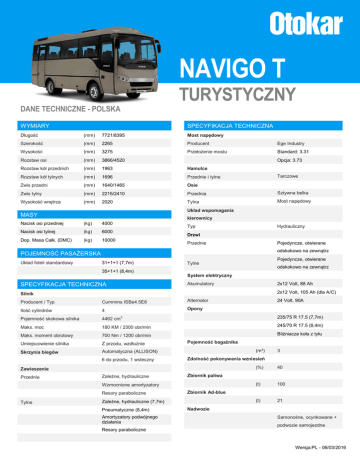 NAVIGO T TURYSTYCZNY DANE TECHNICZNE - POLSKA WYMIARY SPECYFIKACJA TECHNICZNA Długość (mm) 7721/8395 Most napędowy Szerokość (mm) 2265 Producent Ege Industry Wysokość (mm) 3275 Przełożenie mostu Standard: 3.31 Rozstaw osi (mm) 3866/4520 Rozstaw kół przednich (mm) 1963 Hamulce Rozstaw kół tylnych (mm) 1696 Przednie i tylne Zwis przedni (mm) 1640/1465 Osie Zwis tylny (mm) 2215/2410 Przednia Sztywna belka Wysokość wnętrza (mm) 2020 Tylna Most napędowy Opcja: 3.73 Tarczowe Układ wspomagania MASY kierownicy Nacisk osi przedniej (kg) 4000 Nacisk osi tylnej (kg) 6000 Dop. Masa Całk. (DMC) (kg) 10000 Typ Hydrauliczny Drzwi Przednie Pojedyncze, otwierane odskokowo na zewnątrz POJEMNOŚĆ PASAŻERSKA Układ foteli standardowy 31+1+1 (7,7m) Pojedyncze, otwierane Tylne odskokowo na zewnątrz 35+1+1 (8,4m) System elektryczny Akumulatory SPECYFIKACJA TECHNICZNA 2x12 Volt, 88 Ah 2x12 Volt, 105 Ah (dla A/C) Silnik Producent / Typ Cummins ISBe4.5E6 Alternator Ilość cylindrów 4 Opony Pojemność skokowa silnika 4462 cm 24 Volt, 90A 235/75 R 17.5 (7,7m) 3 Maks. moc 180 KM / 2300 obr/min 245/70 R 17.5 (8,4m) Maks. moment obrotowy 700 Nm / 1200 obr/min Bliźniacze koła z tyłu Umiejscowienie silnika Z przodu, wzdłużnie Skrzynia biegów Automatyczna (ALLISON) 6 do przodu, 1 wsteczny Pojemność bagażnika (m³) Zawieszenie Przednie Zależne, hydrauliczne Tylne Amortyzatory podwójnego działania 40 (t) 100 (t) 21 Zbiornik Ad-blue Zależne, hydrauliczne (7,7m) Pneumatyczne (8,4m) (%) Zbiornik paliwa Wzmocnione amortyzatory Resory paraboliczne 3 Zdolność pokonywania wzniesień Nadwozie Samonośne, ocynkowane + podwozie samojezdne Resory paraboliczne Wersja:PL - 06/03/2016 WYPOSAŻENIE STANDARDOWE I OPCJE UKŁAD NAPĘDOWY INFORMACJA PASAŻERSKA LCD Monitor (ACTIA) / odtwarzacz DVD (KENWOOD) / nawigacja GPS S System zapowiedzi S Zegar cyfrowy S ABS, ASR,ESC S Zawieszenie tylne pneumatyczne (8,4m) S Zawieszenie tylne mechaniczne (7,7m) S Manualna skrzynia biegów (EATON) z lub bez retardera O Zawieszenie tylne pneumatyczne (7,7m) O KOMFORT KIEROWCY Zawieszenie tylne mechaniczne (8,4m) O Przednie rolety słoneczne KLIMATYZACJA I OGRZEWANIE S NADWOZIE Klimatyzacja (12kW KONVEKTA) S Lampy przeciwmgłowe (przednie ii tylne) S Rezygnacja z klimatyzacji O Lakier metaliczny O INNE WYPOSAŻENIE SZYBY Podwójne szyby boczne, przyciemnione S Główny wyłącznik prądu S Zasłonki dla okien bocznych i tylnego S Tachograf cyfrowy S Podgrzewana szyba boczna kierowcy S Indywidualne lampki do czytania S Podgrzewane, zewnętrzne lusterka wsteczne S Półki bagażowe nad fotelami S Pojedyncze szyby boczne, stałe (7,7m) O Dywanik w przejściu środkowym S Podwójne szyby boczne, stałe (7,7m) O Lodówka S Szyba czołowa z powłoką anty-SOL O Przygotowanie do uchwytów bagażnika typu SKI-BOX S Klapa w dachu S Gaśnice S Apteczki S Podgrzewacz wody O UŁATWIENIA DOSTĘPU Miejsca dla max. 4 wózków z niepełnosprawnymi O Przygotowanie do windy oraz trzecie drzwi O Winda (BRAUN) O FOTELE Fotele pasażerskie rozkładane, pasy dwupunktowe S Fotel kierowcy regulowany, pneumatyczny, pas 3 punktowy S Zagłówki foteli pasażerskich S Fotele pasażerskie rozkładane, pasy trzypunktowe O 33+1 bez fotela pilota ( 7,7m) O 37+1 bez fotela pilota (8,4m) O * Otokar Otomotiv ve Savunma Sanayii A.Ş zastrzega sobie prawo do wprowadzania zmian w projektach produktów i ich specyfikacji bez uprzedniego powiadomienia. Niektóre dane mogą odnosić się do wartości nominalnych. Prezentowane grafiki mogły zostać przygotowane dla użytku ogólnego i niektóre prezentowane informacje bądź akcesoria, mogą być niedostępne we wszystkich krajach. Produkty, aby zaspokoić popyt tudzież wymagania przepisów na poszczególnych rynkach, mogą być dostępne w różnych specyfikacjach lub konfiguracjach. BEZPIECZEŃSTWO Kamera cofania O Drzwi tylne z kontrola bezpieczeństwa O Czujniki cofania O Wyłączny przedstawiciel w Polsce: Bus Trans Technik Sp. z o.o. Warszawa www.otokarbus.pl +48 798 559 559