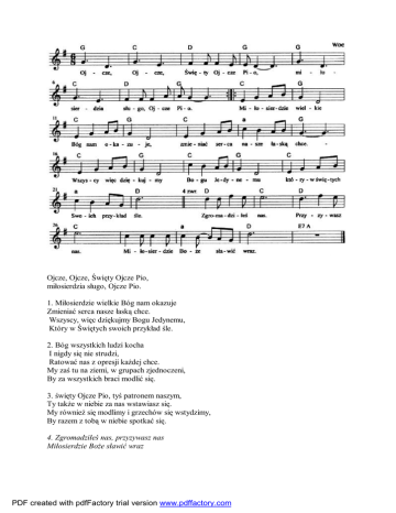 Ojcze, Ojcze, Święty Ojcze Pio, miłosierdzia sługo, Ojcze Pio. 1. Miłosierdzie wielkie Bóg nam okazuje Zmieniać serca nasze łaską chce. Wszyscy, więc dziękujmy Bogu Jedynemu, Który w Świętych swoich przykład śle. 2. Bóg wszystkich ludzi kocha I nigdy się nie strudzi, Ratować nas z opresji każdej chce. My zaś tu na ziemi, w grupach zjednoczeni, By za wszystkich braci modlić się. 3. święty Ojcze Pio, tyś patronem naszym, Ty także w niebie za nas wstawiasz się. My również się modlimy i grzechów się wstydzimy, By razem z tobą w niebie spotkać się. 4. Zgromadziłeś nas, przyzywasz nas Miłosierdzie Boże sławić wraz PDF created with pdfFactory trial version www.pdffactory.com