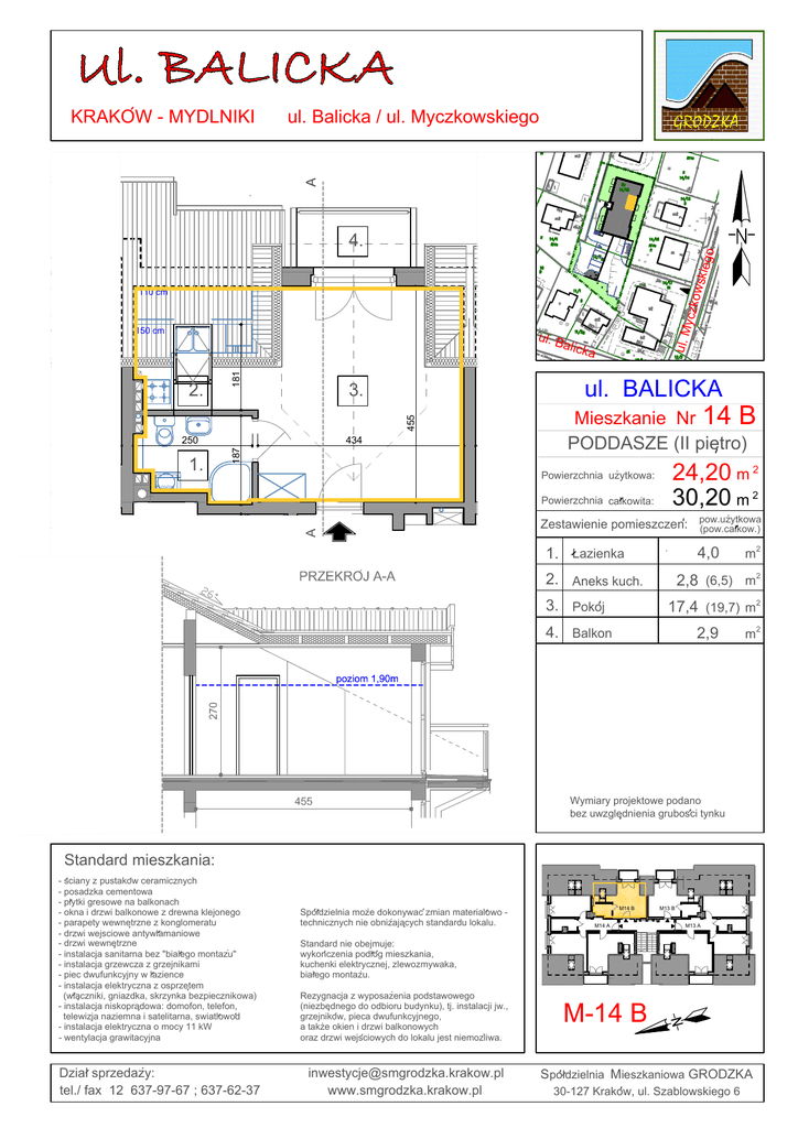 KRAKOW - MYDLNIKI ul. Balicka / ul. Myczkowskiego ows kieg o 4. 150 cm ul. B ul. M yczk 110 cm 1. 434 187 250 a ul. BALICKA 455 3. 455 2. 181 alick Mieszkanie Nr 14 B PODDASZE (II pietro) . Powierzchnia uzytkowa: Powierzchnia calkowita: 522 A Zestawienie pomieszczen: 155 1. 24,20 m 2 30,20. m 2 4,0 1. Lazienka 3. Pokoj 17,4 (19,7) m2 211 515 4. Balkon 4. m2 2,8 (6,5) m2 2. Aneks kuch. 405 pow.uzytkowa (pow.calkow.) 2,9 m 3. Wymiary projektowe podano bez uwzglednienia grubosci tynku Standard mieszkania: - sciany z pustakow ceramicznych - posadzka cementowa - plytki gresowe na balkonach - okna i drzwi balkonowe z drewna klejonego - parapety wewnetrzne z konglomeratu - drzwi wejsciowe antywlamaniowe - drzwi wewnetrzne . - instalacja sanitarna bez "bialego montazu" - instalacja grzewcza z grzejnikami - piec dwufunkcyjny w lazience - instalacja elektryczna z osprzetem (wlaczniki, gniazdka, skrzynka bezpiecznikowa) - instalacja niskopradowa: domofon, telefon, telewizja naziemna i satelitarna, swiatlowod - instalacja elektryczna o mocy 11 kW - wentylacja grawitacyjna . Dzial sprzedazy: tel./ fax 12 637-97-67 ; 637-62-37 . Spoldzielnia moze dokonywac zmian materialowo . technicznych nie obnizajacych standardu lokalu. M14 B M14 A M13 B M13 A Standard nie obejmuje: wykonczenia podlog mieszkania, kuchenki elektrycznej, zlewozmywaka, . bialego montazu. . Rezygnacja z wyposazenia podstawowego (niezbednego do odbioru budynku), tj. instalacji jw., grzejnikow, pieca dwufunkcyjnego, . a takze okien i drzwi balkonowych . oraz drzwi wejsciowych do lokalu jest niemozliwa. [email protected] www.smgrodzka.krakow.pl M-14 B S poldzielnia Mieszkaniowa GRODZKA 30-127 Krakow, ul. Szablowskiego 6 2