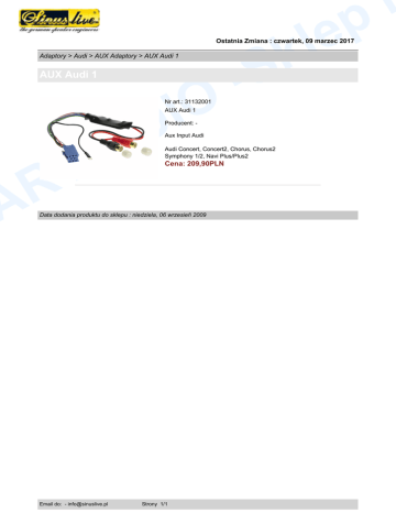 e l k -S i p Ostatnia Zmiana : czwartek, 09 marzec 2017 Adaptory > Audi > AUX Adaptory > AUX Audi 1 AUX Audi 1 O I D Nr art.: 31132001 AUX Audi 1 Producent: - A U A R Aux Input Audi Audi Concert, Concert2, Chorus, Chorus2 Symphony 1/2, Navi Plus/Plus2 Cena: 209,90PLN Data dodania produktu do sklepu : niedziela, 06 wrzesieñ 2009 Email do: - [email protected] Strony 1/1