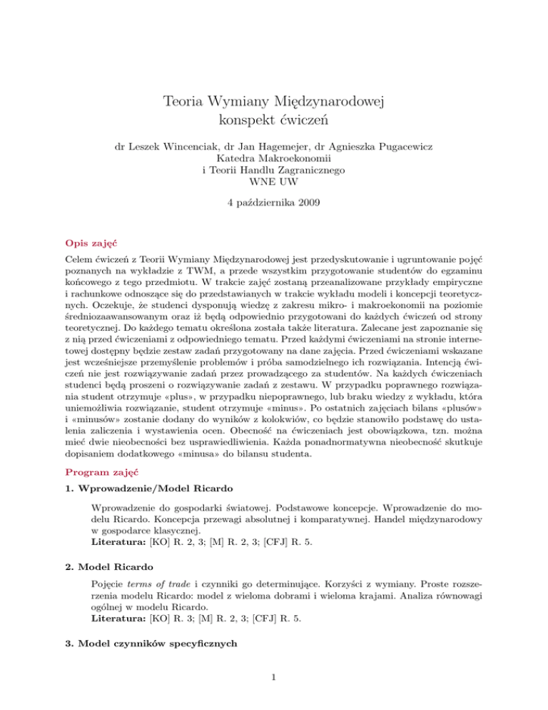 Teoria Wymiany Międzynarodowej konspekt ćwiczeń dr Leszek Wincenciak, dr Jan Hagemejer, dr Agnieszka Pugacewicz Katedra Makroekonomii i Teorii Handlu Zagranicznego WNE UW 4 października 2009 Opis zajęć Celem ćwiczeń z Teorii Wymiany Międzynarodowej jest przedyskutowanie i ugruntowanie pojęć poznanych na wykładzie z TWM, a przede wszystkim przygotowanie studentów do egzaminu końcowego z tego przedmiotu. W trakcie zajęć zostaną przeanalizowane przykłady empiryczne i rachunkowe odnoszące się do przedstawianych w trakcie wykładu modeli i koncepcji teoretycznych. Oczekuje, że studenci dysponują wiedzę z zakresu mikro- i makroekonomii na poziomie średniozaawansowanym oraz iż będą odpowiednio przygotowani do każdych ćwiczeń od strony teoretycznej. Do każdego tematu określona została także literatura. Zalecane jest zapoznanie się z nią przed ćwiczeniami z odpowiedniego tematu. Przed każdymi ćwiczeniami na stronie internetowej dostępny będzie zestaw zadań przygotowany na dane zajęcia. Przed ćwiczeniami wskazane jest wcześniejsze przemyślenie problemów i próba samodzielnego ich rozwiązania. Intencją ćwiczeń nie jest rozwiązywanie zadań przez prowadzącego za studentów. Na każdych ćwiczeniach studenci będą proszeni o rozwiązywanie zadań z zestawu. W przypadku poprawnego rozwiązania student otrzymuje «plus», w przypadku niepoprawnego, lub braku wiedzy z wykładu, która uniemożliwia rozwiązanie, student otrzymuje «minus». Po ostatnich zajęciach bilans «plusów» i «minusów» zostanie dodany do wyników z kolokwiów, co będzie stanowiło podstawę do ustalenia zaliczenia i wystawienia ocen. Obecność na ćwiczeniach jest obowiązkowa, tzn. można mieć dwie nieobecności bez usprawiedliwienia. Każda ponadnormatywna nieobecność skutkuje dopisaniem dodatkowego «minusa» do bilansu studenta. Program zajęć 1. Wprowadzenie/Model Ricardo Wprowadzenie do gospodarki światowej. Podstawowe koncepcje. Wprowadzenie do modelu Ricardo. Koncepcja przewagi absolutnej i komparatywnej. Handel międzynarodowy w gospodarce klasycznej. Literatura: [KO] R. 2, 3; [M] R. 2, 3; [CFJ] R. 5. 2. Model Ricardo Pojęcie terms of trade i czynniki go determinujące. Korzyści z wymiany. Proste rozszerzenia modelu Ricardo: model z wieloma dobrami i wieloma krajami. Analiza równowagi ogólnej w modelu Ricardo. Literatura: [KO] R. 3; [M] R. 2, 3; [CFJ] R. 5. 3. Model czynników specyficznych 1 Model czynników specyficznych. Korzyści z wymiany, implikacje dobrobytowe handlu, twierdzenie Haberlera. Literatura: [KO] R. 3 – tylko wydanie szóste lub starsze; [CFJ] R. 6. 4. Model Heckschera-Ohlina: część I Model Heckschera-Ohlina ze stałymi współczynnikami nakładów czynników produkcji – relatywna czynnikointensywność produkcji dóbr, relatywna obfitość wyposażenia w czynniki produkcji oraz kierunki specjalizacji i wymiany. Diagram Lernera. Twierdzenie StolperaSamuelsona i Rybczyńskiego. Literatura: [KO] R. 4; [M] R. 4–7; [CFJ] R. 7. 5. Model Heckschera-Ohlina: część II Model H-O w wersji ogólnej (technologia produkcji pozwalająca na substytucję czynników produkcji). Wyrównywanie się cen cen czynników produkcji. Diagram Lernera-Pearce’a. Analiza równowagi ogólnej. Literatura: [KO] R. 4, 5; [M] R. 4–7; [CFJ] R. 7. 6. Nowa teoria handlu: część I Koncepcja handlu wewnątrzgałęziowego (IIT). Mierzenie IIT (indeks Grubela-Lloyda) i problemy z tym związane. Model wzajemnego dumpingu (Brandera-Krugmana): znaczenie struktur rynkowych dla powstawania handlu wewnątrzgałęziowego. Literatura: [KO] R. 6; [M] R. 9; [JJM] R. 9 pkt. 1.2. 7. Nowa teoria handlu: część II Znacznie konkurencji niedoskonałej i korzyści skali produkcji. Model Krugmana – korzyści skali w ramach konkurencji monopolistycznej i zróżnicowanie produktów. Model DixitaStiglitza i dobrobytowe skutki handlu. Literatura: [KO] R. 6; [M] R. 10; [CFJ] R. 8 8. Kolokwium 1 9. Polityka handlowa: część I Polityka handlowa w warunkach doskonałej konkurencji (skutki stosowania cła w kraju małym i dużym – analiza cząstkowa i ogólna). Optymalna taryfa celna. Literatura: [JJM] R. 1, pkt. 1–6; [KO] R. 8; [M] R. 8; [CFJ] R. 11. 10. Polityka handlowa: część II Ograniczenia ilościowe i subwencje. Problem ekwiwalnetności cła, ograniczenia ilościowego i subwencji produkcyjnej. Literatura: [JJM] R. 1, pkt. 10; [JJM] R. 7, 8; 11. Polityka handlowa: część III Efektywna protekcja celna. Polityka handlowa w warunkach niedoskonałej konkurencji: porównanie skutków stosowania cła i kwoty w monopolu. Dumping. Literatura: [JJM] R. 1, pkt. 9; [JJM] R. 2, pkt. 2; [JJM] R. 7, pkt. 1.1–1.3; [JJM] R. 9; [KO] R. 8; [CFJ] R. 13. 2 12. Strategiczna polityka handlowa Strategiczna polityka handlowa: model Brandera-Spencer oraz Eatona-Grossmana. Literatura: [KO] R. 11; [JJM] R. 2, pkt. 3; [JJM] R. 8, pkt. 2; [M] R. 11. 13. Integracja gospodarcza Teoria unii celnej, efekty kreacji i przesunięcia handlu. Mobilność czynników produkcji, wspólny rynek czynników produkcji. Literatura: [JJM] R. 3, 5; [KO] R. 7. 14. Kolokwium 2 Literatura [CFJ]: Caves R., J. Frankel i R. Jones, Handel i finanse międzynarodowe, PWE, Warszawa 1998; [JJM]: Michałek J. J., Instrumenty polityki handlowej, mechanizmy ekonomiczne i regulacje międzynarodowe, PWN 2002; [KO]: Krugman P., M. Obstefld, Ekonomia międzynarodowa. Teoria i polityka, wydanie trzecie zmienione, Wydawnictwo Naukowe PWN, Warszawa 2007; [M]: Marrewijk Ch. Van, International Trade and the World Economy, Oxford University Press 2002; Zasady zaliczenia ćwiczeń z MSE Do zaliczenia ćwiczeń konieczne jest uczęszczanie na zajęcia (dopuszczalne są dwie nieusprawiedliwione nieobecności w semestrze) oraz uzyskanie w trakcie zajęć min. 50% punktów, które uzyskać można w czasie dwóch kolokwiów. Punkty za aktywność na ćwiczeniach («plusy» i «minusy» zostaną doliczone do punktów z kolokwiów) mogą u