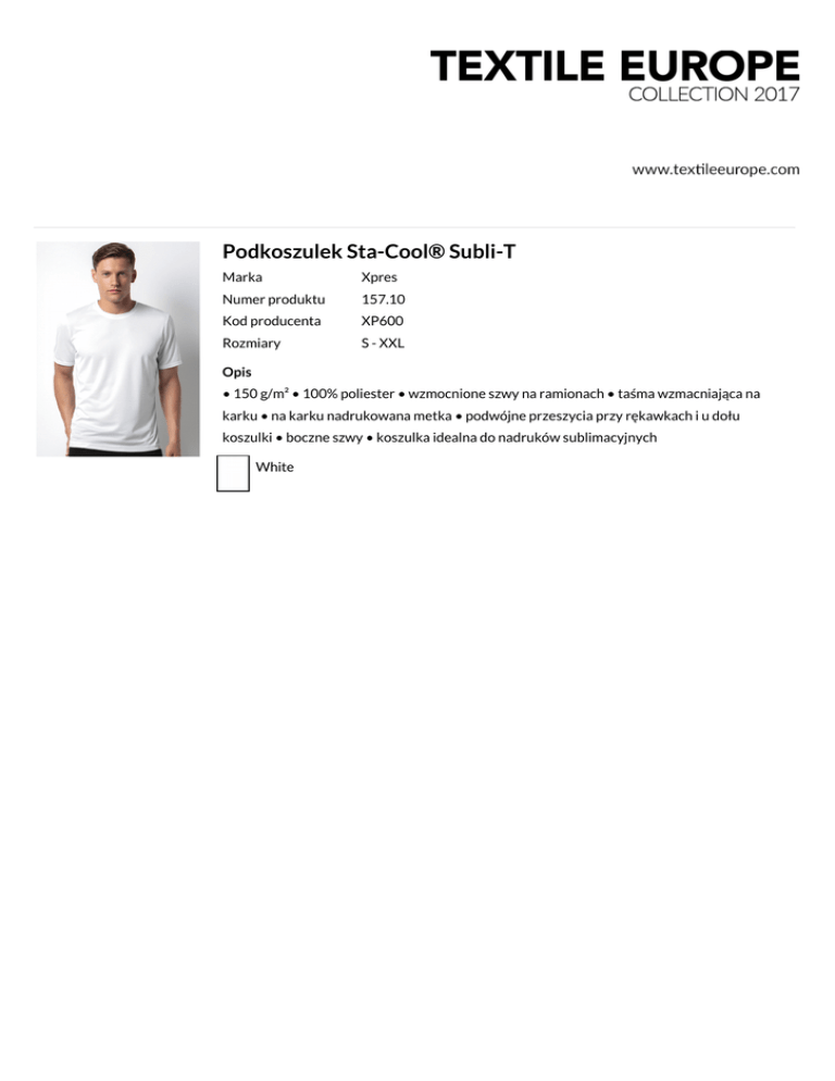 Podkoszulek Sta-Cool® Subli-T Marka Xpres Numer produktu 157.10 Kod producenta XP600 Rozmiary S - XXL Opis • 150 g/m² • 100% poliester • wzmocnione szwy na ramionach • taśma wzmacniająca na karku • na karku nadrukowana metka • podwójne przeszycia przy rękawkach i u dołu koszulki • boczne szwy • koszulka idealna do nadruków sublimacyjnych White