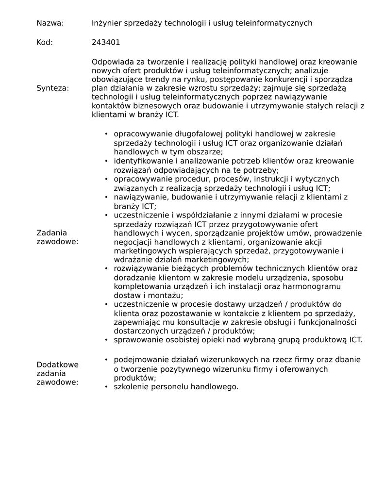 Nazwa: Inżynier sprzedaży technologii i usług teleinformatycznych Kod: 243401 Synteza: Odpowiada za tworzenie i realizację polityki handlowej oraz kreowanie nowych ofert produktów i usług teleinformatycznych; analizuje obowiązujące trendy na rynku, postępowanie konkurencji i sporządza plan działania w zakresie wzrostu sprzedaży; zajmuje się sprzedażą technologii i usług teleinformatycznych poprzez nawiązywanie kontaktów biznesowych oraz budowanie i utrzymywanie stałych relacji z klientami w branży ICT. Zadania zawodowe: • opracowywanie długofalowej polityki handlowej w zakresie sprzedaży technologii i usług ICT oraz organizowanie działań handlowych w tym obszarze; • identyfikowanie i analizowanie potrzeb klientów oraz kreowanie rozwiązań odpowiadających na te potrzeby; • opracowywanie procedur, procesów, instrukcji i wytycznych związanych z realizacją sprzedaży technologii i usług ICT; • nawiązywanie, budowanie i utrzymywanie relacji z klientami z branży ICT; • uczestniczenie i współdziałanie z innymi działami w procesie sprzedaży rozwiązań ICT przez przygotowywanie ofert handlowych i wycen, sporządzanie projektów umów, prowadzenie negocjacji handlowych z klientami, organizowanie akcji marketingowych wspierających sprzedaż, przygotowywanie i wdrażanie działań marketingowych; • rozwiązywanie bieżących problemów technicznych klientów oraz doradzanie klientom w zakresie modelu urządzenia, sposobu kompletowania urządzeń i ich instalacji oraz harmonogramu dostaw i montażu; • uczestniczenie w procesie dostawy urządzeń / produktów do klienta oraz pozostawanie w kontakcie z klientem po sprzedaży, zapewniając mu konsultacje w zakresie obsługi i funkcjonalności dostarczonych urządzeń / produktów; • sprawowanie osobistej opieki nad wybraną grupą produktową ICT. Dodatkowe zadania zawodowe: • podejmowanie działań wizerunkowych na rzecz firmy oraz dbanie o tworzenie pozytywnego wizerunku firmy i oferowanych produktów; • szkolenie personelu handlowego.