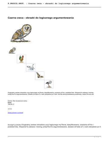 9.PRZYCZ.SKUT. : Czarna owca - obrazki do logicznego argumentowania Czarna owca - obrazki do logicznego argumentowania Oryginalny zestaw obrazków uczy logicznego my?lenia, klasyfikowania, szukania ró?nic i podobie?stw. Wspania?a zabawa i trening umiej?tno?ci argumentowania. Zestaw sk?ada si? z serii obrazków po 5 kart. Ka?da seria przedstawia przedmioty, zwierz?ta lub oso Ocena: Nie ma jeszcze oceny Cena 105,00 z? Zadaj pytanie o produkt Szczegó?y produktu Oryginalny zestaw obrazków uczy logicznego my?lenia, klasyfikowania, szukania ró?nic i podobie?stw. Wspania?a zabawa i trening umiej?tno?ci argumentowania. Zestaw sk?ada si? z serii obrazków po 5 1 / 2 9.PRZYCZ.SKUT. : Czarna owca - obrazki do logicznego argumentowania kart. Ka?da seria przedstawia przedmioty, zwierz?ta lub osoby, które na pierwszy rzut oka mo?na przyporz?dkowa? wspólnemu poj?ciu (np. ptaki). Zadaniem dzieci jest znalezienie 'czarnej owcy' - karty, która nie pasuje do pozosta?ych. Jednak?e karty zosta?y dobrane tak, ?e praktycznie ka?da karta mo?e zosta? przys?owiow? 'czarn? owc?', w zale?no?ci od obranych kryteriów i argumentacji. Obrazki mo?na porównywa? szukaj?c podobie?stw równie? pomi?dzy kartami z ró?nych serii. Praca z obrazkami jest doskona?ym ?wiczenie zdolno?ci wypowiedzi, uczy dyskusji. Szukanie podobie?stw i ró?nic rozwija spostrzegawczo?? i kreatywno?? dzieci. Zabawa z uk?adank? jest ciekawa zarówno dla m?odszych, jak i starszych dzieci. Zestaw obrazków mo?na wykorzysta? podczas ustnych lub pisemnych zaj?? j?zykowych, w tym w nauce j?zyka obcego. Zestaw mo?e pos?u?y? równie? w terapii j?zykowej. W zale?no?ci od obranej przez nauczyciela formy pracy, dzieci mog? pracowa? indywidualnie, w parach lub grupach. Zastosowanie: klasyfikowanie i ró?nicowanie wed?ug okre?lonych kryteriów precyzyjne formu?owanie wypowiedzi logiczne my?lenie trening spostrzegawczo?ci i kreatywno?ci Zawarto??: 15 serii po 5 obrazków ka?da 1 karta 'czarna owca' ??cznie 76 kart o wymiarze 9 x 9 cm umieszczone w trwa?ym kartonowym pude?ku instrukcja Cena przesy?ki ustalana indywidualnie Przed zamówieniem zapytaj o termin realizacji Termin realizacji zamówienia od 24h do 28 dni roboczych Opinie Nikt jeszcze nie ocenia? tego produktu. 2 / 2 Powered by TCPDF (www.tcpdf.org)