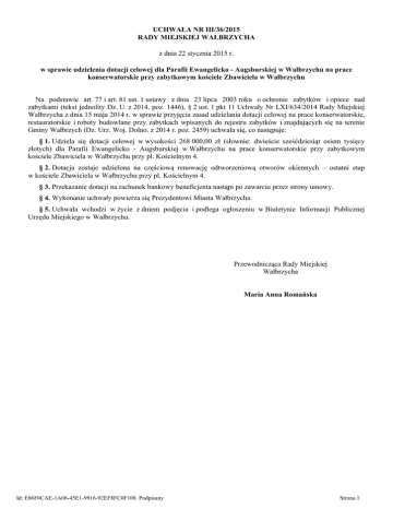 UCHWAŁA NR III/36/2015 RADY MIEJSKIEJ WAŁBRZYCHA z dnia 22 stycznia 2015 r. w sprawie udzielenia dotacji celowej dla Parafii Ewangelicko - Augsburskiej w Wałbrzychu na prace konserwatorskie przy zabytkowym kościele Zbawiciela w Wałbrzychu Na podstawie art. 77 i art. 81 ust. 1 ustawy z dnia 23 lipca 2003 roku o ochronie zabytków i opiece nad zabytkami (tekst jednolity Dz. U. z 2014, poz. 1446), § 2 ust. 1 pkt 11 Uchwały Nr LXI/634/2014 Rady Miejskiej Wałbrzycha z dnia 15 maja 2014 r. w sprawie przyjęcia zasad udzielania dotacji celowej na prace konserwatorskie, restauratorskie i roboty budowlane przy zabytkach wpisanych do rejestru zabytków i znajdujących się na terenie Gminy Wałbrzych (Dz. Urz. Woj. Dolno. z 2014 r. poz. 2459) uchwala się, co następuje: § 1. Udziela się dotacji celowej w wysokości 268 000,00 zł (słownie: dwieście sześćdziesiąt osiem tysięcy złotych) dla Parafii Ewangelicko - Augsburskiej w Wałbrzychu na prace konserwatorskie przy zabytkowym kościele Zbawiciela w Wałbrzychu przy pl. Kościelnym 4. § 2. Dotacja zostaje udzielona na częściową renowację odtworzeniową otworów okiennych – ostatni etap w kościele Zbawiciela w Wałbrzychu przy pl. Kościelnym 4. § 3. Przekazanie dotacji na rachunek bankowy beneficjenta nastąpi po zawarciu przez strony umowy. § 4. Wykonanie uchwały powierza się Prezydentowi Miasta Wałbrzycha. § 5. Uchwała wchodzi w życie z dniem podjęcia i podlega ogłoszeniu w Biuletynie Informacji Publicznej Urzędu Miejskiego w Wałbrzychu. Przewodnicząca Rady Miejskiej Wałbrzycha Maria Anna Romańska Id: E86F0CAE-1A06-45E1-9916-92EF8FC0F108. Podpisany Strona 1 Uzasadnienie Delegację prawną do udzielenia właścicielom zabytków pomocy finansowej przez Gminę Wałbrzych stanowi Uchwała Nr LXI/634/2014 Rady Miejskiej Wałbrzycha z dnia 15 maja 2014 roku w sprawie przyjęcia zasad udzielania dotacji celowej na prace konserwatorskie, restauratorskie i roboty budowlane przy zabytkach wpisanych do rejestru zabytków i znajdujących się na terenie Gminy Wałbrzych. W związku z w/w uchwałą, Zarządzeniem Nr 812/2014 Prezydenta Miasta Wałbrzycha powołano Komisję rozpatrującą wnioski o udzielenie dotacji celowych na prace konserwatorskie, restauratorskie i roboty budowlane przy zabytkach wpisanych do rejestru zabytków, położonych na terenie Gminy Wałbrzych. Komisja na posiedzeniu w dniu 13 listopada 2014 r. rekomendowała przyznanie dotacji jednogłośnie, w głosowaniu jawnym, bez uwag. Kościół Zbawiciela należy do Parafii Ewangelicko-Augsburskiej w Wałbrzychu i położony jest przy pl. Kościelnym 4. W miejscu, w którym dzisiaj stoi budowla sakralna, znajdowała się wcześniej świątynia, wzniesiona w pierwszej połowie XVIII wieku. Budowę kościoła Zbawiciela rozpoczęto w 1785 roku, a ukończono w 1788 roku. Budowlę zaprojektował Carl Gotthard Langhans, twórca także między innymi Bramy Brandenburskiej. Budowla kościoła wyróżnia się trzema emporami tj. galeriami wspartymi na kolumnach otwartych do wnętrza kościoła. Należy podkreślić, że wnętrze świątyni prawie wcale nie zmieniło się od czasów wybudowania. Kościół Ewangelicki przy pl. Kościelnym 4 został wpisany do rejestru zabytków nieruchomych 25 stycznia 1964 r.– nr rejestru A/4622/1052. Budynek położony jest również w granicach historycznego układu urbanistycznego dzielnicy Stare Miasto, wpisanego do rejestru zabytków 08.12.1977 r. pod numerem A/712/683/WŁ. W latach 2011-2014 Parafia Ewangelicko-Augsburska pozyskała na prace remontowe przy kościele Zbawiciela środki z Gminy Wałbrzych 25 299 zł. w 2011 r., 26 500 zł. w 2012 r., 32 860 zł. w 2013 r. i 64 623 zł. w 2014 r. Ze względu na swoją historyczną wartość oraz konieczność zakończenia wymiany okien, powyższy obiekt zasługuje na finansowe wsparcie. Przewodnicząca Rady Miejskiej Wałbrzycha Maria Anna Romańska Id: E86F0CAE-1A06-45E1-9916-92EF8FC0F108. Podpisany Strona 1