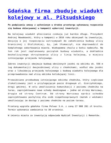 Gdańska firma zbuduje wiadukt kolejowy w al. Piłsudskiego Po podpisaniu umowy z wyłonionym w drodze przetargu wykonawcą rozpocznie się budowa obiecywanej w kampanii wyborczej inwestycji. Na kolejowy wiadukt płocczanie czekają już bardzo długo. Prezydent Andrzej Nowakowski, który w kampanii w 2010 roku obiecywał tę inwestycję, decyzję o jej rozpoczęciu wstrzymywał do zakończenia budowy ulicy Granicznej i Otolińskiej, by, jak tłumaczył, nie doprowadzić do kompletnego zakorkowania miasta. Wiekopomna chwila w końcu nadeszła. Na ten rok jest bezkolizyjnego zaplanowany początek skrzyżowania ulicy budowy z linią wiaduktu, a kolejową, dokładnie w miejscu istniejącego przejazdu kolejowego. Zakres inwestycji obejmuje budowę obniżonych jezdni na odcinku ok. 556 m (wg dokumentacji) dwujezdniowej ulicy z chodnikami, wzdłuż obu jezdni wraz z likwidacją przejazdu kolejowego i budową wiaduktu kolejowego dla przeprowadzenia nad ulicą odcinka kolidującej linii. Przewidziano przebudowę istniejącego odcinka chodnika, który częściowo zlokalizowany jest w przylegającym pasie drogowym ul. Gierzyńskiego, drogi gminnej. W celu umożliwienia komunikacji z poziomu chodnika na taras, zaprojektowano nowe schody dwubiegowe – jedne od strony Warszawy, drugie od strony Centrum. Od strony Warszawy oprócz schodów zaprojektowano pochylnię dla osób niepełnosprawnych (matek z wózkami) umożliwiając im dostęp z poziomu chodnika na poziom tarasu. Przetarg wygrała gdańska firma Polwar S.A. z ceną 27 988 281 zł brutto. Termin wykonania zamówienia to 30 września. W imieniu miasta za inwestycję odpowiada Wydział Inwestycji i Remontów.