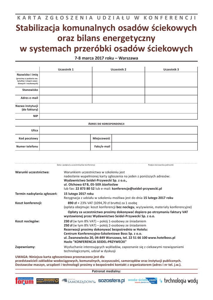 KARTA ZGŁOSZENIA UDZIAŁU W KONFERENCJI Stabilizacja komunalnych osadów ściekowych oraz bilans energetyczny w systemach przeróbki osadów ściekowych 7-8 marca 2017 roku – Warszawa Uczestnik 1 Uczestnik 2 Uczestnik 3 Nazwisko i imię (prosimy o podanie ew. tytułów i stopni zawodowych i naukowych) Stanowisko Adres e-mail Nazwa instytucji (do faktury) NIP Adres do korespondencji Ulica Kod pocztowy Miejscowość Numer telefonu Faks/e-mail .................................................................................................................................................................................. Data i podpis/y uczestnika/ów konferencji Podpis kierownika jednostki Warunki uczestnictwa: Termin nadsyłania zgłoszeń: Koszt konferencji: Koszt noclegów: Zapewniamy: Warunkiem uczestnictwa w szkoleniu jest nadesłanie wypełnionej karty zgłoszenia na jeden z poniższych adresów: Wydawnictwo Seidel-Przywecki Sp. z o.o., ul. Olchowa 67 B, 05-509 Józefosław lub fax: 22 873 80 52 lub e-mail: [email protected] 15 lutego 2017 roku Rezygnacja z udziału w szkoleniu możliwa jest do dnia 15 lutego 2017 roku 890 zł + 23% VAT (1094,70 zł brutto) za 1 osobę (opłata obejmuje: koszt konferencji bez noclegu, wyżywienie, materiały konferencyjne) Opłaty za uczestnictwo prosimy dokonywać dopiero po otrzymaniu faktury VAT wystawionej przez Wydawnictwo Seidel-Przywecki Sp. z o.o. 230 zł (w tym 8% VAT) – pokój 1-osobowy ze śniadaniem 250 zł (w tym 8% VAT) – pokój 2-osobowy ze śniadaniem Rezerwacji prosimy dokonywać bezpośrednio w Hotelu: Centrum Konferencyjno-Szkoleniowe Boss Sp. z o.o. ul. Żwanowiecka 20, 04-849 Warszawa, tel. 22 51 66 100 www.hotelboss.pl Hasło "KONFERENCJA SEIDEL-PRZYWECKI" Wysłuchanie interesujących wykładów, zapoznanie się z ciekawymi rozwiązaniami technologicznymi, udział w dyskusji UWAGA: Niniejsza karta zgłoszeniowa przeznaczona jest dla przedstawicieli zakładów wodociągowych, komunalnych, oczyszczalni, samorządów oraz instytucji publicznych. Dostawców maszyn, urządzeń i technologii prosimy o bezpośredni kontakt z organizatorem (adres i nr tel. j.w.). Patronat medialny:
