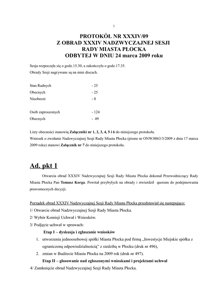 1 PROTOKÓŁ NR XXXIV/09 Z OBRAD XXXIV NADZWYCZAJNEJ SESJI RADY MIASTA PŁOCKA ODBYTEJ W DNIU 24 marca 2009 roku Sesja rozpoczęła się o godz.15.30, a zakończyła o godz.17.35. Obrady Sesji nagrywane są na mini discach. Stan Radnych - 25 Obecnych - 25 Nieobecni -0 Osób zaproszonych - 124 Obecnych - 49 Listy obecności stanowią Załączniki nr 1, 2, 3, 4, 5 i 6 do niniejszego protokołu. Wniosek o zwołanie Nadzwyczajnej Sesji Rady Miasta Płocka (pismo nr ONW.0063/3/2009 z dnia 17 marca 2009 roku) stanowi Załącznik nr 7 do niniejszego protokołu. Ad. pkt 1 Otwarcia obrad XXXIV Nadzwyczajnej Sesji Rady Miasta Płocka dokonał Przewodniczący Rady Miasta Płocka Pan Tomasz Korga. Powitał przybyłych na obrady i stwierdził quorum do podejmowania prawomocnych decyzji. Porządek obrad XXXIV Nadzwyczajnej Sesji Rady Miasta Płocka przedstawiał się następująco: 1/ Otwarcie obrad Nadzwyczajnej Sesji Rady Miasta Płocka. 2/ Wybór Komisji Uchwał i Wniosków. 3/ Podjęcie uchwał w sprawach: Etap I – dyskusja i zgłaszanie wniosków 1. utworzenia jednoosobowej spółki Miasta Płocka pod firmą „Inwestycje Miejskie spółka z ograniczoną odpowiedzialnością” z siedzibą w Płocku (druk nr 496), 2. zmian w Budżecie Miasta Płocka na 2009 rok (druk nr 497). Etap II – głosowanie nad zgłoszonymi wnioskami i projektami uchwał 4/ Zamknięcie obrad Nadzwyczajnej Sesji Rady Miasta Płocka. 2 Ad. pkt 2 Do składu Komisji Uchwał i Wniosków zostali zaproponowani: Pani Radna Grażyna Cieślik (zgłoszenia dokonała Pani Radna Wioletta Kulpa) oraz Pani Radna Magdalena Lewandowska (zgłoszenia dokonał Pan Radny Piotr Nowicki). Radne wyraziły zgodę na kandydowanie do składu Komisji Uchwał i Wniosków. W wyniku jednomyślnego głosowania (25 głosów za) Komisja Uchwał i Wniosków została powołana w proponowanym składzie. Komisja Uchwał i Wniosków : − Pani Radna Grażyna Cieślik, − Pani Radna Magdalena Lewandowska. Ad. pkt 3 Etap I – dyskusja i zgłaszanie wniosków Projekty uchwał w sprawach: 1. utworzenia jednoosobowej spółki Miasta Płocka pod firmą „Inwestycje Miejskie spółka z ograniczoną odpowiedzialnością” z siedzibą w Płocku (druk nr 496) Pan Dariusz Zawidzki Zastępca Prezydenta Miasta Płocka powiedział: „Panie Przewodniczący! Wysoka Rado! Szanowni Państwo! Występujemy z taką inicjatywą, aby utworzyć jednoosobową spółkę z o.o., w której 100% udziałów będzie posiadało miasto. Spółka w oparciu o przekazywany majątek rzeczowy wykonywała będzie zadania własne miasta, czyli to, co Państwo uchwalicie w wieloletnich planach inwestycyjnych i w budżecie, tylko te zadania będą wykonywane rękoma spółki. Ponadto spółka będzie mogła, w oparciu o istniejące przepisy, przystępować na zasadach rynkowych do przetargów ograniczonych o prowadzenie inwestorstwa zastępczego, znaczy wszelki rodzaj przetargów. [...] Po co ta spółka – generalnie chodzi o to, żeby, to wyjaśniałem już przed poprzednią sesją, gdzie uzasadnienie ekonomiczne znajdujemy w postaci takiej, że spółka może rozliczyć się z podatku VAT, czego miasto dokonywać nie może. To jest po pierwsze. Po drugie - zasoby kadrowe spółki mogą być lepiej wynagradzane, bo nie będą w żaden 3 sposób ograniczone zapisami z innych ustaw. Na przykład ustawa kominowa, gdzie urzędnikowi, tak naprawdę, nie można więcej zapłacić. A wiemy dzisiaj, że uprawnieni fachowcy, specjaliści z uprawnieniami, bardzo często opuszczają nasze szeregi, będąc, po prostu podkupowanymi przez inne firmy działające na rynku. Chcielibyśmy tego uniknąć. A ponieważ wiadomo, że zadań inwestycyjnych w budżecie i w wieloletnim planie inwestycyjnym mamy bardzo dużo, to ktoś musi ich dopilnować. Taka jest intencja powołania tej spółki. Zresztą omawialiśmy to na komisjach przed poprzednią sesją. Także tytułem wstępu tyle. Dziękuję.” Pan Radny Artur Jaroszewski Wiceprzewodniczący Rady Miasta Płocka powiedział: „Panie Przewodniczący! Panowie Prezydenci! Szanowni Państwo! Panie Prezydencie, pytania, które padły na poprzedniej sesji, na które nie uzyskaliśmy odpowiedzi, powtórzę. Jakie nieruchomości, jaki majątek planujecie Państwo wprowadzić do tej spółki? Czytając dalej – jakie przedsięwzięcia inwestycyjne w Państwa pojęciu ta spółka miałaby realizować? Dziękuję.” Pan Radny Krzysztof Buczkowski powiedział: „Panie Prezydencie! Panie Przewodniczący! Szanowni Państwo! Ja w odniesieniu do uzasadnienia, które otrzymaliśmy ponownie do tego projektu uchwały o powołaniu spółki, chciałbym zapytać jak mocno opierano się na doświadczeniach tych miast, które zostały wskazane w uzasadnieniu, czyli: Gdańsk, Poznań, Wrocław i Zabrze, ponieważ z mojego rozpoznania, które przeprowadziłem, w tym miastach w większości te spółki działają niezbyt długo. Szczególnie w Zabrzu, gdzie powołano spółkę w listopadzie 2008 roku, czyli tak naprawdę, znajduje się ona jeszcze w organizacji. Czyli czerpanie z doświadczeń spółki, która znajduje się w organizacji, jest trochę kuriozalne, prawda, bo jeszcze nie zrealizowała żadnej inwestycji. Kolejna spółka, która funkcjonuje w Gdańsku, to spółka inwestycyjna, ale celowa, czyli powołana do realizacji inwestycji związanych z organizacją Euro 2012. Nawet, jak podkreślają inicjatorzy i pomysłodawcy tej spółki w Gdańsku, ma ona zostać rozwiązana wraz z rokiem 2012, czyli ze zrealizowaniem wszystkich zamierzeń dotyczących Euro 2012. Przy czym, co znamienne, powstały tam dwie spółki celowe. Jedna ma realizować inwestycje drogowe, a budową stadionu Baltic Arena ma zająć się zupełnie inna spółka, bo nie ma do końca jednoznacznej opinii prawnej czy samorząd może zlecać bezprzetargowo inwestycje tak zwane kubaturowe. Przynajmniej taką informację otrzymałem we Wrocławiu, gdzie ta spółka działa najdłużej, prawie dwa lata