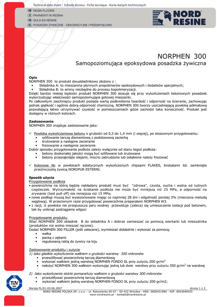 Technical data sheet - Scheda tecnica - Fiche tecnique - Karta danych technicznych RESIN FLOORS PAVIMENTI IN RESINA SOLS EN RÉSINE POSADZKI ŻYWICZNE - DEKORACYJNE I PRZEMYSŁOWE NORPHEN 300 Samopoziomująca epoksydowa posadzka żywiczna Opis NORPHEN 300 to produkt dwuskładnikowy złożony z : • Składnika A: to mieszanina płynnych prepolimerów epoksydowych i dodatków specjalnych; • Składnika B: to aminy niezbędne do procesu kopolimeryzacji. Dzięki bardzo niskiej lepkości produkt NORPHEN 300 stosuje się przy wykończeniach betonowych posadzek wykorzystując właściwości samopoziomujące gotowej mieszanki. Po całkowitym zaschnięciu produkt posiada wartą podkreślenia twardość i odporność na ścieranie, zachowując jednak giętkość i ogólnie dobrą odporność chemiczną. NORPHEN 300 tworzy uszczelniającą powłokę półmatową pozwalającą łatwo utrzymywać czystość w pomieszczeniach gdzie zachodzi taka konieczność. Produkt jest dostępny w różnych kolorach. Zastosowanie NORPHEN 300 znajduje zastosowanie jako: Powłoka wykończeniowa betonu o grubości od 0,3 do 1,4 mm (i więcej), po stosownym przygotowaniu: • szlifowanie tarczą diamentową z podstawową zacierką • śrutowanie a następne zacieranie • frezowanie a następnie zacieranie Dobór sposobu przygotowania podłoża zależy wyłącznie od stanu tegoż podłoża: • betony doskonałej jakości mogą być szlifowane lub śrutowane • betony przesiąknięte olejami, mocno zabrudzone lub osłabione należy frezować Kolorowe tło w powłokach estetycznych wykończonych chipsami FLAKES, brokatami itd. zamknięte przeźroczystą żywicą NORDPUR ESTERNI. Sposób użycia Przygotowanie podłoża • powierzchnia na którą będzie nakładany produkt musi być “zdrowa”, czysta, sucha i wolna od luźnych cząsteczek. Wytrzymałość na ściskanie podłoża nie może być mniejsza niż 25 MPa, a odporność na zrywanie (test pull off) nie mniejsza niż 15 MPa; • nowe podłogi muszą być wysezonowane mając co najmniej 28 dni i wilgotność poniżej 3% (mierzona metodą węglową). W przeciwnym razie przygotować powierzchnie preparatem NORPHEN W3. • z racji, iż powłoka nie przepuszcza pary wodnej przewiduje (zaleca) się umieszczenie izolacji pod betonem, tak by uniknąć podciągania wilgoci Przygotowanie produktu Wlać NORPHEN 300 składnik B do składnika A i dobrze zamieszać za pomocą wiertarki lub mieszalnika (produktów nie wolno mieszać ręcznie). Dodać NORPHEN 300 FILLER (jeśli zalecane), wymieszać dokładnie i wykonać za pomocą: • wałka • packą z zębami • regulowaną raklą do żywicy na kiju Zastosowanie produktu i zużycie 1) Jako gładkie wykończenie wałkiem o grubości warstwy 300 mikronów • przeszlifować powierzchnię tarczą diamentową • wykonać wałkiem jedną warstwę NORPHEN FONDO SL przy zużyciu 200 gr/m2 • nałożyć NORPHEN 300 wałkiem wykonując jedną lub dwie warstwy przy zużyciu 350 gr/m2 na warstwę 2) Jako wykończenie skórki pomarańczy wałkiem o grubości warstwy 300 mikronów • przeszlifować powierzchnię tarczą diamentową • wykonać wałkiem jedną warstwę NORPHEN FONDO SL przy zużyciu 200 gr/m2; Wersja PL/01-03.06.2007 strona 1 z 3 NORD RESINE POLSKA SP. z o.o. - ul. Rakowiecka 65-67 - 50-422 Wrocław - KRS: 0000431984 - NIP: 8943040425 www.nordresine.pl - [email protected] Technical data sheet - Scheda tecnica - Fiche tecnique - Karta danych technicznych RESIN FLOORS PAVIMENTI IN RESINA SOLS EN RÉSINE POSADZKI ŻYWICZNE - DEKORACYJNE I PRZEMYSŁOWE NORPHEN 300 Samopoziomująca epoksydowa posadzka żywiczna • nałożyć NORPHEN 300 wałkiem wykonując jedną lub dwie warstwy przy zużyciu 350 gr/m2 na warstwę dodając na warstwę wykończeniową od 1,5 do 2 % krzemionki SILICE 3) Jako wykończenie samopoziomujące o grubości 1 mm przeszlifować powierzchnię tarczą diamentową wykonać wałkiem jedną warstwę NORPHEN FONDO SL przy zużyciu 500 gr/m2 wzbogaconym w proporcji 1:1 piaskiem SABBIA DI QUARZO 0,1-0,3; przygotować NORPHEN 300 (A+B), dodać 40 % względem wagi preparatu NORPHEN 300 FILLER, zastosować na sposób samopoziomujący i regulować za pomocą pacy zębatej i stalowego wałka tak by zużycie mieszanki (A+B+C) wyniosło 1,4 kg/m2 4) Jako wykończenie o grubości powyżej 1,5 mm przeszlifować powierzchnię tarczą diamentową lub prześrutować; wykonać wałkiem jedną warstwę NORPHEN FONDO SL przy zużyciu 500 gr/m2 wzbogaconym w proporcji 1:1 piaskiem SABBIA DI QUARZO 0,1-0,3 przygotować NORPHEN 300 (A+B), dodać 100 % względem wagi piasek SABBIA DI QUARZO 0,1-0,3, zastosować na sposób samopoziomujący i regulować za pomocą paki zębatej i stalowego wałka tak by zużycie mieszanki (A+B+C) wyniosło 2,8 kg/m2 5) Jako wykończenie o grubości powyżej 4 mm przeszlifować powierzchnię tarczą diamentową lub prześrutować; wykonać wałkiem jedną warstwę NORPHEN FONDO SL przy zużyciu 500 gr/m2 wzbogaconym w proporcji 1:1 piaskiem SABBIA DI QUARZO 0,1-0,3 przygotować NORPHEN 300 (A+B), dodać 100 % względem wagi piasek SABBIA DI QUARZO 0,1-0,3, zastosować na sposób samopoziomujący i regulować za pomocą paki zębatej i stalowego wałka tak by zużycie mieszanki (A+B+C) wyniosło 2,8 kg/m2; obsypać piaskiem 0,3-0,9 i usunąć nadmiar, przeszlifować papierem ściernym, odkurzyć i wykonać warstwę finalną produktem NORPHEN 300 zużywając 0,7 kg/m2. Ostrzeżenia i specjalne zalecenia • Dodanie rozpuszczalników do NORPHEN 300 może ułatwić aplikację produktu, ale może również obniżyć odporność chemiczną oraz zmniejszyć końcowy połysk powierzchni. • Kolejne warstwy kłaść od 12 do 72 godzin od momentu położenia warstwy poprzedniej • W okresach zimowym niska temperatura podwyższa lepkość produktu utrudniając nałożenie produktu za pomocą wałka oraz dając matowy końcowy efekt. Przed zmieszaniem składników trzymać produkt w ocieplanym p
