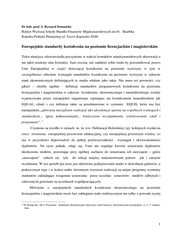 Dr hab. prof. S. Ryszard Domański Rektor Wyższej Szkoły Handlu Finansów Międzynarodowych im Fr. Skarbka Katedra Polityki Pieniężnej (d. Teorii Kapitału) SGH Europejskie standardy kształcenia na poziomie licencjackim i magisterskim Tekst niniejszy odzwierciedla poczynione w trakcie kontaktów międzynarodowych obserwacji a nie jakiś ustalony stan formalny. Sam zresztą nie zadałem sobie trudu by przestudiować prawo Unii Europejskiej w części dotyczącej kształcenia na poziomie wyższym, w tym w szczególności odnośnie wymagań standardów kształcenia na poziomie wyższym w zakresie nauk ekonomicznych definiujących te studia właśnie jako takie. Nie mam też pewności, czy jakieś – choćby zgubne - definicje standardów programowych kształcenia na poziomie licencjackim i magisterskim w zakresie kształcenia ekonomicznego i menedżerskiego zostały wypracowane przez europejskie organizacje zajmujące się kształceniem menedżerskim jak EQUAL, efmd, i czy definicje takie są przedstawione w systemie EQUIS, który ma być europejskim „głównym narzędziem realizacji idei akredytacji opartej na wspólnych wymogach i standardach,... [przy jednoczesnym]... koniecznym uwzględnianiu zróżnicowania szkół i programów”. 1 Czynione są wysiłki w ramach m. in. tzw. Deklaracji Bolońskiej i jej kolejnych wydań na rzecz tworzenia europejskiej przestrzeni edukacyjnej, czy europejskiej przestrzeni wiedzy, co ma w przyszłości doprowadzić do pełnej porównywalności wymagań i ekwiwalentności dyplomów. Na razie jednak, zdaje się, Unia nie reguluje kwestii uznawania dyplomów ukończenia studiów, pozostając przy ogólnej zachęcie do uznawania ich nawzajem – gdzie „nawzajem” odnosi się tyle do relacji między ministerstwami państw jak i samymi uczelniami. W ten sposób już teraz jest ułatwione podejmowanie nauki w dowolnym państwie, a praktycznym tego i w końcu nader skromnym wyrazem realizacji są unijne programy wymiany studentów zakładające wzajemne uznawanie przez uczelnie semestrów studiów odbytych i zaliczonych gościnnie na uczelniach współpracujących.. Mówienie o europejskich standardach kształcenia ekonomicznego na poziomie licencjackim i magisterskim może być zabiegiem mało realistycznym nie tylko z powodu wyżej 1 M. Ratajczak, AE w Poznaniu, Standardy akredytacyjne dotyczące szkół biznesu: doświadczenia europejskie. ss. 5, 7. mimeo, bdw. 1 wymienionych przyczyn o formalno prawnym charakterze. Jest tak również ze względu na praktykę kształcenia z zakresu ekonomii i zarządzania demonstrującą się w fakcie działania i funkcjonowania na mniej lub bardziej regulowanym i upaństwowionym rynku edukacyjnym państw unijnych – całego spectrum uczelni wyższych oferujących programy studiów i stawiających wymagania na bardzo zróżnicowanym poziomie, a jednak przyznających tak samo brzmiące tytuły zawodowe – bachelor, licenciate, master i odpowiadające im dyplomy ukończenia studiów wyższych. Praktyka ta znajduje swoje usprawiedliwienie w przekonaniu, że „coraz trudniej jest opracowywać standardy dotyczące programów, tak aby uniknąć zarzutu dążenia do nadmiernej unifikacji”2 Stawianie kwestii europejskich standardów kształcenia ekonomicznego i biznesowego, nie jest jednak, wbrew podniesionym tu zastrzeżeniom, zadaniem bez perspektyw, gdyż nie idzie o poszukiwanie i ustalenie jakiegoś jednego kompleksowego wzorca obejmującego pełne programy studiów, (co byłoby szkodliwe choćby właśnie z uwagi na niebezpieczeństwo nadmiernej unifikacji programów) lecz o zdefiniowanie poziomu wiedzy bazowej. Gdy idzie zaś o poziom bazowej wiedzy ekonomicznej jako wspólnej podstawy do porozumiewania się osób w przedmiocie, w dobie oczywistego pogłębiania się kontaktów między krajami, organizacjami gospodarczymi i ludźmi, to sytuacja wygląda zgoła inaczej. W tym aspekcie, właśnie ze względu na praktykę kształcenia w zakresie ekonomii i zarządzania podnoszenie kwestii europejskiego standardu poziomu kształcenia ma charakter swój realistyczny o tyle o ile - po pierwsze określone poziomy są realizowane jako takie przez uniwersytety co do których wiodącej roli w nauce i dydaktyce istnieje powszechna zgoda, - po drugie istnieje w miarę powszechna zgoda co przez takie poziomy rozumie się i brak ich realizacji powinien spychać uczelnie do podrzędnych miejsc w ocenie pracodawców i kandydatów - po trzecie poziomy kształcenia i osiągniętej przez absolwentów wiedzy mają znaczenie dla ich ubiegania się o miejsce w międzyosobowym podziale pracy - po czwarte – i to już w połączeniu z kryteriami oceny stosowanymi przez prowadzących rankingi, Państwową Komisje Akredytacyjną, Sekcję Uczelni 2 Tamże s.3. 2 Ekonomicznych Rady Głównej - otwierają pole ekspansji uczelniom zagranicznym na rynek polski Przesłanki realizacji europejskich standardów kształcenia licencjackim i magisterskim. na poziomie Ze strategicznego punktu widzenia chwili uwagi wymaga aspekt trzeci tzn. wpływu jaki poziomy kształcenia i osiągniętej przez absolwentów wiedzy mają na ich ubiegania się o miejsce w międzyosobowym podziale pracy. W tym miejscu zwróćmy uwagę, że budujemy Polskę zintegrowaną z euro-atlantyckimi strukturami politycznymi i chcemy tworzyć gospodarkę, która pozwala wypełniać aspiracje narodowe i osobiste. Aspiracje realizuje się w warunkach miejsca w międzynarodowym i międzyosobowym podziale pracy i w warunkach systemu społecznogospodarczego, który pozwala, albo nie pozwala, aspiracje artykułować i realizować. Miejsce w międzynarodowym i międzyosobowym podziale pracy zdobywa się w ostrej konkurencji między państwami, firmami i osobami - konkurencji o władzę i wpływy, o zyski, o stanowiska, o dochody. Razem to wszystko oznacza (mimo rzucanych wyzwań, których wyrazem – trzymając proporcje jest zarówno atak na World Trade Center w świecie, jak i prze