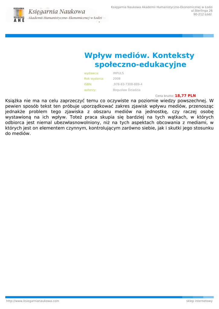 Księgarnia Naukowa Akademii Humanistyczno-Ekonomicznej w Łodzi ul.Sterlinga 26 90-212 Łódź Wpływ mediów. Konteksty społeczno-edukacyjne wydawca: IMPULS Rok wydania: 2008 ISBN: ,978-83-7308-889-4 autorzy: Bogusław Dziadzia Cena brutto: 18,77 PLN Książka nie ma na celu zaprzeczyć temu co oczywiste na poziomie wiedzy powszechnej. W pewien sposób tekst ten próbuje uporządkować zakres zjawisk wpływu mediów, przenosząc jednakże problem tego zjawiska z obszaru mediów na jednostkę, czy raczej osobę wystawioną na ich wpływ. Toteż praca skupia się bardziej na tych wątkach, w których odbiorca jest niemal ubezwłasnowolniony, niż na tych aspektach obcowania z mediami, w których jest on elementem czynnym, kontrolującym zarówno siebie, jak i skutki jego stosunku do mediów. http://www.ksiegarnianaukowa.com sklep internetowy