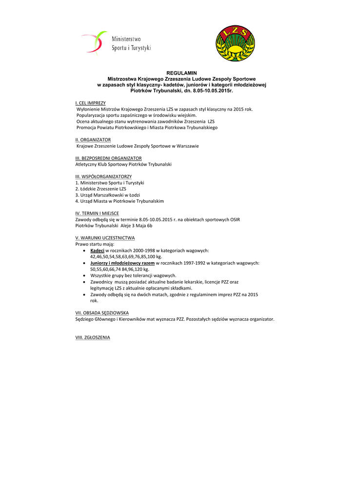 REGULAMIN Mistrzostwa Krajowego Zrzeszenia Ludowe Zespoły Sportowe w zapasach styl klasyczny- kadetów, juniorów i kategorii młodzieżowej Piotrków Trybunalski, dn. 8.05-10.05.2015r. I. CEL IMPREZY Wyłonienie Mistrzów Krajowego Zrzeszenia LZS w zapasach styl klasyczny na 2015 rok. Popularyzacja sportu zapaśniczego w środowisku wiejskim. Ocena aktualnego stanu wytrenowania zawodników Zrzeszenia LZS Promocja Powiatu Piotrkowskiego i Miasta Piotrkowa Trybunalskiego II. ORGANIZATOR Krajowe Zrzeszenie Ludowe Zespoły Sportowe w Warszawie III. BEZPOSREDNI ORGANIZATOR Atletyczny Klub Sportowy Piotrków Trybunalski III. WSPÓŁORGANIZATORZY 1. Ministerstwo Sportu i Turystyki 2. Łódzkie Zrzeszenie LZS 3. Urząd Marszałkowski w Łodzi 4. Urząd Miasta w Piotrkowie Trybunalskim IV. TERMIN I MIEJSCE Zawody odbędą się w terminie 8.05‐10.05.2015 r. na obiektach sportowych OSIR Piotrków Trybunalski Aleje 3 Maja 6b V. WARUNKI UCZESTNICTWA Prawo startu mają: Kadeci w rocznikach 2000‐1998 w kategoriach wagowych: 42,46,50,54,58,63,69,76,85,100 kg. Juniorzy i młodzieżowcy razem w rocznikach 1997‐1992 w kategoriach wagowych: 50,55,60,66,74 84,96,120 kg. Wszystkie grupy bez tolerancji wagowych. Zawodnicy muszą posiadać aktualne badanie lekarskie, licencje PZZ oraz legitymację LZS z aktualnie opłacanymi składkami. Zawody odbędą się na dwóch matach, zgodnie z regulaminem imprez PZZ na 2015 rok. VII. OBSADA SĘDZIOWSKA Sędziego Głównego i Kierowników mat wyznacza PZZ. Pozostałych sędziów wyznacza organizator. VIII. ZGŁOSZENIA Zgłoszenia ilościowe uczestników każdej drużyny z osobami towarzyszącymi (w celu zapewnienia posiłków i noclegu) prosimy przesyłać na e‐mail: [email protected] lub tel/fax: 44 732 70 17 w nieprzekraczalnym terminie do 4.05.2015r. Po upływie w/w terminu organizator nie gwarantuje rezerwacji miejsc noclegowych. Obowiązuje elektroniczny system zgłaszania zawodników do zawodów przez panel PZZ. IX. NAGRODY Zawodnicy za miejsca I‐III otrzymują medale i dyplomy. Kluby i województwa za miejsca I‐III otrzymują puchary. X KOSZTY UCZESTNICTWA Bezpośredni organizator tzn. Atletyczny Klub Sportowy zobowiązuje się do zabezpieczenia wyżywienia i zakwaterowania uczestników po otrzymaniu zamówienia zgodnie z poniższymi zasadami: Koszt zakwaterowania wynosi : – 40zł/doba. Koszt całodziennego wyżywienia 45zł/doba. Krajowe Zrzeszenie LZS dofinansowuje wyżywienie w stawce 20 zł / dwadzieścia zł./ dziennie dla zawodnika Zamawiający zakwaterowanie i wyżywienie będą obciążeni pełnymi kosztami zgodnie ze złożonym zamówieniem. XI. SPRAWY RÓŻNE Za szkody powstałe w wyniku korzystania z miejsc noclegowych obciążony zostanie klub w nim zakwaterowany. Organizator nie ponosi odpowiedzialności z tytułu ubezpieczenia zawodników, kradzieży, uszkodzeń czy zagubienia sprzętu w trakcie zawodów. Punktacja zespołowa wg klucza I‐9; II‐7; III 2x6; V 2x4; VII‐3; VIII‐2; Punkty te zaliczana będą do współzawodnictwa mistrzostw KZ LZS za 2015r. Organizator zastrzega sobie prawo interpretacji w sprawach nieujętych niniejszym regulaminem. XII. PROGRAM ZAWODÓW 8.05.2015 (piątek) do godz. 16.00 – przyjazd ekip OSIR Piotrków Trybunalski Aleje 3 Maja 6b 17.00‐17.30 – weryfikacja zawodników – Hala Sportowa OSIR 17.30 – konferencja techniczna – Hala Sportowa OSIR Aleje 3 Maja 6b 18.00‐19.00 – waga zawodników oraz przegląd lekarski j / w 9.05.2015 (sobota) 9.30‐13.30 – walki eliminacyjne 13.30‐16.00 – przerwa obiadowa 16.00‐16.15 – uroczyste otwarcie zawodów 16.15‐19.00 – walki eliminacyjne 10.05.2015 (niedziela) 9.30‐12.00 – walki eliminacyjne i finałowe oraz dekoracje zwycięzców 12.00 – zakończenie zawodów Krajowe Zrzeszenie Ludowe Zespoły Sportowe