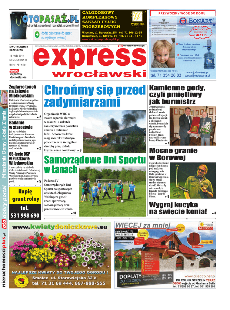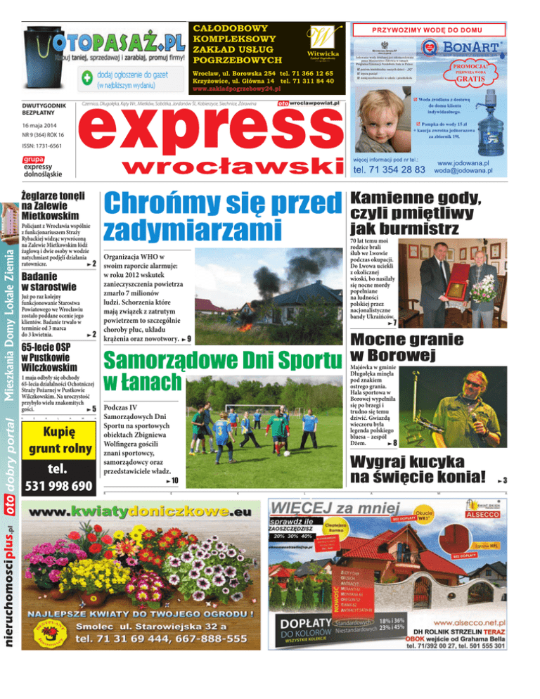 &$â2'2%2:< .203/(.62:< =$.â$'86â8* 32*5=(%2:<&+ :URFãDZXO%RURZVNDWHO .U]\İRZLFHXO*ãyZQDWHO ZZZ]DNODGSRJU]HERZ\SO Czernica, Długołęka, Kąty Wr., Mietków, Sobótka, Jordanów Śl., Kobierzyce, Siechnice, Żórawina DWUTYGODNIK BEZPŁATNY wroclawpowiat pl 16 maja 2014 NR 9 (364) ROK 16 ISSN: 1731-6561 grupa expressy dolnośląskie dobry portal Mieszkania Domy Lokale Ziemiaa Żeglarze tonęli na Zalewie Mietkowskim Policjant z Wrocławia wspólnie z funkcjonariuszem Straży Rybackiej widząc wywróconą na Zalewie Mietkowskim łódź żaglową i dwie osoby w wodzie natychmiast podjęli działania ratownicze. Badanie w starostwie Już po raz kolejny funkcjonowanie Starostwa Powiatowego we Wrocławiu zostało poddane ocenie jego klientów. Badanie trwało w terminie od 3 marca do 3 kwietnia. Chrońmy się przed zadymiarzami Organizacja WHO w 2 swoim raporcie alarmuje: w roku 2012 wskutek zanieczyszczenia powietrza zmarło 7 milionów ludzi. Schorzenia które mają związek z zatrutym powietrzem to szczególnie choroby płuc, układu 2 krążenia oraz nowotwory. 9 65-lecie OSP w Pustkowie Wilczkowskim 1 maja odbyły się obchody 65-lecia działalności Ochotniczej Straży Pożarnej w Pustkowie Wilczkowskim. Na uroczystość przybyło wielu znakomitych gości. 5 R E K L A M Kupię grunt rolny tel. 531 998 690 A Podczas IV Samorządowych Dni Sportu na sportowych obiektach Zbigniewa Wolfingera gościli znani sportowcy, samorządowcy oraz przedstawiciele władz. Mocne granie w Borowej Majówka w gminie Długołęka minęła pod znakiem ostrego grania. Hala sportowa w Borowej wypełniła się po brzegi i trudno się temu dziwić. Gwiazdą wieczoru była legenda polskiego bluesa – zespół Dżem. 8 Wygraj kucyka na święcie konia! 10 E 70 lat temu moi rodzice brali ślub we Lwowie podczas okupacji. Do Lwowa uciekli z okolicznej wioski, bo nasilały się nocne mordy popełniane na ludności polskiej przez nacjonalistyczne bandy Ukraińców. 7 Samorządowe Dni Sportu w Łanach R Kamienne gody, czyli pmiętliwy jak burmistrz K L A M 3 A 2 16 maja 2014 • Express Wrocławski Badanie w starostwie Żeglarze tonęli na Zalewie Mietkowskim Policjant z Wrocławia wspólnie z funkcjonariuszem Straży Rybackiej widząc wywróconą na Zalewie Mietkowskim łódź żaglową i dwie osoby w wodzie natychmiast podjęli działania ratownicze. Policjant Komisariatu Wodnego komendy wojewódzkiej we Wrocławiu i funkcjonariusz Państwowej Straży Rybackiej podjęli działania ratownicze w związku z wywróceniem się łodzi na Zalewie Mietkowskim w okolicach przystani w Borzygniewie. Funkcjonariusze podczas wspólnego patrolu 1 maja ok. godz. 15.30 zauważyli na środku akwenu wywróconą łódź żaglową. Obok łodzi znajdowały się dwie osoby wzywające pomocy. Policjant wspólnie ze strażnikiem natychmiast podjęli działania i na pontonie ruszyli w kierunku miejsca wywrócenia się łodzi. Po podpłynięciu w miejsce wywrotki okazało się, że w wodzie znajduje się dwóch mężczyzn. Nie mieli na sobie kamizelek ratunkowych, za to duże problemy z utrzymaniem się na powierzchni wody. Szybko zostali wyciągnięci na pokład łodzi służbowej. Funkcjonariusze udzielili pomocy przedmedycznej mężczyznom w wieku 29 i 53 lat. Obaj byli bardzo wyczerpani i wyziębieni. ZŁOTNIK - AUZAH USŁUGI ZŁOTNICZE Naprawy i sprzedaż biżuterii złotej i srebrnej Sprzedaż zegarków Obrączki złote pod zamówienie 50-080 Kąty Wrocławskie Rynek/Sikorskiego 1 tel. 506 043 505 Już po raz kolejny funkcjonowanie Starostwa Powiatowego we Wrocławiu zostało poddane ocenie jego klientów. Badanie trwało w terminie od 3 marca do 3 kwietnia. Do przeprowadzenia badania posłużyła krótka anonimowa ankieta, która zawierała zestaw pytań zamkniętych, pytania otwarte oraz metryczkę pytań demograficznych. Odpowiedzi w pytaniach zamkniętych udzielane były poprzez zaznaczenie na arkuszu odpowiedniej kratki, posługując się pięciostopniową skalą o następujących wymiarach: bardzo niezadowolony, niezadowolony, trudno powiedzieć, zadowolony oraz bardzo zadowolony. Ankiety były dostępne dla wszystkich osób odwiedzających urząd w poszczególnych pokojach wydziałów przyjmujących klientów. Spośród 500 rozdanych arkuszy ankietowych zebrano 157 wypełnionych formularzy, co stanowi 31,4 % całości. W badaniu wzięło udział 55 mężczyzn (35% wszystkich badanych) oraz 44 kobiety (28% wszystkich badanych). 58 osób (37%) nie udzieliło odpowiedzi na pytanie na temat płci. 82% wszystkich badanych to osoby poniżej 50 roku życia, zaś 13% badanych to osoby powyżej 50 r.ż. (5% osób nie udzieliło odpowiedzi). 65% badanych osób deklarowało posiadanie wyższego wykształcenia, 24% wykształcenia średniego, 4% to osoby z wykształceniem zasadniczym, a tylko 1% z wykształceniem podstawowym. 6% badanych nie udzieliło informacji na ten temat. Osoby badane to w przeważającej większości klienci indywidualni (59%). Pozostała grupa badanych to przedstawiciele firm (28%) oraz klienci instytucjonalni (6%). 7% badanych nie udzieliło odpowiedzi na to pytanie. 50% badanych to mieszkańcy miast, natomiast 45% jako miejsce zamieszkania podaje wieś. 5% badanych nie podało informacji w tej kwestii. Pytania zamknięte ankiety dotyczyły stopnia zadowolenia klientów z różnych aspektów pracy urzędu. W badaniu pytano o warunki obsługi klientów (dostępność miejsc parkingowych, estetyka urzędu, komfort obsługi, oznaczenie informacyjne budynku), zapewnienie i dostępność informacji, kompetencje pracowników, uprzejmość i chęć pomocy ze strony pracowników, terminowość wykonania usługi, uzyskany wynik załatwianej sprawy oraz o ogólną ocenę funkcjonowania urzędu. Analiza wyników badania dostarcza informacji o bardzo wysokim poziomie zadowolenia respondentów w odniesieniu do poszczególnych pytań. Osoby niezadowolone lub nie udzielające odpowiedzi na poszczególne pytania stanowiły znac