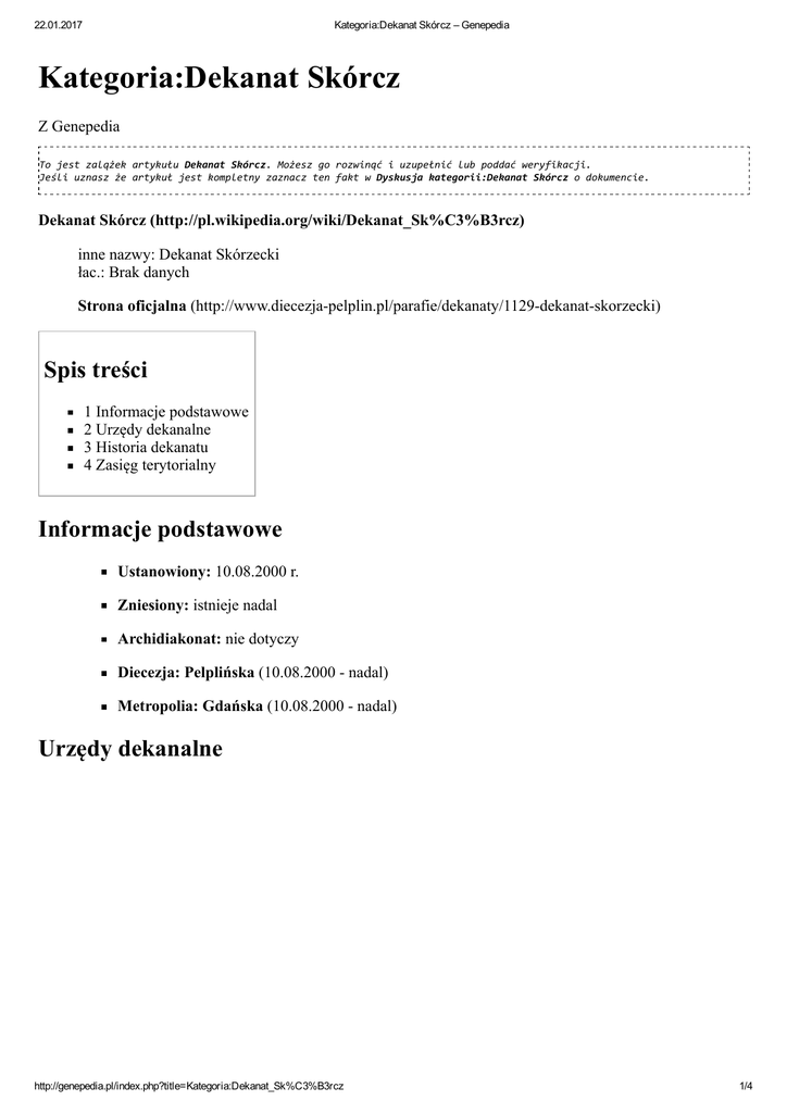 22.01.2017 Kategoria:Dekanat Skórcz – Genepedia Kategoria:Dekanat Skórcz Z Genepedia To jest zalążek artykułu Dekanat Skórcz. Możesz go rozwinąć i uzupełnić lub poddać weryfikacji. Jeśli uznasz że artykuł jest kompletny zaznacz ten fakt w Dyskusja kategorii:Dekanat Skórcz o dokumencie. Dekanat Skórcz (http://pl.wikipedia.org/wiki/Dekanat_Sk%C3%B3rcz) inne nazwy: Dekanat Skórzecki łac.: Brak danych Strona oficjalna (http://www.diecezjapelplin.pl/parafie/dekanaty/1129dekanatskorzecki) Spis treści 1 Informacje podstawowe 2 Urzędy dekanalne 3 Historia dekanatu 4 Zasięg terytorialny Informacje podstawowe Ustanowiony: 10.08.2000 r. Zniesiony: istnieje nadal Archidiakonat: nie dotyczy Diecezja: Pelplińska (10.08.2000 nadal) Metropolia: Gdańska (10.08.2000 nadal) Urzędy dekanalne http://genepedia.pl/index.php?title=Kategoria:Dekanat_Sk%C3%B3rcz 1/4 22.01.2017 Kategoria:Dekanat Skórcz – Genepedia 2001 2003 2001 2003 2001 2016 2001 2006 2004 2011 2004 2011 2007 2011 2014 2016 2014 2016 2014 2016 Ks. Rzepus Jan Dziekan Ks. Fonfara Alfons Wicedziekan Ks. Wilkowski Piotr Ojciec duchowny Ks. Wilkowski Piotr Wizytator dekanalny Ks. Stencel Eugeniusz Dziekan Ks. Wilkowski Piotr Wicedziekan Ks. Kowalski Piotr Wizytator dekanalny Ks. Skwierawski Jarosław Dziekan Ks. Nowak Ireneusz Wicedziekan Ks. Ryłko Dariusz Wizytator dekanalny Historia dekanatu 2000 r. w dn. 10 sierpnia nastąpiło ustanowienie dekanatu Dekret z dn. 10.08.2000 r. opublikowany w Miesięczniku nr 78/2000 Kontynuuje tradycje Dekanatu Osiek. Powstał na skutek przeniesienia siedziby dekanatu z Osieka. Zasięg terytorialny 2000 r. w dn. 10 sierpnia z Dekanatu Osiek przyłączono: Parafia Barłożno Parafia Czarnylas Parafia Grabowo Bobowskie Parafia Kasparus Parafia Kościelna Jania Parafia Lubichowo Parafia Ocypel Parafia Osiek Parafia Pączewo Parafia Skórcz Parafia Wda Dekret z dn. 10.08.2000 r. opublikowany w Miesięczniku nr 78/2000 http://genepedia.pl/index.php?title=Kategoria:Dekanat_Sk%C3%B3rcz 2/4 22.01.2017 Kategoria:Dekanat Skórcz – Genepedia Źródło: Oprac. własne na podst. Spisu... str. 176 2001 r. w dn. 15 stycznia (wg Spisu... str. 289) podział na parafie pozostawał bez zmian 2002 r. w dn. 2 lutego (wg Spisu... str. 291) podział na parafie pozostawał bez zmian 2003 r. w dn. 28 stycznia (wg Spisu... str. 295) podział na parafie pozostawał bez zmian 2004 r. w dn. 25 marca podział na parafie pozostawał bez zmian Dekret z dn. 10 marca 2004 r. opublikowany w Miesięczniku nr 3/2004. 2004 r. w dn. 21 września (wg Spisu... str. 306) podział na parafie pozostawał bez zmian 2006 r. w dn. 1 lutego (wg Spisu... str. 308) podział na parafie pozostawał bez zmian 2007 r. w dn. 17 stycznia (wg Spisu... str. 312) podział na parafie pozostawał bez zmian 2008 r. w dn. 30 stycznia (wg Spisu... str. 312) podział na parafie pozostawał bez zmian 2009 r. w dn. 30 stycznia (wg Spisu... str. 314) podział na parafie pozostawał bez zmian 2010 r. w dn. 15 lutego (wg Spisu... str. 321) podział na parafie pozostawał bez zmian 2011 r. w dn. 1 marca (wg Spisu... str. 322) podział na parafie pozostawał bez zmian 2014 r. w dn. 11 lutego (wg Spisu... str. 301) podział na parafie pozostawał bez zmian Strony w kategorii „Dekanat Skórcz” Poniżej wyświetlono 11 spośród wszystkich 11 stron tej kategorii. " " cd. http://genepedia.pl/index.php?title=Kategoria:Dekanat_Sk%C3%B3rcz " cd. 3/4 22.01.2017 Barłożno Parafia rz.kat. pw. św. Marcina Czarnylas woj. pomorskie Parafia rz.kat. pw. św. Andrzeja Apostoła Grabowo Bobowskie Parafia rz.kat. pw. Objawienia Pańskiego Kasparus Parafia rz.kat. pw. św. Józefa Kategoria:Dekanat Skórcz – Genepedia Kościelna Jania Parafia rz. kat. pw. Trójcy Świętej Lubichowo Parafia rz.kat. pw. św. Jakuba Starszego Ocypel Parafia rz.kat. pw. MB KP Osiek pow. starogardzki Parafia rz.kat. pw. św. Rocha Pączewo Parafia rz.kat. pw. Zwiastowania NMP Skórcz Parafia rz.kat. pw. Wszystkich Świętych Wda woj. pomorskie Parafia rz.kat. pw. Najświętszego Serca Pana Jezusa Źródło „http://genepedia.pl/index.php?title=Kategoria:Dekanat_Skórcz&oldid=73422” Kategoria: Diecezja Pelplińska Tę stronę ostatnio zmodyfikowano o 17:02, 20 wrz 2016. Tę stronę obejrzano 82 razy. Treść udostępniana na licencji Creative Commons – za uznaniem autora, bez użycia komercyjnego, na tych samych zasadach, jeśli nie podano inaczej. http://genepedia.pl/index.php?title=Kategoria:Dekanat_Sk%C3%B3rcz 4/4