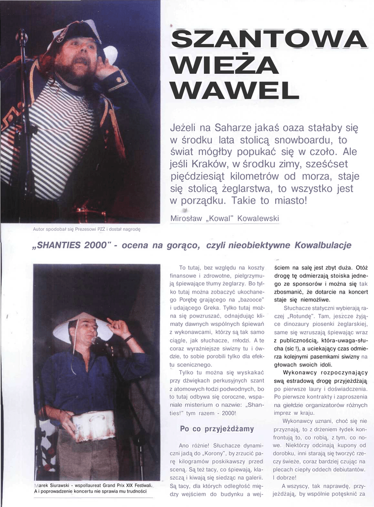 SZANTOWA WIEŻA WAWEL Jeżeli na Saharze jakaś oaza stałaby się w środku lata stolicą snowboardu, to świat mógłby popukać się w czoło. Ale jeśli Kraków, w środku zimy, sześćset pięćdziesiąt kilometrów od morza, staje się stolicą żeglarstwa, to wszystko jest w porządku. Takie to miasto! Mirosław „Kowal" Kowalewski Autor spodobał się Prezesowi PZŻ i dostał nagrodę „SHANTIES 2000" - ocena na gorąco, czyli nieobiektywne Kowalbulacje To tutaj, bez względu na koszty finansowe i zdrowotne, pielgrzymują śpiewające tłumy żeglarzy. Bo tylko tutaj można zobaczyć ukochanego Porębę grającego na „bazooce" i udającego Greka. Tylko tutaj można się powzruszać, odnajdując klimaty dawnych wspólnych śpiewań z wykonawcami, którzy są tak samo ciągle, jak słuchacze, rnłodzi. A te coraz wyraźniejsze siwizny tu i ówdzie, to sobie porobili tylko dla efektu scenicznego. Tylko tu można się wyskakać przy dźwiękach perkusyjnych szant z atomowych łodzi podwodnych, bo to tutaj odbywa się coroczne, wspaniale misterium o nazwie: „Shanties!" tym razem - 2000! Po co przyjeżdżamy arek Siurawski - wspollaureat Grand Prix XIX Festiwali. A i poprowadzenie koncertu nie sprawia mu trudności Ano różnie! Słuchacze dynamiczni jadą do „Korony", by zrzucić parę kilogramów poskikawszy przed sceną. Są też tacy, co śpiewają, klaszczą i kiwają się siedząc na galerii. Są tacy, dla których odległość między wejściem do budynku a wej- ściem na salę jest zbyt duża. Otóż drogę tę odmierzają stoiska jednego ze sponsorów i można się tak zbosmanić, że dotarcie na koncert staje się niemożliwe. Słuchacze statyczni wybierają raczej „Rotundę". Tam, jeszcze żyjące dinozaury piosenki żeglarskiej, same się wzruszają śpiewając wraz z publicznością, która-uwaga-słucha (sic !), a uciekający czas odmierza kolejnymi pasemkami siwizny na głowach swoich idoli. Wykonawcy rozpoczynający swą estradową drogę przyjeżdżają po pierwsze laury i doświadczenia. Po pierwsze kontrakty i zaproszenia na giełdzie organizatorów różnych imprez w kraju. Wykonawcy uznani, choć się nie przyznają, to z drżeniem łydek konfrontują to, co robią, z tym, co nowe. Niektórzy odcinają kupony od dorobku, inni starają się tworzyć rzeczy świeże, coraz bardziej czując na plecach ciepły oddech debiutantów. l dobrze! A wszyscy, tak naprawdę, przyjeżdżają, by wspólnie potęsknić za s pływaniem pod żaglami! Na morzu czy śródlądziu. By żeglować w piosence wokół Hornu czy Mikołajek. Kogo, co i gdzie słuchamy Znakomitym pomysłem byt częściowy powrót do „Rotundy", l słuchaczy, i wykonawców. W wielkich przedsięwzięciach szantowych nie ma okazji, aby wykonawca i słuchacz mogli wspólnie pochylić się nad stowem, nad wzruszeniem, nad jakimś przekazem. Generalnie ma być zabawa i nie ma dziś miejsca na dużych imprezach dla solisty z gitarą i rnuzą. A tutaj, jakże wspaniale zabrzmiały piosenki Ani Sojki, „Pestki" czy innych solistów, którzy dobierali się w niepowtarzalne koalicje muzyczne, akompaniując sobie nawzajem, l ta wrażliwa publiczność, która śpiewata razem z Porębą, Koryckim i innymi. Ci, którzy byli w czwartek i w piątek w „Rotundzie", na pewno wrócą w przysztyrn roku. O kolejny rok mtodsi. Nie zawiedli się ci, którzy przyszli na koncert niestusznie zwany koncertem debiutów. Wspaniali, dynamiczni i pełni radości z tego, co robią, debiutanci niejednego „zawodowca" mogą uczyć zachowania na scenie lub chociażby pracy z mikrofonem. Nie wiem, kto z nich pozostanie na estradzie, ale chciałbym ich oglądać i słuchać jak najczęściej. Jest to świeży powiew, który być może nieco przewietrzy naszą szantową estradkę. Wiem, że godzina jedenasta jest środkiem nocy dla zmęczonych dorannymi zajęciami uczestników „Shanties". l dobrze, bo tylko niektórym wybranym dane było uczestniczyć we wzruszeniach koncertu dla dzieci. Kto tam byt, swoje wie, i co się ubawił, to jego. l tak będzie za rok. Dorośli leczą kaca, a my się ba- wimy! W tyrn roku pełna sala dzieci opłynęta j ośpiewała kulę ziemską. Regaty „Race 2000" dzieci już wygrały i można teraz spokojnie wypuścić tam dorosłych. Na innych koncertach nie byłem, więc nie będę się mądrzył. Nagrody, konkursy itd. Każdy wykonawca uważa, że jest najlepszy i ja też tak myślę. Tylko to jury jest nieobiektywne, a publiczność niepotrzebnie gwiżdże. W związku z tym niewielu uznanych wykonawców ryzykuje udział w konkursie. Tym bardziej chylę czoła przed tymi, którzy w szranki stanęli. Na szczęście jest zjawisko, które wszystkich godzi. Zwie się Jurek Porębski ze swym mistrzostwem słowa i nuty. W tym roku również pokazał klasę, wygrywając konkurs premier. OJurkowym ge- niuszu i maestrii świadczy również fakt, że kiedyś wygrał konkurs na piosenkę o Wiśle utworem o... Dworcu Centralnym w Warszawie. Długo jeszcze innym trzeba będzie podpatrywać jego maestrię i warsztat, którego bardzo, bardzo szczerze mu zazdroszczę. Nie chciałbym być w skórze jury oceniającego debiuty. Zespól „Banana Boat", który wygrat, absolutnie zasłuzył na tę nagrodę. Jak wszyscy inni debiutanci! Bo poziom był wyjątkowo wyrównany. Nagrodę Stana Hugilla otrzymał zespól „Sailor" - zdaniem wielu obserwatorów są to weselsi następcy ustępujących wykonawców ortodoksyjnej szanty klasycznej. O ile „Grand Prix" dla „Starych Dzwonów" jest bezdyskusyjne, o tyle przyznanie nagrody PZŻ Mirkowi „Kowalowi" Kowalewskiemu jest po prostu skandalem! Ten starzejący się grubas o wątpliwym poczuciu humoru, już dosyć pokalał wszystkie tradycyjne świętości, stawiając na tej samej scenie szanty szuwarowo-bagienne. Dość już stawiania przy tej samej kei szantowej „Samanthy" z Mazur obok „Cytryniarza", „Diamenta" czy kliprów herbacianych! l dosyć już ogłupiania na