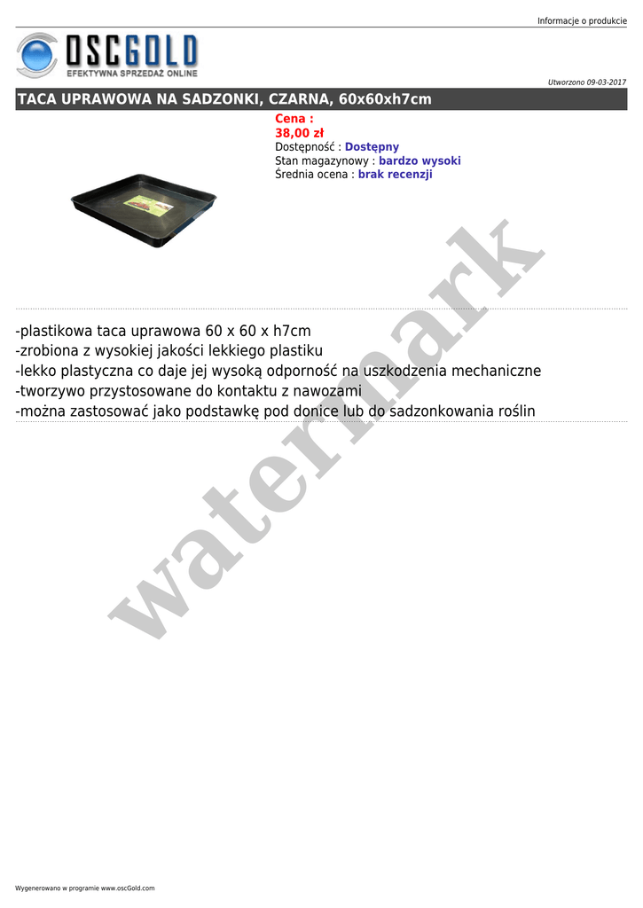 Informacje o produkcie Utworzono 09-03-2017 TACA UPRAWOWA NA SADZONKI, CZARNA, 60x60xh7cm Cena : 38,00 zł er m ar k Dostępność : Dostępny Stan magazynowy : bardzo wysoki Średnia ocena : brak recenzji w at -plastikowa taca uprawowa 60 x 60 x h7cm -zrobiona z wysokiej jakości lekkiego plastiku -lekko plastyczna co daje jej wysoką odporność na uszkodzenia mechaniczne -tworzywo przystosowane do kontaktu z nawozami -można zastosować jako podstawkę pod donice lub do sadzonkowania roślin Wygenerowano w programie www.oscGold.com