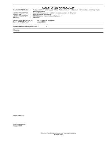 KOSZTORYS NAKŁADCZY NAZWA INWESTYCJI : ADRES INWESTYCJI INWESTOR ADRES INWESTORA BRANśA : : : : Budowa stołówki szkolnej przy Szkole Podstawowej nr 1 w OŜarowie Mazowieckim - instalacja ciepła technologicznego Szkoła Podstawowa nr 1 w OŜarowie Mazowieckim, ul. Szkolna 2 Gmina OŜarów Mazowiecki 05-580 OŜarów Mazowiecki, ul. Kolejowa 2 sanitarna SPORZĄDZIŁ KALKULACJE : DATA OPRACOWANIA : mgr inŜ. Andrzej Kłodawski listopad 2008 Ogółem wartość kosztorysowa robót : zł Słownie: WYKONAWCA : Data opracowania listopad 2008 Dokument został opracowany przy pomocy programu NORMA PRO OŜarów - instalacja c.t. Lp. Podstawa Opis jm 1 Instalacja ciepła technologicznego 1 KNR-W 2-15 Rurociągi w instalacjach c.o. stalowe o śr. nomid.1 0403-06 nalnej 50 mm o połączeniach spawanych na ścianach w budynkach Nakłady m Cena jedn. Koszt jedn Ilość 27 -- Robocizna -999 5040999 5122999 6601999 0000000 -- Materiały -rury stalowe ze szwem przewodowe czarne o śr. nominalnej 50 mm łuki stalowe gładkie czarne o śr. nominalnej 50 mm uchwyty do rur o śr. nominalnej 50 mm materiały pomocnicze -- Sprzęt -środek transportowy Koszty pośrednie od (R, S) Zysk od (R+Kp(R), S+Kp(S)) Razem pozycja 1 2 KNR-W 2-15 Rurociągi w instalacjach c.o. stalowe o śr. nomid.1 0403-05 nalnej 40 mm o połączeniach spawanych na ścianach w budynkach 39000 r-g 0.6230 m 1.0000 szt 0.1700 szt % 0.3600 1.5000 m-g % % 0.0280 27.000 22 m -- Robocizna -999 5040999 5122999 6601999 0000000 -- Materiały -rury stalowe ze szwem przewodowe czarne o śr. nominalnej 40 mm łuki stalowe gładkie czarne o śr. nominalnej 40 mm uchwyty do rur o śr. nominalnej 40 mm materiały pomocnicze -- Sprzęt -środek transportowy Koszty pośrednie od (R, S) Zysk od (R+Kp(R), S+Kp(S)) Razem pozycja 2 3 KNR-W 2-15 Rurociągi w instalacjach c.o. stalowe o śr. nomid.1 0403-04 nalnej 32 mm o połączeniach spawanych na ścianach w budynkach 39000 r-g 0.5890 m 1.0000 szt 0.1700 szt % 0.3600 1.5000 m-g % % 0.0196 22.000 131 m -- Robocizna -999 5040999 6601999 0000000 -- Materiały -rury stalowe ze szwem przewodowe czarne o śr. nominalnej 32 mm uchwyty do rur o śr. nominalnej 32 mm materiały pomocnicze -- Sprzęt -środek transportowy Koszty pośrednie od (R, S) Zysk od (R+Kp(R), S+Kp(S)) Razem pozycja 3 4 KNR-W 2-15 Rurociągi w instalacjach c.o. stalowe o śr. nomid.1 0403-03 nalnej 25 mm o połączeniach spawanych na ścianach w budynkach 39000 r-g 0.5610 m 1.0300 szt % 0.3900 1.5000 m-g % % 0.0166 131.000 14 m -- Robocizna -999 5040999 6601999 0000000 39000 r-g 0.5250 -- Materiały -rury stalowe ze szwem przewodowe czarne o śr. nominalnej 25 mm uchwyty do rur o śr. nominalnej 25 mm materiały pomocnicze m 1.0300 szt % 0.3900 1.5000 -- Sprzęt -środek transportowy Koszty pośrednie od (R, S) m-g % 0.0129 -2- Norma PRO Wersja 4.01, Marzec 2003 r. Wartość OŜarów - instalacja c.t. Lp. Podstawa Opis jm Zysk od (R+Kp(R), S+Kp(S)) Razem pozycja 4 5 KNR-W 2-15 Rurociągi w instalacjach c.o. stalowe o śr. nomid.1 0403-02 nalnej 20 mm o połączeniach spawanych na ścianach w budynkach Nakłady Cena jedn. Koszt jedn Ilość % 14.000 20 m -- Robocizna -999 5040999 6601999 0000000 -- Materiały -rury stalowe ze szwem przewodowe czarne o śr. nominalnej 20 mm uchwyty do rur o śr. nominalnej 20 mm materiały pomocnicze -- Sprzęt -środek transportowy Koszty pośrednie od (R, S) Zysk od (R+Kp(R), S+Kp(S)) Razem pozycja 5 6 KNR-W 7-12 Czyszczenie przez szczotkowanie mechaniczne d.1 0102-04 do trzeciego stopnia czystości rurociągów o śr.zewn.do 57 mm (stan wyjściowy powierzchni B) 39000 r-g 0.4810 m 1.0400 szt % 0.4100 1.5000 m-g % % 0.0085 20.000 28.22 m2 -- Robocizna -999 -- Materiały -materiały pomocnicze Koszty pośrednie od (R, S) Zysk od (R+Kp(R), S+Kp(S)) Razem pozycja 6 7 KNR-W 7-12 Malowanie pędzlem farbami do gruntowania mid.1 0201-04 niowymi rurociągów o śr.zewn.do 57 mm 0000000 r-g 0.4550 % % % 2.5000 28.220 28.22 m2 -- Robocizna -999 1510200 1050199 0000000 -- Materiały -farba olejna do gruntowania przeciwrdzewna benzyna do lakierów materiały pomocnicze -- Sprzęt -samochód dostawczy 0.9 t Koszty pośrednie od (R, S) Zysk od (R+Kp(R), S+Kp(S)) Razem pozycja 7 8 KNR INSTAL Zawory kulowe dn 20 d.1 0308-03 39511 r-g 0.2760 dm3 dm3 % 0.1130 0.0070 1.0000 m-g % % 0.0008 28.220 6 szt. -- Robocizna -999 5702899 0000000 -- Materiały -zawór kulowy dn 20 materiały pomocnicze -- Sprzęt -środek transportowy Koszty pośrednie od (R, S) Zysk od (R+Kp(R), S+Kp(S)) Razem pozycja 8 9 KNR INSTAL Zawory kulowe dn 25 d.1 0308-04 39000 r-g 0.3500 szt % 1.0000 3.0000 m-g % % 0.0200 6.000 1 szt. -- Robocizna -999 5702899 0000000 -- Materiały -zawór kulowy dn 25 materiały pomocnicze -3- Norma PRO Wersja 4.01, Marzec 2003 r. r-g 0.4000 szt % 1.0000 3.0000 Wartość OŜarów - instalacja c.t. Lp. Podstawa Opis jm -- Sprzęt -środek transportowy Koszty pośrednie od (R, S) Zysk od (R+Kp(R), S+Kp(S)) Razem pozycja 9 10 KNR INSTAL Zawory kulowe dn 32 d.1 0308-05 39000 m-g % % Nakłady Cena jedn. Koszt jedn Ilość 0.0200 1.000 3 szt. -- Robocizna -999 5702899 0000000 -- Materiały -zawór kulowy dn 32 materiały pomocnicze -- Sprzęt -środek transportowy Koszty pośrednie od (R, S) Zysk od (R+Kp(R), S+Kp(S)) Razem pozycja 10 11 KNR INSTAL Zawory kulowe dn 50 d.1 0308-07 39000 r-g 0.4600 szt % 1.0000 3.0000 m-g % % 0.0200 3.000 2 szt. -- Robocizna -999 5702899 0000000 39000 12 KNR 7-08 d.1 0806-04 -- Materiały -zawór kulowy dn 50 materiały pomocnicze -- Sprzęt -środek transportowy Koszty pośrednie od (R, S) Zysk od (R+Kp(R), S+Kp(S)) Razem pozycja 11 MontaŜ zaworów zaporowych,zwrotnych lub odcinających - zawór odcinający nastawny MSV-I dn 15 r-g 0.6800 szt % 1.0000 3.0000 m-g % % 0.0400 2.000 5 szt. -- Robocizna -999 5829599 0000000 39511 13 KNR 7-08 d.1 0806-04 -- Materiały -zawór odcinający nastawny MSV-I dn 15 materiały pomocnicze -- Sprzęt -samochód dostawczy 0.9 t Koszty pośrednie od (R, S) Zysk od (R
