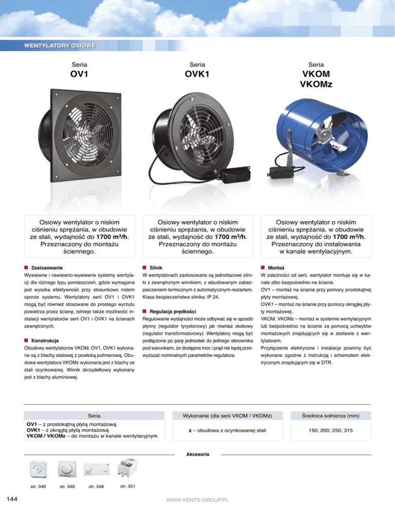 WENTYLATORY OSIOWE Seria Seria OV1 OVK1 VKOM VKOMz Osiowy wentylator o niskim ciśnieniu sprężania, w obudowie ze stali, wydajność do 1700 m3/h. Przeznaczony do montażu ściennego. Osiowy wentylator o niskim ciśnieniu sprężania, w obudowie ze stali, wydajność do 1700 m3/h. Przeznaczony do montażu ściennego. Osiowy wentylator o niskim ciśnieniu sprężania, w obudowie ze stali, wydajność do 1700 m3/h. Przeznaczony do instalowania w kanale wentylacyjnym. Zastosowanie Wywiewne i nawiewno-wywiewne systemy wentylacji dla różnego typu pomieszczeń, gdzie wymagana jest wysoka efektywność przy stosunkowo niskim oporze systemu. Wentylatory serii OV1 i OVK1 mogą być również stosowane do prostego wyrzutu powietrza przez ścianę, istnieje także możliwość instalacji wentylatorów serii OV1 i OVK1 na ścianach zewnętrznych. Konstrukcja Obudowy wentylatorów VKOM, OV1, OVK1 wykonane są z blachy stalowej z powłoką polimerową. Obudowa wentylatora VKOMz wykonana jest z blachy ze stali ocynkowanej. Wirnik skrzydełkowy wykonany jest z blachy aluminiowej. Silnik W wentylatorach zastosowane są jednofazowe silniki z zewnętrznym wirnikiem, z wbudowanym zabezpieczeniem termicznym z automatycznym restartem. Klasa bezpieczeństwa silnika: IP 24. Regulacja prędkości Regulowanie wydajności może odbywać się w sposób płynny (regulator tyrystorowy) jak również skokowy (regulator transformatorowy). Wentylatory mogą być podłączone po parę jednostek do jednego sterownika pod warunkiem, że dostępna moc i prąd nie będą przewyższać nominalnych parametrów regulatora. Seria OV1 – z prostokątną płytą montażową OVK1 – z okrągłą płytą montażową VKOM / VKOMz – do montażu w kanale wentylacyjnym str. 346 str. 346 str. 348 Montaż W zależności od serii, wentylator montuje się w kanale albo bezpośrednio na ścianie. OV1 – montaż na ścianie przy pomocy prostokątnej płyty montażowej. OVK1 – montaż na ścianie przy pomocy okrągłej płyty montażowej. VKOM, VKOMz – montaż w systemie wentylacyjnym lub bezpośrednio na ścianie za pomocą uchwytów montażowych znajdujących się w zestawie z wentylatorem. Przyłączenie elektryczne i instalacja powinny być wykonane zgodnie z instrukcją i schematem elektrycznym znajdującym się w DTR. Wykonanie (dla serii VKOM / VKOMz) Średnica kołnierza (mm) z – obudowa z ocynkowanej stali 150; 200; 250; 315 Akcesoria 144 Seria str. 351 WWW.VENTS-GROUP.PL WWW.VENTS-GROUP.PL Charakterystyki techniczne: OV1 / OVK1 / VKOM / VKOMz 150 OV1 / OVK1 / VKOM / VKOMz 200 OV1 / OVK1 / VKOM / VKOMz 250 OV1 / OVK1 / VKOM / VKOMz 315 Napięcie (V) 230 230 230 230 Moc (W) 36 43 68 110 Pobór prądu (A) 0,26 0,28 0,48 0,75 Wydajność (m /h) 200 405 1070 1700 Obroty (min ) 3 1300 1300 1300 1300 Poziom hałasu [dB(A)/3 m] 33 32 48 54 Maksymalna temperatura pracy (ºC) 40 40 40 40 -1 Sposób montażu przy pomocy uchwytów montażowych na powierzchni ściany. WENTYLATORY OSIOWE OV1 OVK1 VKOM VKOMz Klasa bezpieczeństwa IP 24 (VKOM IP X4) IP 24 (VKOM IP X4) IP 24 (VKOM IP X4) IP 24 (VKOM IP X4) Wariant zastosowania wentylatora OV1 w kuchni. WWW.VENTS-GROUP.PL 145 WENTYLATORY OSIOWE Wymiary wentylatorów: Wymiary (mm) Typ Waga (kg) ØD Ød B B1 L OV1 150 162 7 250 210 120 2,5 OV1 200 208 7 312 260 120 3,0 OV1 250 262 7 370 320 140 3,5 OV1 315 312 9 430 380 170 6,1 ØD ØD1 ØD2 Ød L OVK1 150 162 190 220 7 120 2,5 OVK1 200 208 270 300 7 120 2,5 OVK1 250 262 330 360 7 140 3,0 OVK1 315 312 390 420 9 170 5,1 OV 1 Wymiary wentylatorów: Wymiary (mm) Typ Waga (kg) OVK 1 Wymiary wentylatorów: Wymiary (mm) Typ Waga (kg) ØD B L L1 L3 VKOM 150/VKOMz 150 162 183 220 40 30 1,8 VKOM 200/VKOMz 200 208 228 220 40 30 2,4 VKOM 250/VKOMz 250 262 283 270 55 30 3,7 VKOM 315/VKOMz 315 315 337 278 55 40 4,9 VKOM, VKOMz Wymiary: Typ 146 Wymiary (mm) Waga (kg) ØD ØD1 H H1 RM 148/158 148 158 140 55 RM 198/204 198 204 140 55 0.4 RM 248/258 248 258 150 65 0.42 0.3 WWW.VENTS-GROUP.PL Redukcja do serii wentylatorów VKOM WWW.VENTS-GROUP.PL VENTS VKOM / OV1 / OVK1 Ciśnienie (Pa) VKOMz 200 VKOM 200 OV1 200 OVK1 200 Wydajność (m3/h) Poziom hałasu LwA emitowane Hz dB(A) Całkowita 46 63 47 125 56 Pasma częstotliwości, Hz 250 500 1000 2000 45 35 30 31 Wydajność (m3/h) Poziom hałasu 4000 31 8000 20 LwA emitowane Hz dB(A) Całkowita 53 63 55 125 63 VKOMz 250 VKOM 250 OV1 250 OVK1 250 4000 30 8000 15 VENTS VKOM / OV1 / OVK1 Ciśnienie (Pa) Ciśnienie (Pa) VENTS VKOM / OV1 / OVK1 Pasma częstotliwości, Hz 250 500 1000 2000 56 44 42 36 120 VKOMz 315 VKOM 315 OV1 315 OVK1 315 110 100 90 WENTYLATORY OSIOWE VKOMz 150 VKOM 150 OV1 150 OVK1 150 OV1 OVK1 VKOM VKOMz Ciśnienie (Pa) VENTS VKOM / OV1 / OVK1 80 70 60 50 40 30 20 10 Wydajność (m3/h) 0 Wydajność (m3/h) Poziom hałasu LwA emitowane Hz dB(A) Całkowita 59 63 61 125 70 Pasma częstotliwości, Hz 250 500 1000 2000 60 43 46 41 Poziom hałasu 4000 34 8000 19 LwA emitowane WWW.VENTS-GROUP.PL Hz dB(A) Całkowita 62 63 65 125 67 Pasma częstotliwości, Hz 250 500 1000 2000 58 45 51 48 4000 41 8000 30 147