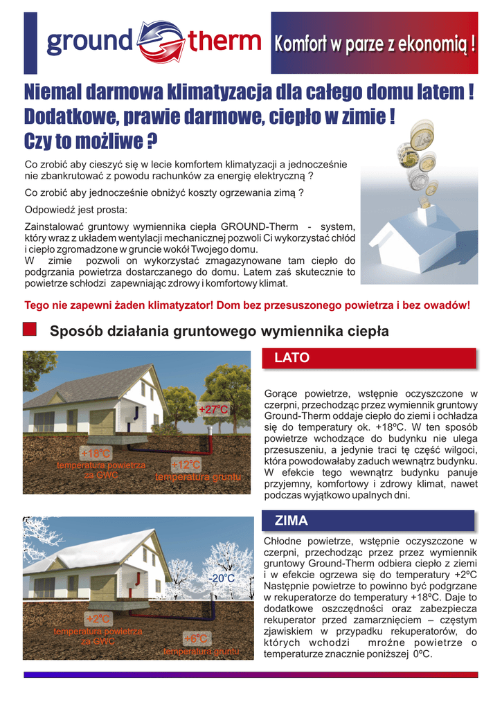 Komfort w parze z ekonomią ! Niemal darmowa klimatyzacja dla całego domu latem ! Dodatkowe, prawie darmowe, ciepło w zimie ! Czy to możliwe ? Co zrobić aby cieszyć się w lecie komfortem klimatyzacji a jednocześnie nie zbankrutować z powodu rachunków za energię elektryczną ? Co zrobić aby jednocześnie obniżyć koszty ogrzewania zimą ? Odpowiedź jest prosta: Zainstalować gruntowy wymiennika ciepła GROUND-Therm - system, który wraz z układem wentylacji mechanicznej pozwoli Ci wykorzystać chłód i ciepło zgromadzone w gruncie wokół Twojego domu. W zimie pozwoli on wykorzystać zmagazynowane tam ciepło do podgrzania powietrza dostarczanego do domu. Latem zaś skutecznie to powietrze schłodzi zapewniając zdrowy i komfortowy klimat. Tego nie zapewni żaden klimatyzator! Dom bez przesuszonego powietrza i bez owadów! Sposób działania gruntowego wymiennika ciepła LATO +27oC o +18 C temperatura powietrza za GWC +12oC temperatura gruntu Gorące powietrze, wstępnie oczyszczone w czerpni, przechodząc przez wymiennik gruntowy Ground-Therm oddaje ciepło do ziemi i ochładza się do temperatury ok. +18ºC. W ten sposób powietrze wchodzące do budynku nie ulega przesuszeniu, a jedynie traci tę część wilgoci, która powodowałaby zaduch wewnątrz budynku. W efekcie tego wewnątrz budynku panuje przyjemny, komfortowy i zdrowy klimat, nawet podczas wyjątkowo upalnych dni. ZIMA -20oC +2oC temperatura powietrza za GWC +6oC temperatura gruntu Chłodne powietrze, wstępnie oczyszczone w czerpni, przechodząc przez przez wymiennik gruntowy Ground-Therm odbiera ciepło z ziemi i w efekcie ogrzewa się do temperatury +2ºC Następnie powietrze to powinno być podgrzane w rekuperatorze do temperatury +18ºC. Daje to dodatkowe oszczędności oraz zabezpiecza rekuperator przed zamarznięciem – częstym zjawiskiem w przypadku rekuperatorów, do których wchodzi mroźne powietrze o temperaturze znacznie poniższej 0ºC. Komfort w parze z ekonomią ! Pleśnie i grzyby nie mają szans rozwoju w tym wymienniku ! Rury i kształtki zabezpieczone przeciwgrzybicznie i antybakteryjnie* za pomocą mikrosrebra dają 100% gwarancji eliminacji stęchlizny oraz przykrych zapachów z GWC oraz - co ważniejsze - całkowite bezpieczeństwo dla mieszkańców. *Skuteczność antygrzybiczna oraz antybakteryjna potwierdzona certyfikatem PZH oraz badaniami w Laboratorium Mikrobiologicznym Instytutu Biopolimerów i Włókien Chemicznych w Łodzi. Wyniki badań dostępne na stronie: www.ground-therm.com Szacunkowe koszty wymienników GROUND-Therm wykonanych z rur DN 110 w układzie Tichelmanna Założenia przyjęte do wyliczeń: Strefa klimatyczna: 3 Gleba: piasek gliniasty Głębokość posadowienia: 1,75 m Długość rur wymiennika: 19 m Krotność wymiany powietrza = 1 Tryb pracy chłodzący (lato): Totoczenia = 30°C Tryb pracy grzewczy (zima): Totoczenia = -20°C Twylot z GWC = 19°C Twylot z GWC = -1.7°C *Ceny netto. Koszt szacunkowy obejmuje: rury wymiennika, kolektory, opaski termokurczliwe uszczelniające, studnię kondensatu oraz doprowadzenie do budynku poprzez 2 rury kolektorowe o dł. 2m i kolano 90. Podany koszt nie obejmuje czerpni ani montażu. 21 m L kolektor wyjście do czerpni powietrza ZWROT KOSZTÓW INWESTYCJI JUŻ PO 3 LATACH UŻYTKOWANIA ! Producent: Ground-Therm Sp. z o. o. tel. +48 32 231 80 20 fax: +48 32 230 90 47 e-mail: [email protected] www.ground-therm.com