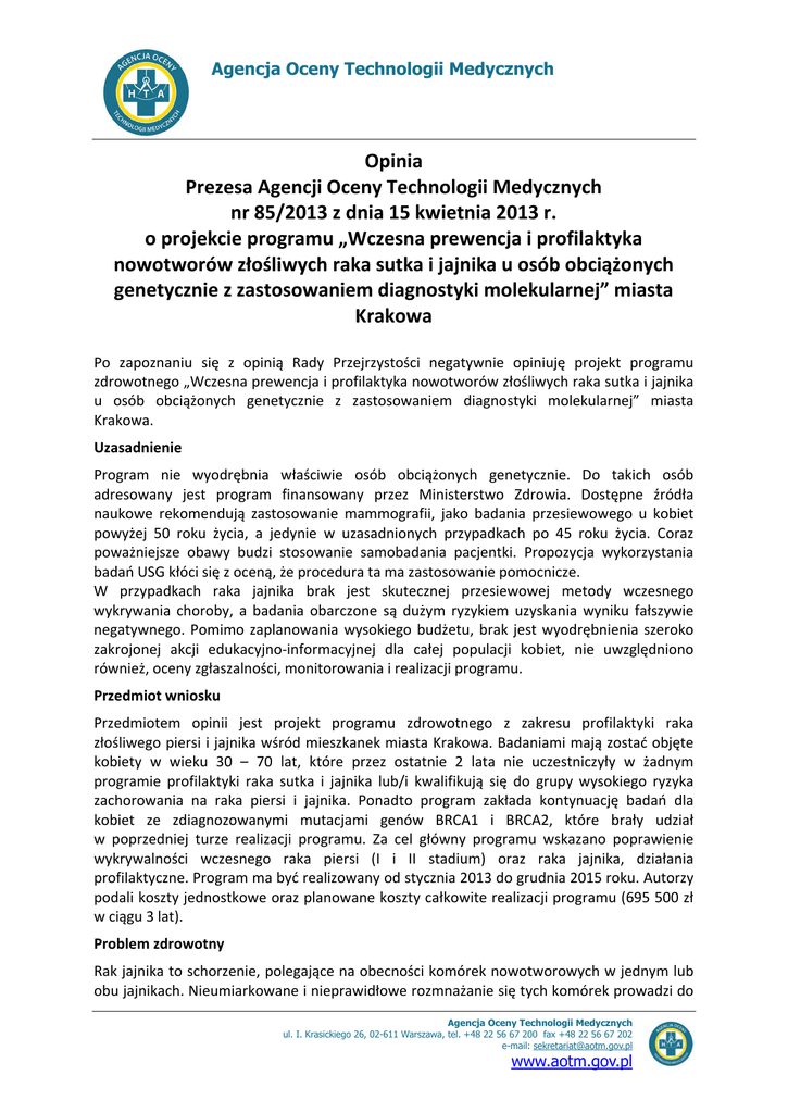 Agencja Oceny Technologii Medycznych Opinia Prezesa Agencji Oceny Technologii Medycznych nr 85/2013 z dnia 15 kwietnia 2013 r. o projekcie programu „Wczesna prewencja i profilaktyka nowotworów złośliwych raka sutka i jajnika u osób obciążonych genetycznie z zastosowaniem diagnostyki molekularnej” miasta Krakowa Po zapoznaniu się z opinią Rady Przejrzystości negatywnie opiniuję projekt programu zdrowotnego „Wczesna prewencja i profilaktyka nowotworów złośliwych raka sutka i jajnika u osób obciążonych genetycznie z zastosowaniem diagnostyki molekularnej” miasta Krakowa. Uzasadnienie Program nie wyodrębnia właściwie osób obciążonych genetycznie. Do takich osób adresowany jest program finansowany przez Ministerstwo Zdrowia. Dostępne źródła naukowe rekomendują zastosowanie mammografii, jako badania przesiewowego u kobiet powyżej 50 roku życia, a jedynie w uzasadnionych przypadkach po 45 roku życia. Coraz poważniejsze obawy budzi stosowanie samobadania pacjentki. Propozycja wykorzystania badań USG kłóci się z oceną, że procedura ta ma zastosowanie pomocnicze. W przypadkach raka jajnika brak jest skutecznej przesiewowej metody wczesnego wykrywania choroby, a badania obarczone są dużym ryzykiem uzyskania wyniku fałszywie negatywnego. Pomimo zaplanowania wysokiego budżetu, brak jest wyodrębnienia szeroko zakrojonej akcji edukacyjno-informacyjnej dla całej populacji kobiet, nie uwzględniono również, oceny zgłaszalności, monitorowania i realizacji programu. Przedmiot wniosku Przedmiotem opinii jest projekt programu zdrowotnego z zakresu profilaktyki raka złośliwego piersi i jajnika wśród mieszkanek miasta Krakowa. Badaniami mają zostać objęte kobiety w wieku 30 – 70 lat, które przez ostatnie 2 lata nie uczestniczyły w żadnym programie profilaktyki raka sutka i jajnika lub/i kwalifikują się do grupy wysokiego ryzyka zachorowania na raka piersi i jajnika. Ponadto program zakłada kontynuację badań dla kobiet ze zdiagnozowanymi mutacjami genów BRCA1 i BRCA2, które brały udział w poprzedniej turze realizacji programu. Za cel główny programu wskazano poprawienie wykrywalności wczesnego raka piersi (I i II stadium) oraz raka jajnika, działania profilaktyczne. Program ma być realizowany od stycznia 2013 do grudnia 2015 roku. Autorzy podali koszty jednostkowe oraz planowane koszty całkowite realizacji programu (695 500 zł w ciągu 3 lat). Problem zdrowotny Rak jajnika to schorzenie, polegające na obecności komórek nowotworowych w jednym lub obu jajnikach. Nieumiarkowane i nieprawidłowe rozmnażanie się tych komórek prowadzi do Agencja Oceny Technologii Medycznych ul. I. Krasickiego 26, 02-611 Warszawa, tel. +48 22 56 67 200 fax +48 22 56 67 202 e-mail: [email protected] www.aotm.gov.pl Opinia Prezesa AOTM nr 85/2013 z dnia 15 kwietnia 2013 r. powstania guza nowotworowego, którego dalszy rozwój może zagrażać innym tkankom i doprowadzać do przerzutów. Sklasyfikowano ponad 30 różnych rodzajów guzów jajnika, które są skategoryzowane ze względu na rodzaj komórek. Część z nich jest łagodna i nie prowadzi do przerzutów poza tkankę jajników. Złośliwe guzy mają zdolność przerzutowania. Obecnie nie ma skutecznej metody wczesnego wykrywania raka jajnika, diagnozuje się go zazwyczaj w stadium zaawansowanym. Z tego powodu jedynie połowa kobiet przeżywa okres dłuższy niż 5 lat po diagnozie. W przypadku 25% kobiet ze zdiagnozowanym nowotworem we wczesnym stadium choroby, wskaźnik 5-letniego okresu przeżycia jest większy niż 90%. Nowotwór piersi objawia się klinicznie w postaci stwardnienia lub zgrubienia w piersi, bólu lub ucisku w piersi, objawów zapalnych, zniekształcenia brodawki sutkowej, wydzieliny z brodawki sutkowej lub objawów przerzutów odległych. Rak piersi jest najczęściej występującym nowotworem u kobiet w Polsce. Stanowi ok. 20% wszystkich nowotworów diagnozowanych u kobiet. Co roku w Polsce odnotowuje się około 11 tys. nowych zachorowań (30 zachorowań na 100 tys. mieszkańców). Z powodu raka piersi każdego roku umiera 5 tys. kobiet. Uznaje się, że rak piersi jest związany z rozwojem cywilizacyjnym społeczeństwa. Umieralność może być skutecznie zmniejszone dzięki wczesnemu wykrywaniu. Do czynników ryzyka zaliczyć można: późny wiek pierwszego porodu, wczesny wiek pierwszej miesiączki, późny wiek menopauzy, brak dzieci bądź pierwsza ciąża po 30 roku życia, poronienia samoistne i sztuczne, długookresowe stosowanie doustnych preparatów antykoncepcyjnych (dane nie są rozstrzygające), długookresowe stosowanie hormonalnej terapii zastępczej po menopauzie, brak aktywności fizycznej, obciążenie rodzinne: zdiagnozowanie raka piersi u matki przed 40 rokiem życia lub zdiagnozowanie nowotworu u siostry zwiększa szacowane ryzyku dwukrotnie, zdiagnozowanie raka piersi u matki przed 70 rokiem życia zwiększa to ryzyko półtora raza, obustronny rak piersi w rodzinie trzykrotnie zwiększa ryzyko zachorowania kobiety miesiączkującej na raka piersi, obecność innych nowotworów, takich jak rak trzonu macicy, rak jajników, rak jelita grubego, chłoniaki, przyjęcie znaczącej dawki promieniowania jonizującego w rejonie klatki piersiowej, zmiany piersi z atypią oraz proliferacją podwyższają ryzyko do 4 razy, rozwoju nowotworu można spodziewać się po 10 latach od pojawienia się zmian łagodnych, regularne, codzienne spożywanie alkoholu nieznacznie zwiększa ryzyko zachorowania na raka piersi. Kluczową rolę we wczesnym rozpoznaniu raka piersi ma badanie mammograficzne, które umożliwia rozpoznanie zmiany nowotworowej, nim ta osiągnie postać objawiającą się klinicznie. Wykazano, że badania mammograficzne pozwalają zmniejszyć ryzyko zgonu z powodu raka piersi. Alternatywne świadczenia Program opieki nad rodzinami wysokiego dziedzicznie uwarunkowanego ryzyka zachorowania na nowotwory złośliwe realizowany w ramach Narodowego Prog