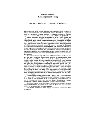 Waclaw Lipiñski: Kilka wspomnieñ i uwag DYMITR DOROSZENKO / DMYTRO DOROENKO Editor’s note: The article ‘Waclaw Lipiñski: Kilka wspomnie,i i uwag" Waclaw Li piñski: Some reminiscences and comments by Dmytro Dorolenko is a response to Adolf M. Bocheñski ‘s "Ukraiñski Maurras" A Ukrainian Maurras. It originally appeared in two issues of Biubetyn Polsko-Ukraihski nos. 9[44] and/I [46], 1934. Dmytro Dorolenko 1882-1951. a descendant of an old Cossack, hetman. and officer family, was a leading Ukrainian historian and conservative political figure. Already before World War I he was a prominent activist in Ukrainian life: he belonged to the Society of Ukrainian Progressives, served as editor of several Ukrainian publica tions, and contributed articles to a variety of Ukrainian journals. After the Revolution of 1917, he became the Russian Provisional Government’s commissar for Galicia and Bukovina. He was a member of the Ukrainian Central Rada, but declined to become the head of its government. Subsequently he served as the Ukrainian commissar of Cernyhiv province. From May to November 1918 Dorolenko was minister of foreign affairs of Hetman Skoropads’kyj’s government and, later, became an important figure in the émi gré hetmanite movement. As an émigré Dorojenko held several academic positions and professors/sips. He was the author of nearly 1,000 works on Ukrainian political, intellectual, liter ary, and church history and historiography, as well as of valuable memoirs. These included Narys istoriji Ukrainy A survey of the Ukraine’s history, 2 vols.; Warsaw, 1932-33. tstorija Ukrajiny 1917-1923 History of the Ukraine, 1917-23, 2 vols.; UThorod, 1930-32, A Survey of Ukrainian Historiography New York, 1957, Die Ukraine und das Reich: Neon Jahrhunderte deutsch-ukrainischer Beziehungen Leipzig, 1941, Het’ man Petro Dorotenko: Ohljad joho iyttja I poIitynoji dijal’nosty Hetman Petro Doro lenko: A survey of his life and political activity; New York, 1985, Z istoriji ukrajins’koji polityenoji dumky za asiv svitovoji vijny From the history of Ukrainian political thought during the World War: Prague, 1936, Moji spomyny pro davnje-mynule 19011914 roku My memoirs about the distant past. 1901-1914; Winnipeg, 1949, Moji spo myny pro nedavnje mynule, 19 14-1920 My memoirs about the recent past, 1914-1920, 4 vols.; Lviv, 1923 -24. Dorojenko wrote a number of articles on V Lypynskyj see "A Select Bibliography of V. Lypynskyj’s Works and Related Publications" published in this issue. His letters to V. Lypyns ‘kyj were published by the W. K. Lypynsky East European Research Insti tute in Philadelphia I. Korowytsky, ed.. Lysty Dmytra Dorolenka do Vjaes1ava Lypyns’koho [Letters of Dmytro Dorolenko to Vjaëeslav Lypyns‘kyj; 1973]. Doroknko’s response to Bocheñski’s article reflects his own assessment of Lypyn s’kyj’s work and his role in Ukrainian life, as well as the official views about Lypyns ‘kyj held by the hetmanite circle of Pavlo Skoropads kyj. The article is reprinted with minor changes to conform to contemporary Polish orthography. WACLAW LIPIFSKI 467 Bardzo cenny I ciekawy artykut p. Adolfa M. Bochcnskiego o i. p. W. Lipih skim zmusza mnic do wypowiedacnia pain uwag, w ktOrych pragnqtbym sprostowaC pewne, popetnione praea szanownego autora, nielcisloici, jakie pochodaq, imiem mniemaC, stqd, it kwestia ukraiuiska w ogblc, a rola w nicj LipiOskiego w saczcgolnoici nic lezaty w aakresie specjalnych I systcmatycz nych studiOw saanownego autora. ZnsjomoiC moja a Lipiñskim sicga r. 1908, przez pewien czas byliimy z nim w stosunkach dosyC bliskich. Nieraz wspbtpracowaliimy ze sobq I to bardzo ichile w r. 1909, kiedym bra! udalat w wydawanym przez niego Przeglqdzie Krajowym, w r. 1918, kiedy pracowallimy razem w rzqdaie hetmans Skoropadskicgo, wreszdie w latach 1920-1930 na emigracji. Zmarly obdarzal mnie swoim aaufaniem, daielqc sic nieraz swoimi planami I myilami, jak to byto awtaszcza w latach 1920-1921, kiedyimy praczyli rok caty, jako bliscy sqsicdzi, we wsi Rcichenau w Austrii dolnej. Wsaystko to, sqdzç, daje ml prawo wypowiedaenha pewnych swoich myili 0 dziatalnoici Lipiñskiego I jcgo roll w najnowszych daiejach ukraiñskicgo odrodzenia narodowego. Nic pre tendujç na wyczerpujqcq charakterystykç zmarlego daialacza, ani na wszech stronny praeglqd jego pracy uwatam, me stoimy dali jesacae za blisko jego iwie±cj mogity, by mod, mOwiqc o tym wsaystkim, zachowaC absolutnq bez stronnoiC! Dlatego te± iwiadoniic wybieram formç uwag I notatck z powodu artykutu p. Bocheñskiego, aby pomylki I nieicistoici, popelnione, moim ada - niem, praea niego, nie utrwabity sic na dtugo w literaturze, poiwiçconej Lipiñskiemu. Nie bçdç zastanawiaC sic nad tym, czy stusanie nazywa p. Bocheñski Lipiñskiego "ukraiñskim Maurrasem", sqdzç, me pomiçdzy ateistq Maurrasem a glçboko wierzqcym katolikicm Lipiñskim istniejc zasadnicza róinica wew nctrana, nie mówiqc jut o tym, mc I sama maniera litcracka, sam sty! u obu jest najaupctniej rbzny. Ale i sam szanowny autor wyanaje, me tytut "UkraiOski Maurras" "jest w stosunku do Lipiñskiego w duiej mierze niestusznym I ile dobranym". Przejdimy astern do istoty rzecay. tych pisarzy Pan Bocheñski aacayna od skonstatowania faktu, me Liphuiski "byt Pola kiem, stat sic Ukraincem", I zatrzymuje si, rzcca calkhcm zroaurnhata, na genczie tcj "dotqd nicwyjainionej asyrnhlacjh". Wiadomo na podstawie pracy K. Putaskiego p.t. Lipiñscy herbu Brodzicz i herbu Gozdawa Wiedeñ, 1922, wykonanej a pomocq samego W. Lipinskiego, te rod Lipiñskich nie byt ukraiñskim rodem autochtonicznym, jak wide innych rodOw szlacheckich, które spolszcayty 1c w pracdiqgu wiekOw XVII I XVIII, tylko pochodzit z Mialem okazjç jut nieraa pisaC o Lipiñskim, ale tc moje prace opuszczone 54 czemui w wykazie literatury o Liphhskim, wydrukowanym w miesiçczniku Dzwony; jeszcze za zydia zmarlego, aby spopularyzowaC jego myth, napisalem na jego protbc i wydalem p