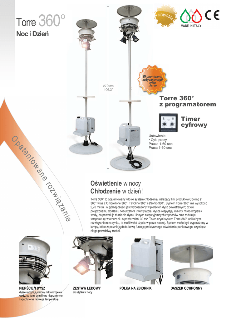 Torre 360° MADE IN ITALY Noc i Dzień Ekonomiczny! zużycie energii tylko 390 W Torre 360° z programatorem Timer cyfrowy Ustawienia: • Cykl pracy Pauza 1-60 sec Praca 1-60 sec Oświetlenie w nocy Chłodzenie w dzień! Torre 360° to opatentowany włoski system chłodzenia, należący linii produktów Cooling at 360° wraz z Ombrellone 360°, Tavolino 360° i èSoffio 360°. System Torre 360° ma wysokość 2,70 metra i w górnej części jest wyposażony w pierścień dysz powietrznych; dzięki połączonemu działaniu nebulizatora i wentylatora, dysze rozpylają miliony mikro-kropelek wody, co powoduje tłumienie dymu i innych nieprzyjemnych zapachów oraz redukuje temperaturę w otoczeniu o powierzchni 30 m2. To co czyni system Torre 360° unikalnym rozwiązaniem na rynku, to możliwość użycia w porze nocnej. System może być wyposażony w lampy, które zapewniają dodatkową funkcję praktycznego oświetlenia punktowego, czyniąc z niego prawdziwy mebel. PIERŚCIEŃ DYSZ ZESTAW LEDOWY dysze rozpylają miliony mikro-kropelek wody, co tłumi dym i inne nieprzyjemne zapachy oraz redukuje temperaturę do użytku w nocy PÓŁKA NA ZBIORNIK DASZEK OCHRONNY Dane techniczne – wersja standard Model Liczba dysz Ciśnienie Natężenie przepływu Moc pobierana Wymiary dł. x gł. x wys. Ciężar Torre 360-S 6 25 bar 362 psi 18 l/h 4.7 USGpm 220/240 W (1x230V - 50Hz) 65 x 65 x 270 cm 25,5” x 25,5” x 106” 32000 gr. 1,129.0 oz Dane techniczne – wersja z programatorem Model Liczba dysz Ciśnienie Natężenie przepływu Moc pobierana Wymiary dł. x gł. x wys. Ciężar Torre 360-T 6 25 bar 362 psi 18 l/h 4.7 USGpm 220/240 W (1x230V - 50Hz) 65 x 65 x 270 cm 25,5” x 25,5” x 106” 32000 gr. 1,129.0 oz. Wyposażenie opcjonalne Opis Daszek ochronny ze stali malowanej, Ø 450mm Zestaw ledowy 2x10 W Zbiornik polietylenowy 10l, 240x165x350 mm Parametry techniczne MODUŁ FOG 25 : • Ciśnienie 25 bar • Natężenie przepływu 18 l/h. • Moc 125 W - 230V 50 Hz. • Filtr wody z wkładem SS • Przełącznik 3-pozycyjny • Zabezpieczenie termiczne na pompie KLIMAFOGTECH Ul. 3 Maja 12, 47-303 Krapkowice Tel/ fax +48 77 407 85 16 www.klimafogtech.pl, [email protected] FAN 360° NIGHT&DAY: • Rama ze stali malowanej. • Silnik elektryczny 1375 rpm, 230 V-50 Hz, 96 W, 0,47 A. • Poziom hałasu 59 dB. • Wydajność powietrza 4000 m3/h. • Zasięg nadmuchu ok. 3-4 m. • Pierścieniowy wentylator mgłowy z 6 dyszami, otwór 0,15mm