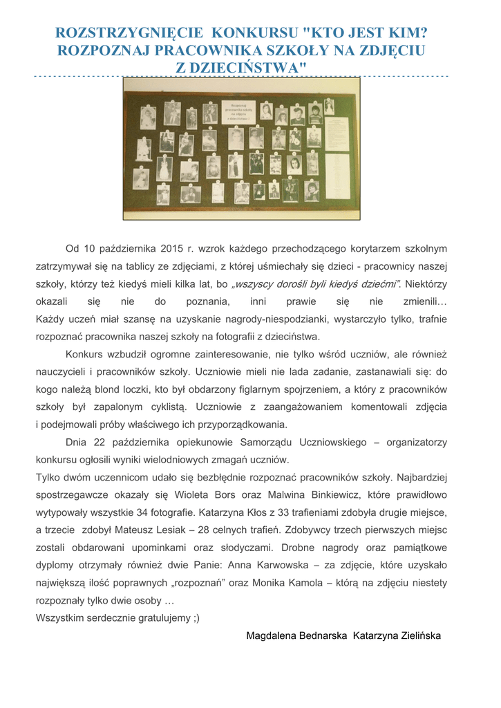 ROZSTRZYGNIĘCIE KONKURSU "KTO JEST KIM? ROZPOZNAJ PRACOWNIKA SZKOŁY NA ZDJĘCIU Z DZIECIŃSTWA" Od 10 października 2015 r. wzrok każdego przechodzącego korytarzem szkolnym zatrzymywał się na tablicy ze zdjęciami, z której uśmiechały się dzieci - pracownicy naszej szkoły, którzy też kiedyś mieli kilka lat, bo „wszyscy dorośli byli kiedyś dziećmi”. Niektórzy okazali się nie do poznania, inni prawie się nie zmienili… Każdy uczeń miał szansę na uzyskanie nagrody-niespodzianki, wystarczyło tylko, trafnie rozpoznać pracownika naszej szkoły na fotografii z dzieciństwa. Konkurs wzbudził ogromne zainteresowanie, nie tylko wśród uczniów, ale również nauczycieli i pracowników szkoły. Uczniowie mieli nie lada zadanie, zastanawiali się: do kogo należą blond loczki, kto był obdarzony figlarnym spojrzeniem, a który z pracowników szkoły był zapalonym cyklistą. Uczniowie z zaangażowaniem komentowali zdjęcia i podejmowali próby właściwego ich przyporządkowania. Dnia 22 października opiekunowie Samorządu Uczniowskiego – organizatorzy konkursu ogłosili wyniki wielodniowych zmagań uczniów. Tylko dwóm uczennicom udało się bezbłędnie rozpoznać pracowników szkoły. Najbardziej spostrzegawcze okazały się Wioleta Bors oraz Malwina Binkiewicz, które prawidłowo wytypowały wszystkie 34 fotografie. Katarzyna Kłos z 33 trafieniami zdobyła drugie miejsce, a trzecie zdobył Mateusz Lesiak – 28 celnych trafień. Zdobywcy trzech pierwszych miejsc zostali obdarowani upominkami oraz słodyczami. Drobne nagrody oraz pamiątkowe dyplomy otrzymały również dwie Panie: Anna Karwowska – za zdjęcie, które uzyskało największą ilość poprawnych „rozpoznań” oraz Monika Kamola – którą na zdjęciu niestety rozpoznały tylko dwie osoby … Wszystkim serdecznie gratulujemy ;) Magdalena Bednarska Katarzyna Zielińska